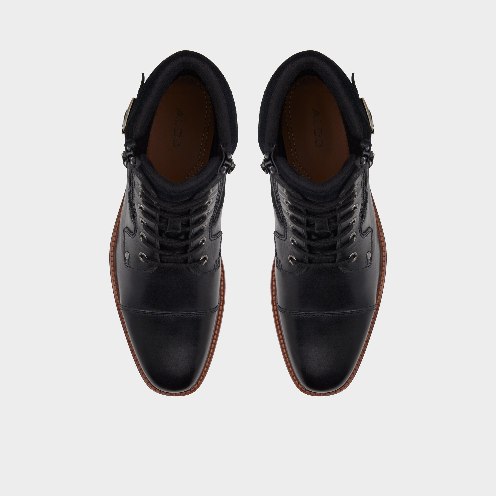 Contrasting smooth leather and suede define this black lace-up boot, highlighting a cap toe with buckle strap and a side zipper for easy on and off, while a lugged rubber sole keeps sure footing on any surface. Pair it with cuffed denim for nights out, or elevate wool trousers at the office for a polished boardroom moment.
