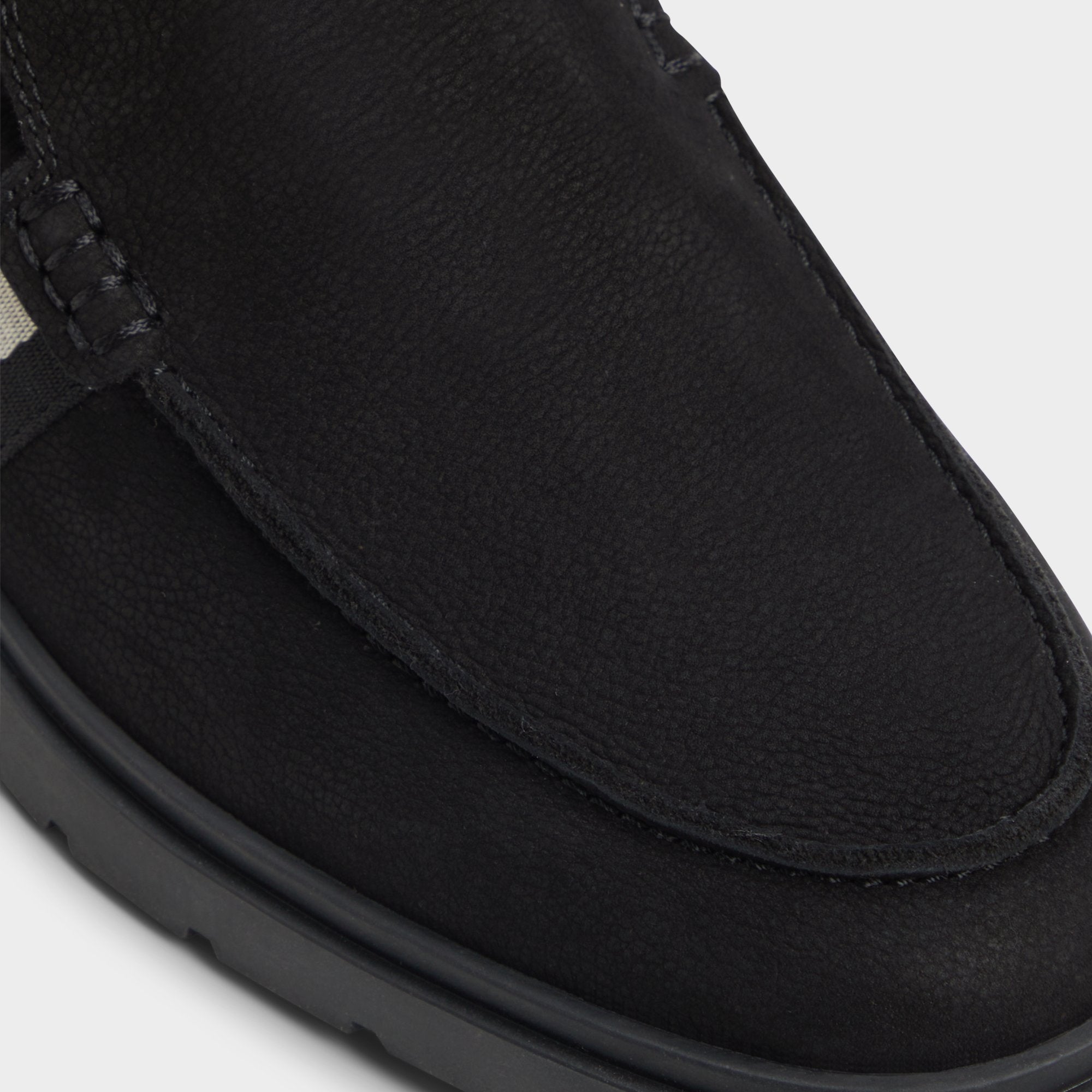 A stealthy grey side stripe breaks up the black textile upper while cushy lugged rubber soles deliver sneaker-level grip so you can dart from desk to drinks without second thoughts. Roll it with slim chinos for casual meetings or anchor faded denim shorts on seaside weekends-no socks required.