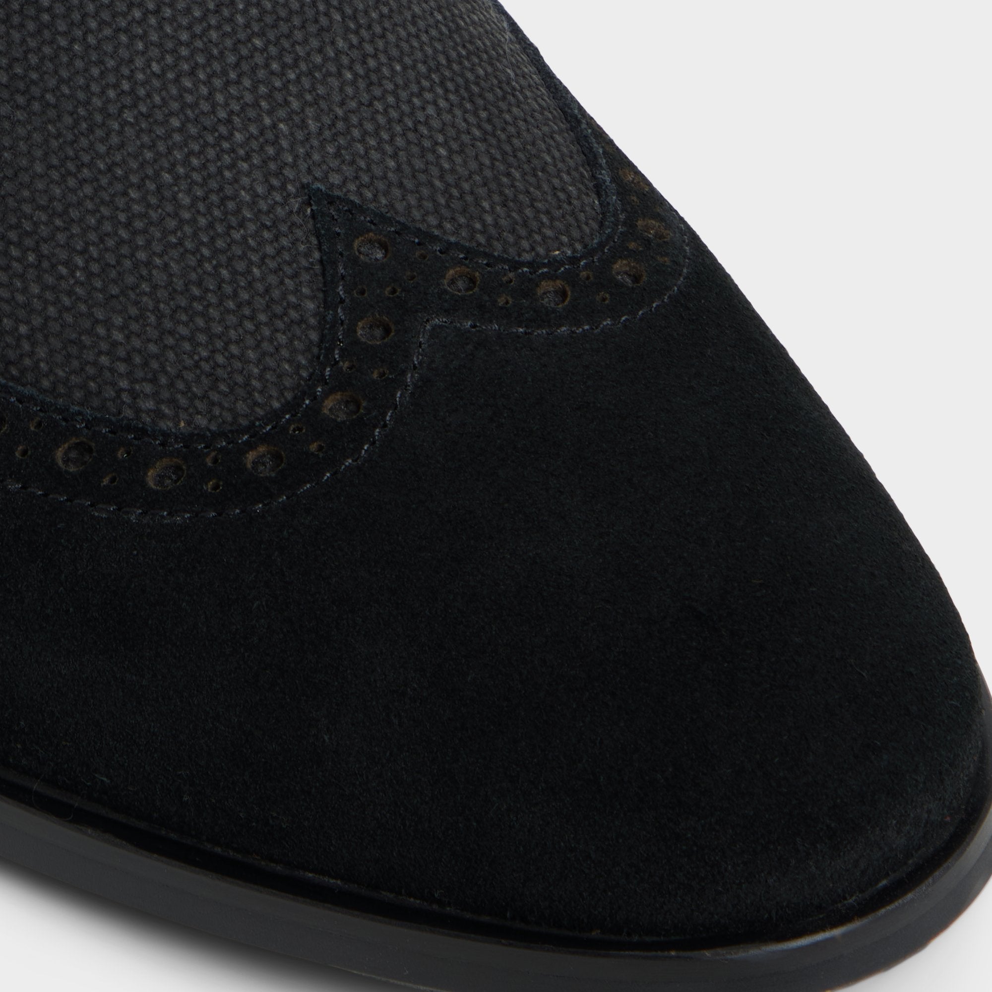 Suede wingtip overlays meet fabric quarters on this black Oxford, the contrast heightened by subtle punched brogue detailing and almond-toe lines that stay sharp yet relaxed through day-long wear. Pair it with charcoal tailoring for client meetings, or roll with dark denim on a weekend date night, and let the finish do the talking.