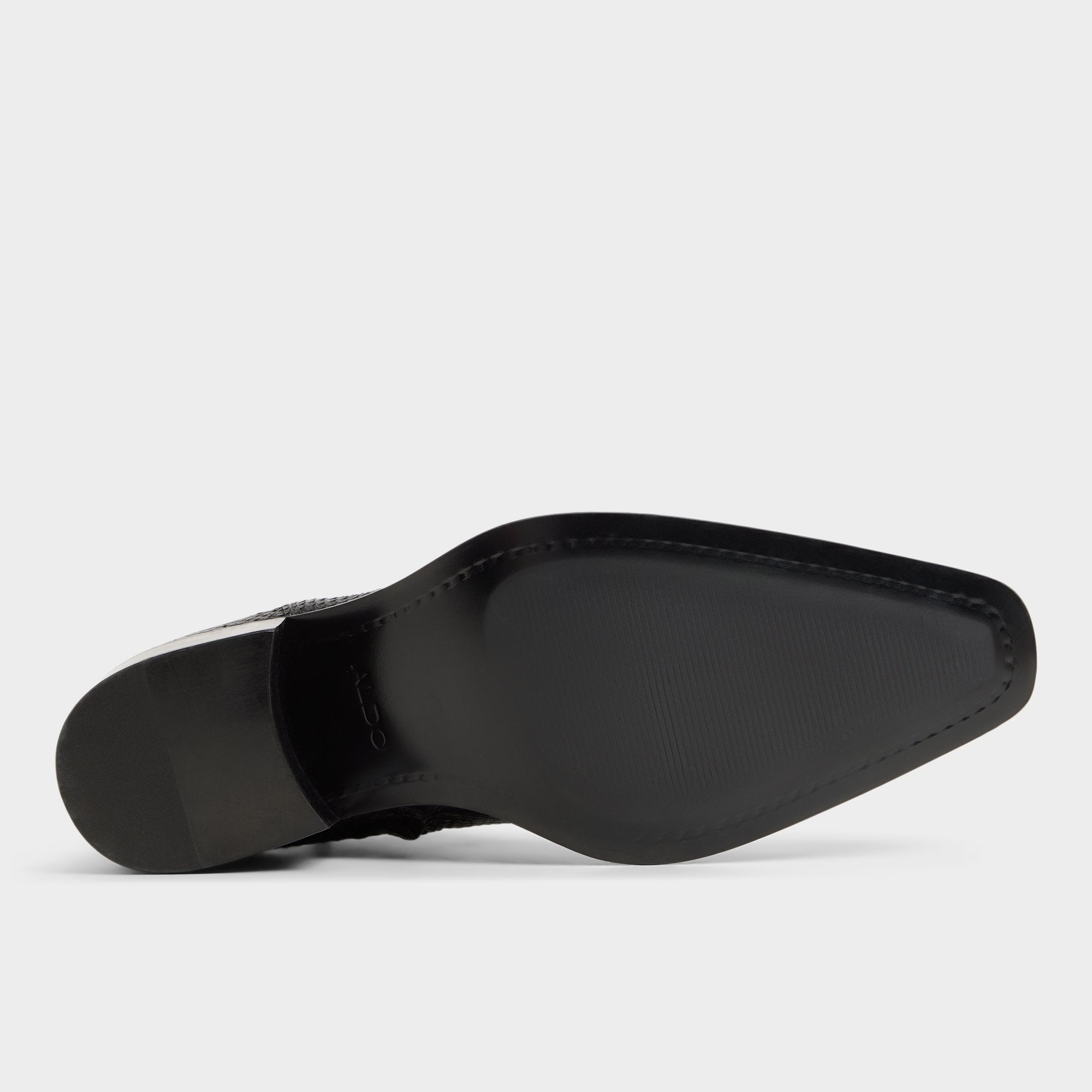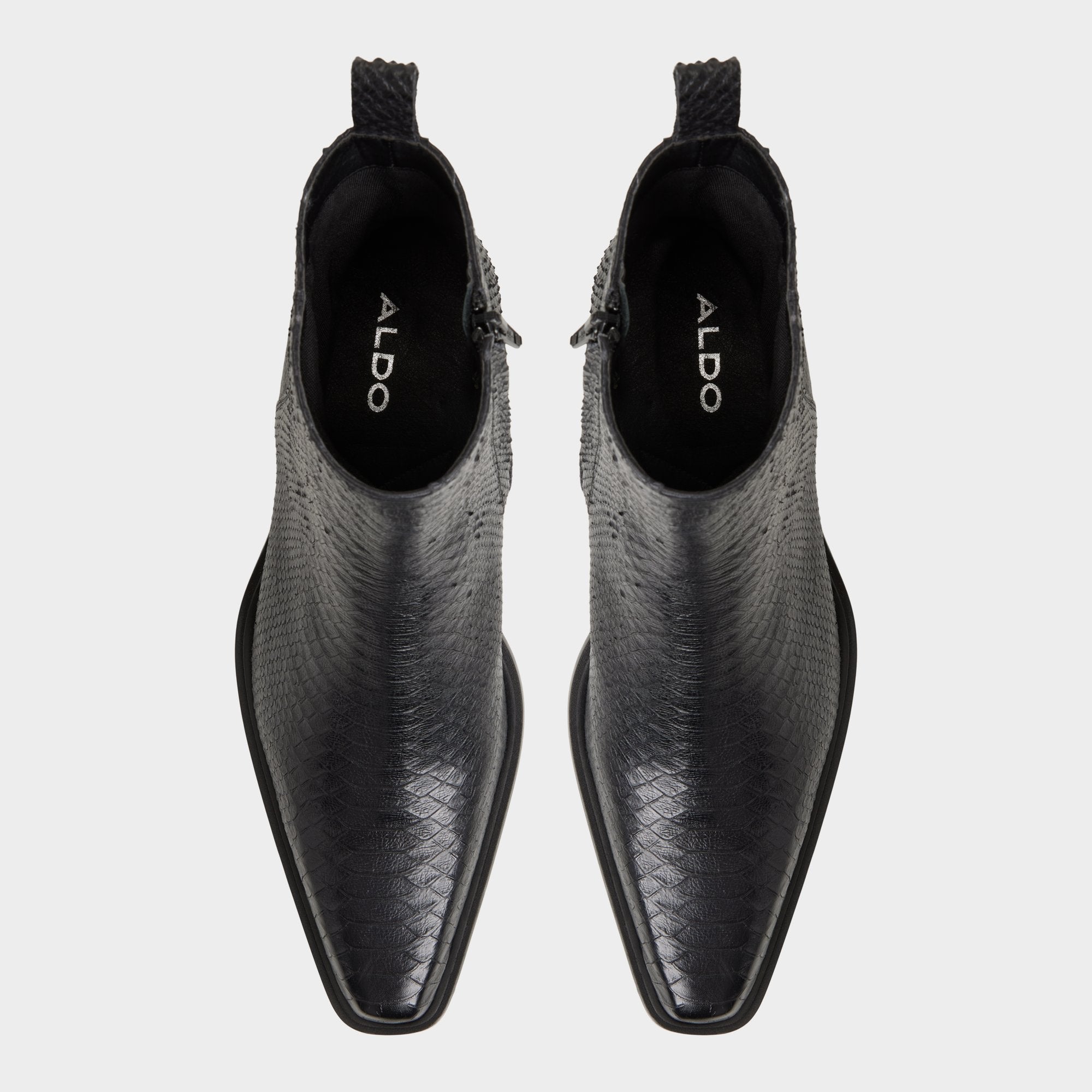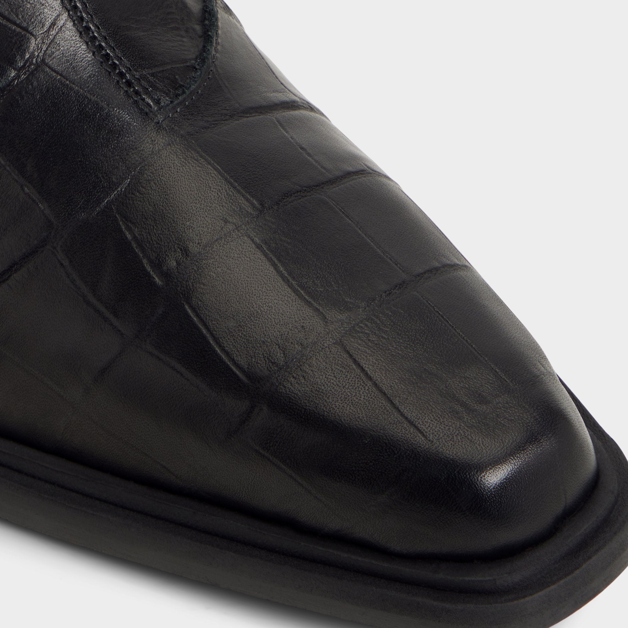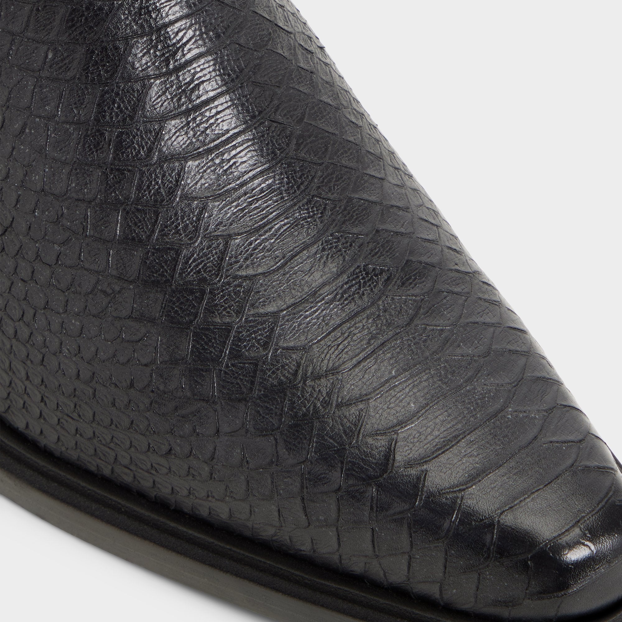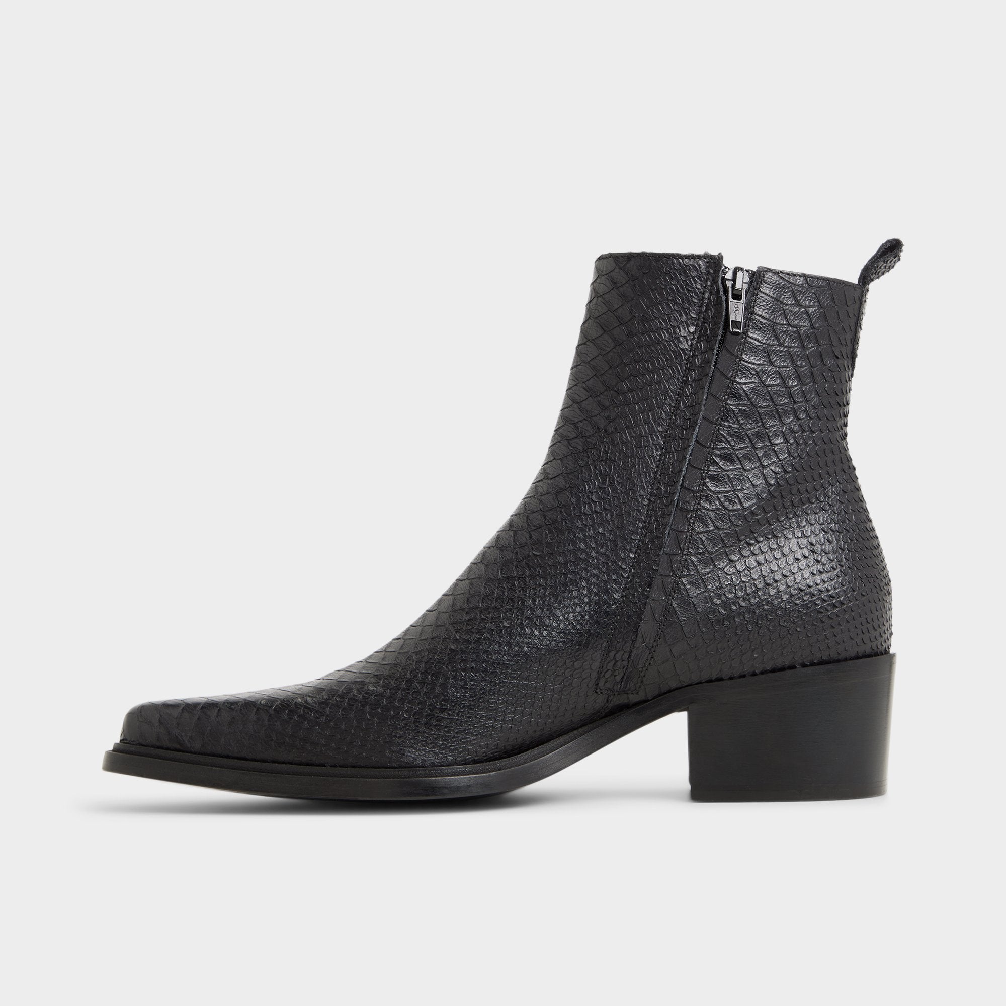Croc-embossed leather shapes this point-toe ankle boot, a silhouette with a block heel and a discreet elastic panel for easy on and off that travels city blocks with quiet confidence. Pair it with charcoal denim for gig nights, or anchor it with a tailored overcoat for rooftop cocktails.