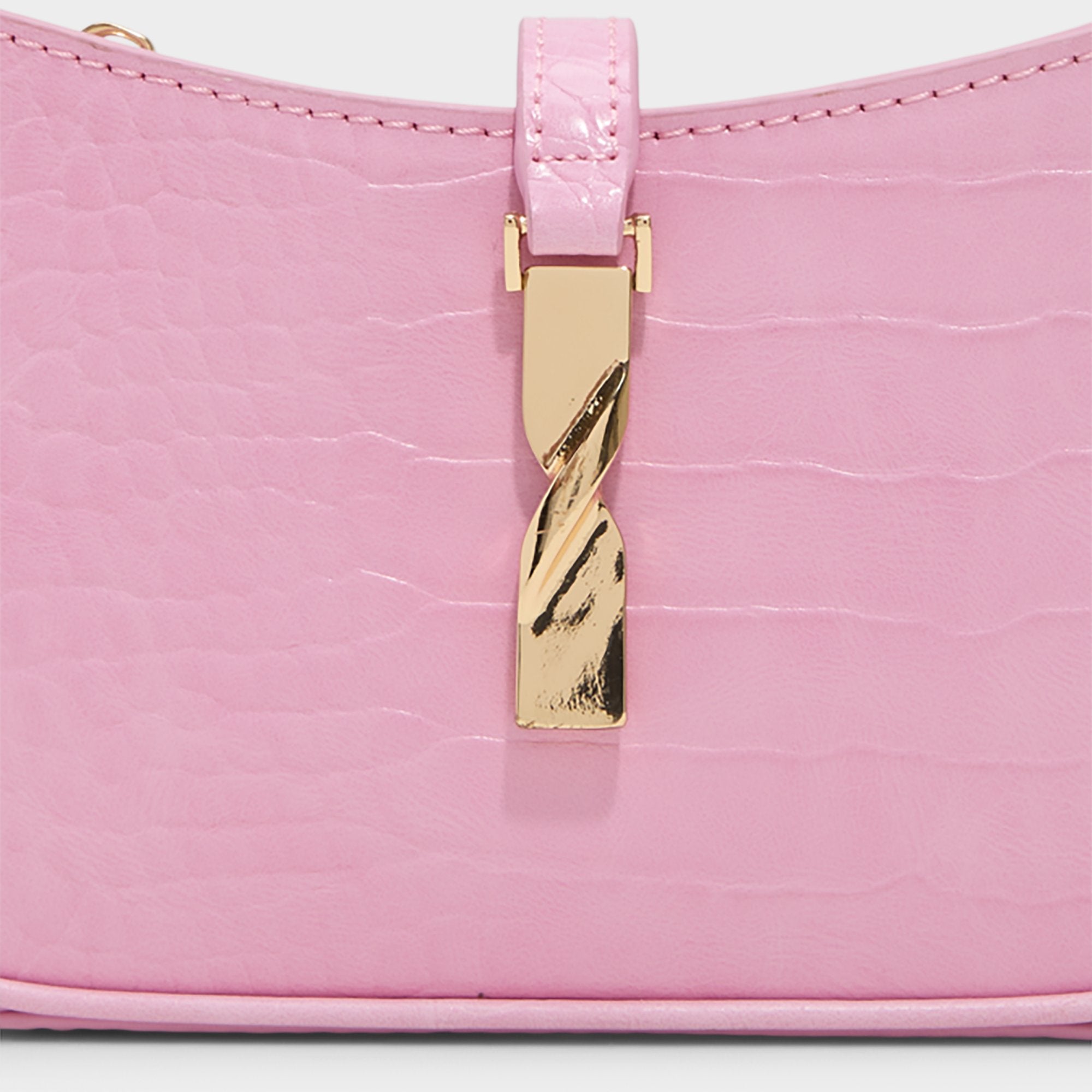 Bubblegum-pink croc emboss meets a sculptural gold bar clasp on this slim baguette, offering early-2000s nostalgia with grown-up confidence and hidden magnetic snap security. Tuck it under a blazer for coffee runs or sling it with a slip at rooftop parties to let the pink pop seal every look.