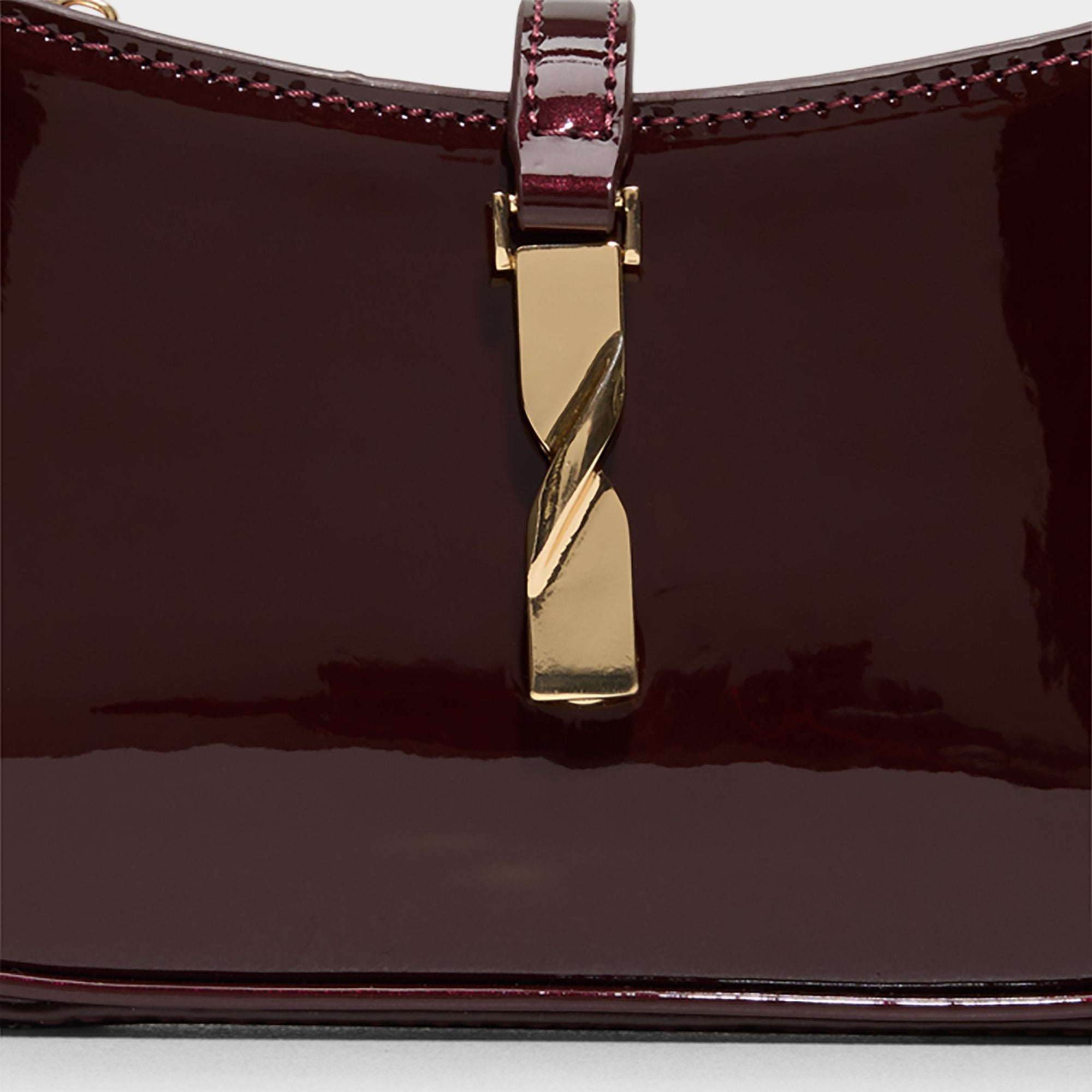 High-gloss espresso-dark patent leather coats a compact shoulder bag, delivering a ’90s silhouette with sculpted golden twist bars that snap magnetically shut over a clean, confident frame for city nights and rooftop chic. Carry it with satin slips for rooftop cocktails, or sling it over denim at galleries to finish the look with quiet confidence.