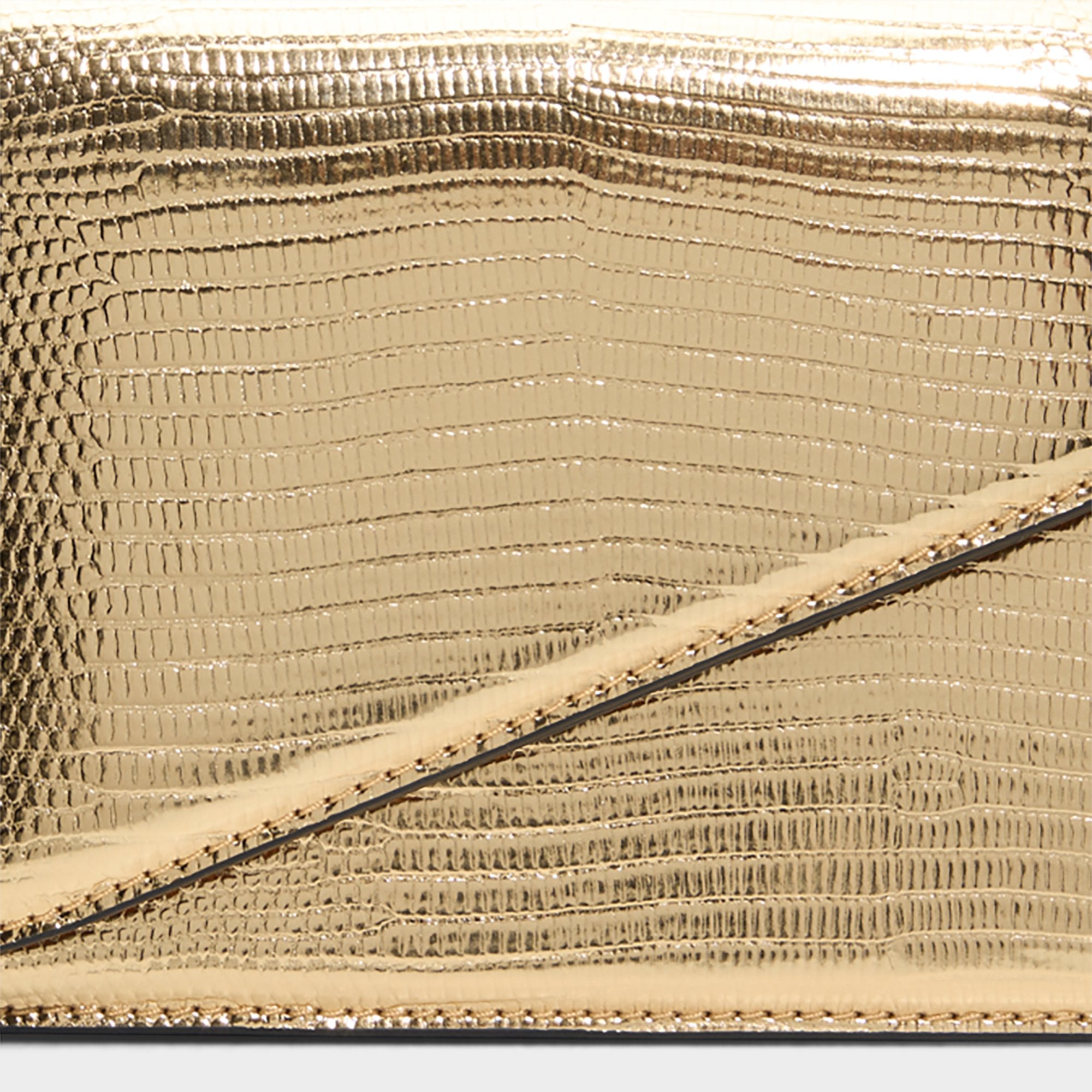 Molten lizard-embossed golden surface captures the light, while the trapeze silhouette, fastened with a seamless magnetic closure, ensures your cards and essentials are secure. Carry it gracefully by its knotted handles or tuck it under your arm for an effortlessly chic look at any post-sunset event.