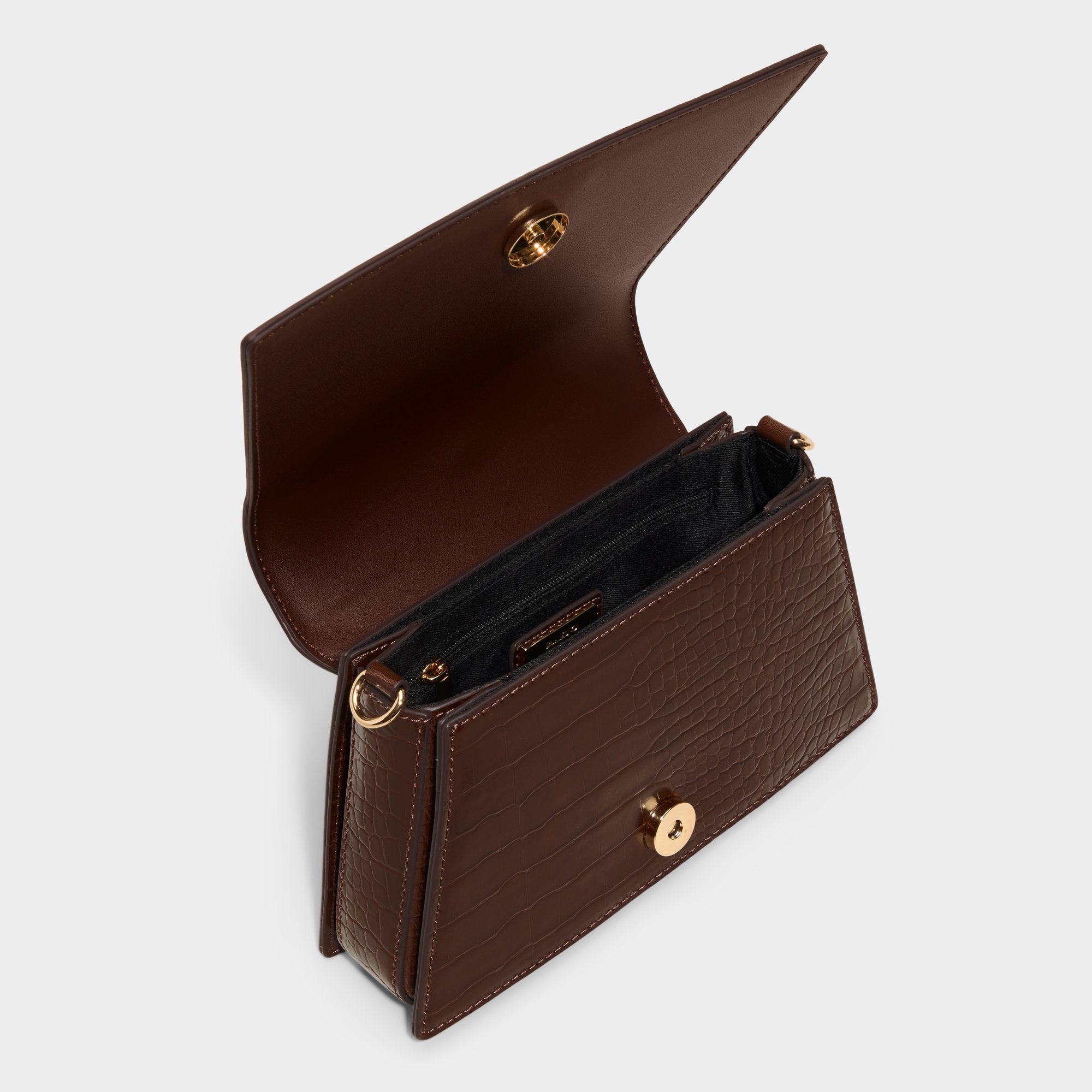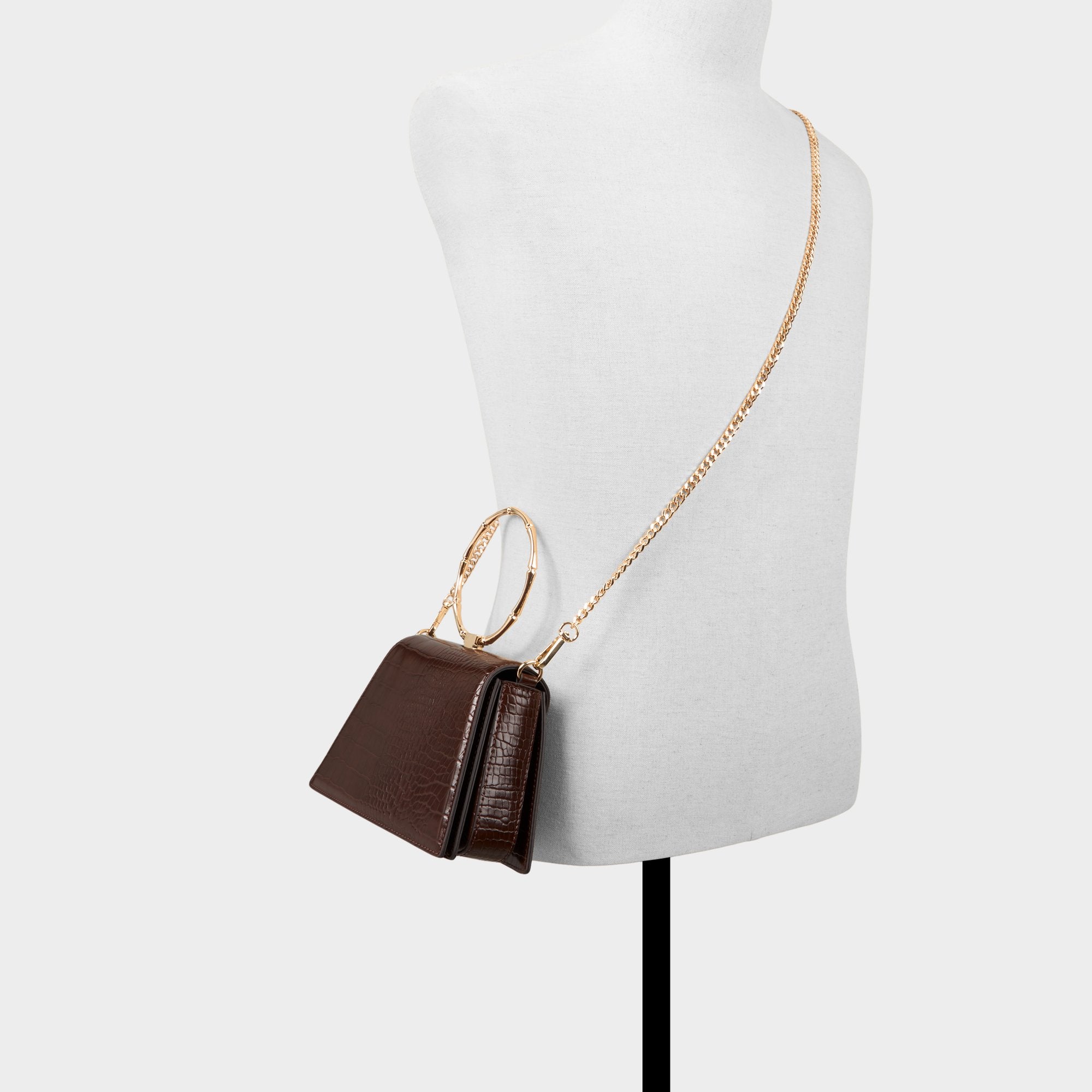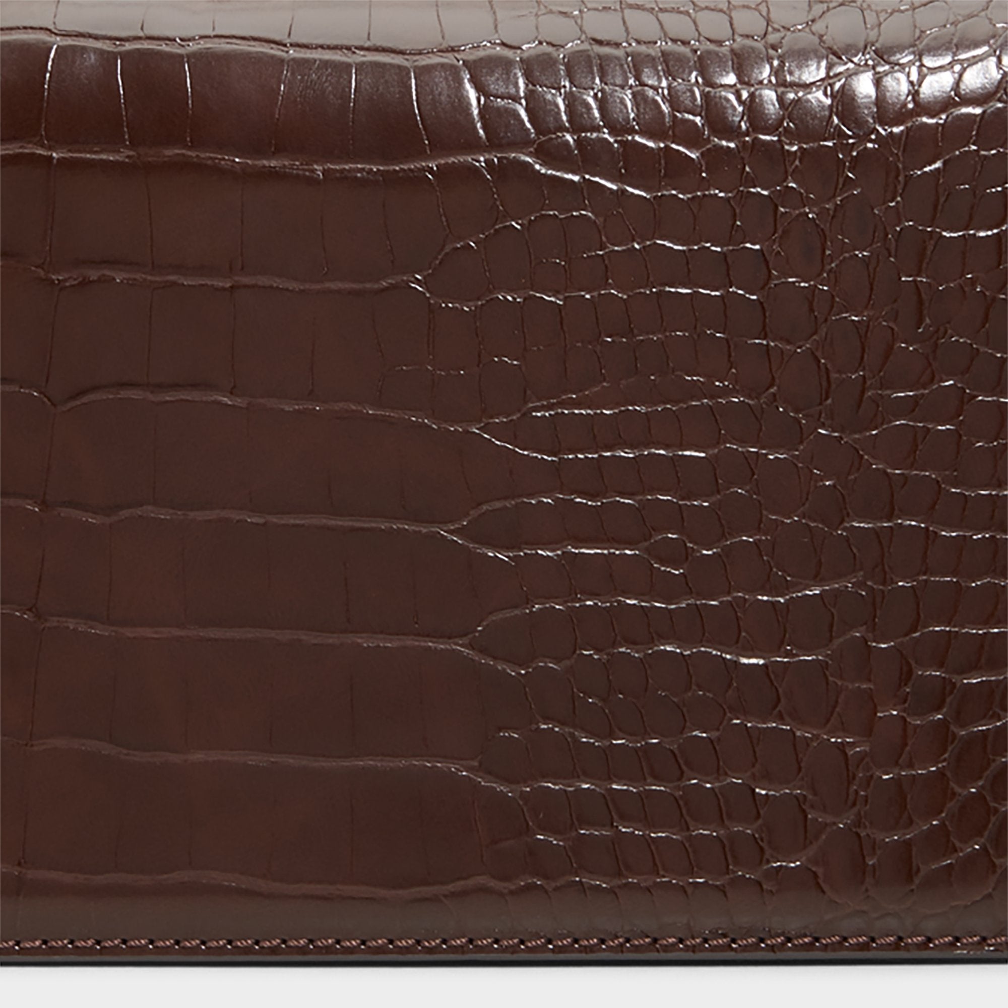 Bamboo-inspired ring handle crowns this rich espresso croc-emboss leather bag, adding jewelry-like shine to every gesture while the trapezoid silhouette keeps essentials neatly tucked for spontaneous city moments on weeknights and weekend adventures. Carry it with a satin slip for rooftop dinners or tuck it under a blazer-and-jeans combo for coffee catch-ups, sealing the look with understated polish.
