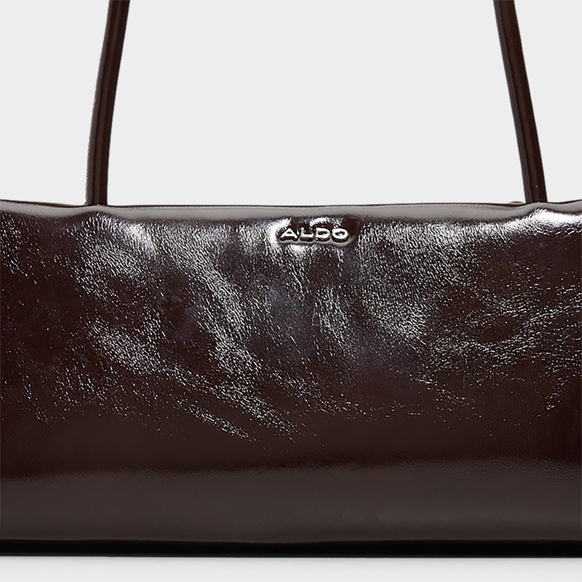 Espresso-brown leather stretches into a slim baguette form with a soft shine and a gleaming silver-tone zip, delivering low-key luxury that hugs the silhouette beneath the arm. Carry it to a night out with a sleek dress, or tuck it beside a blazer on a polished coffee run to finish the look with quiet confidence.