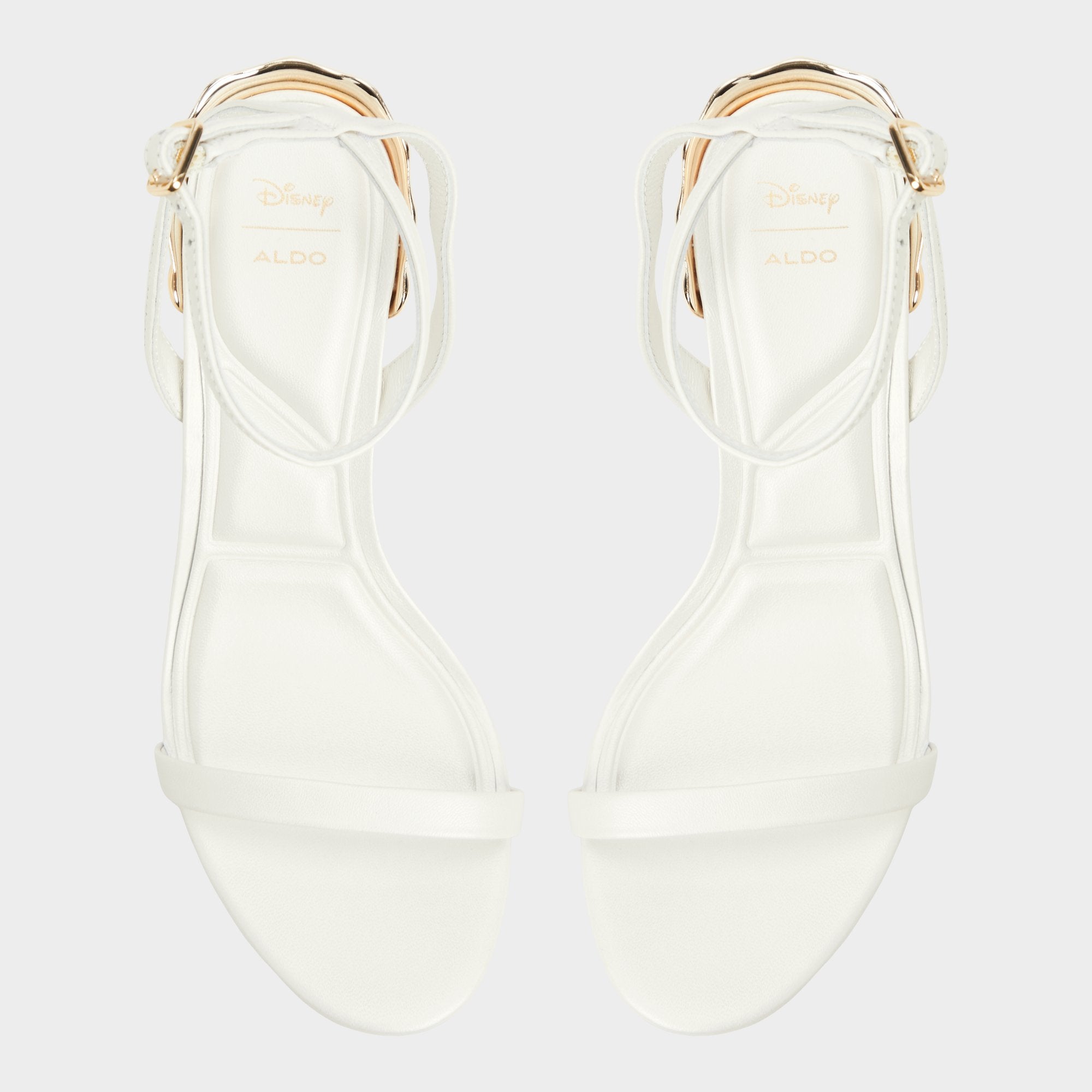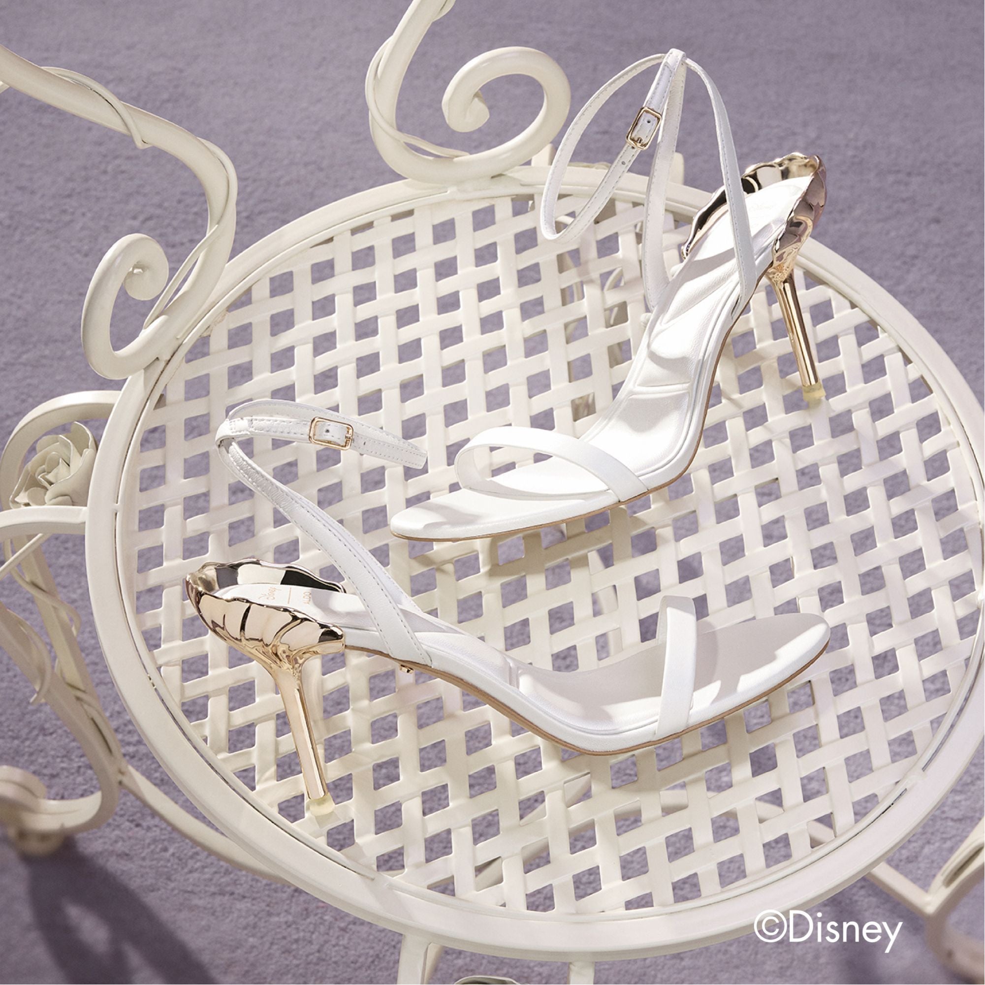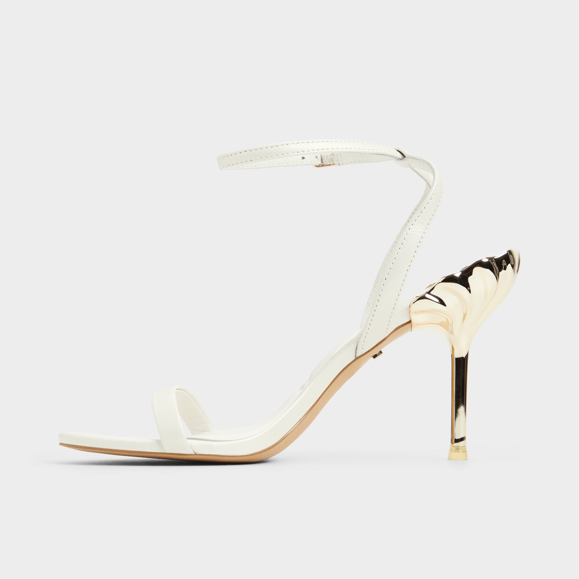One step closer to Ariel’s dreams, these ocean-inspired stiletto sandals were made to make waves. The gold shell design on the heel pairs elegantly with the dainty white leather ankle strap, a style to be treasured.