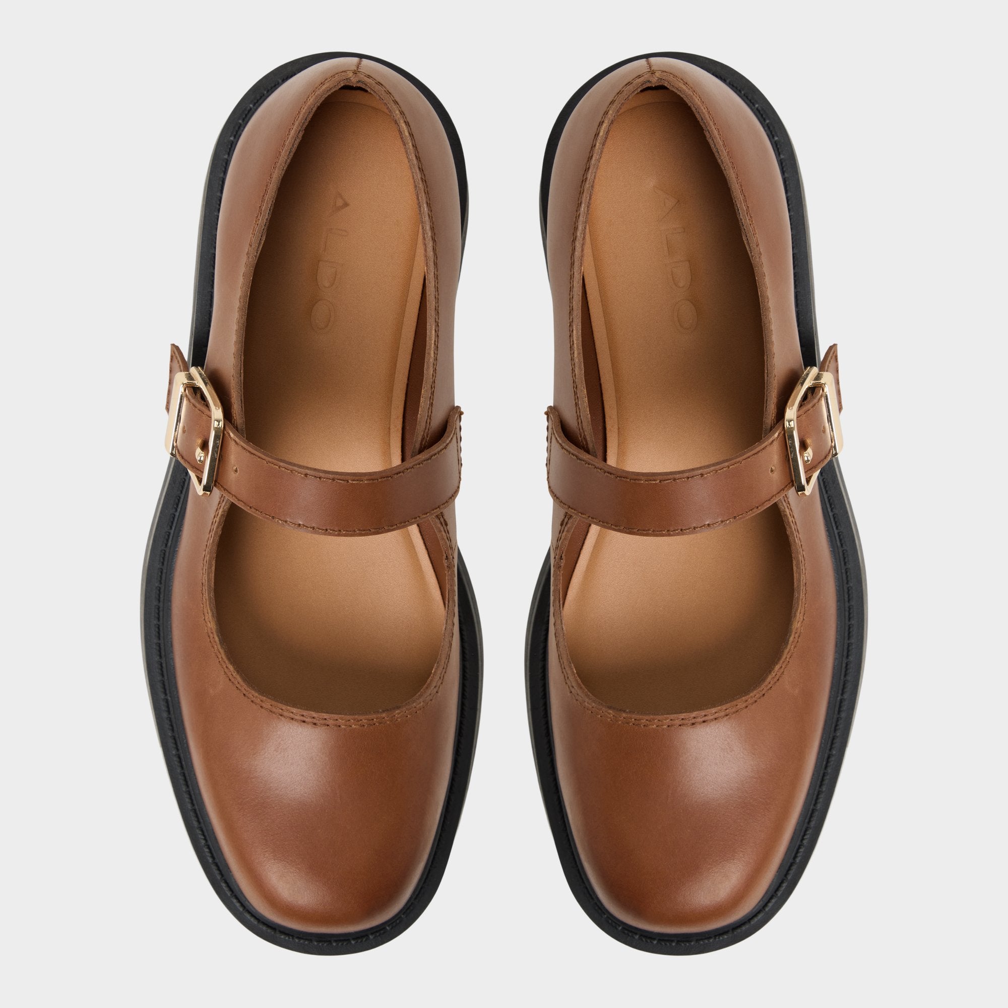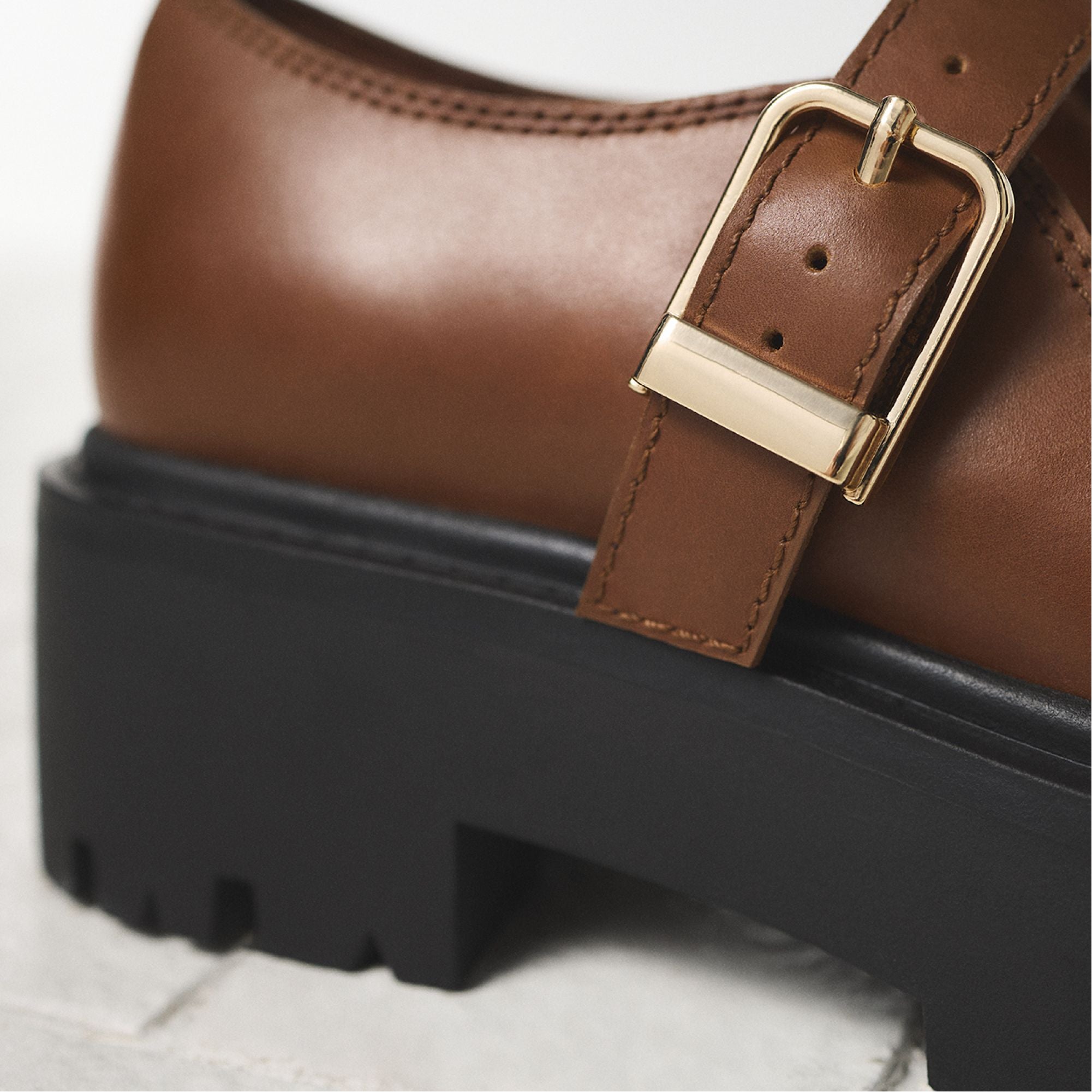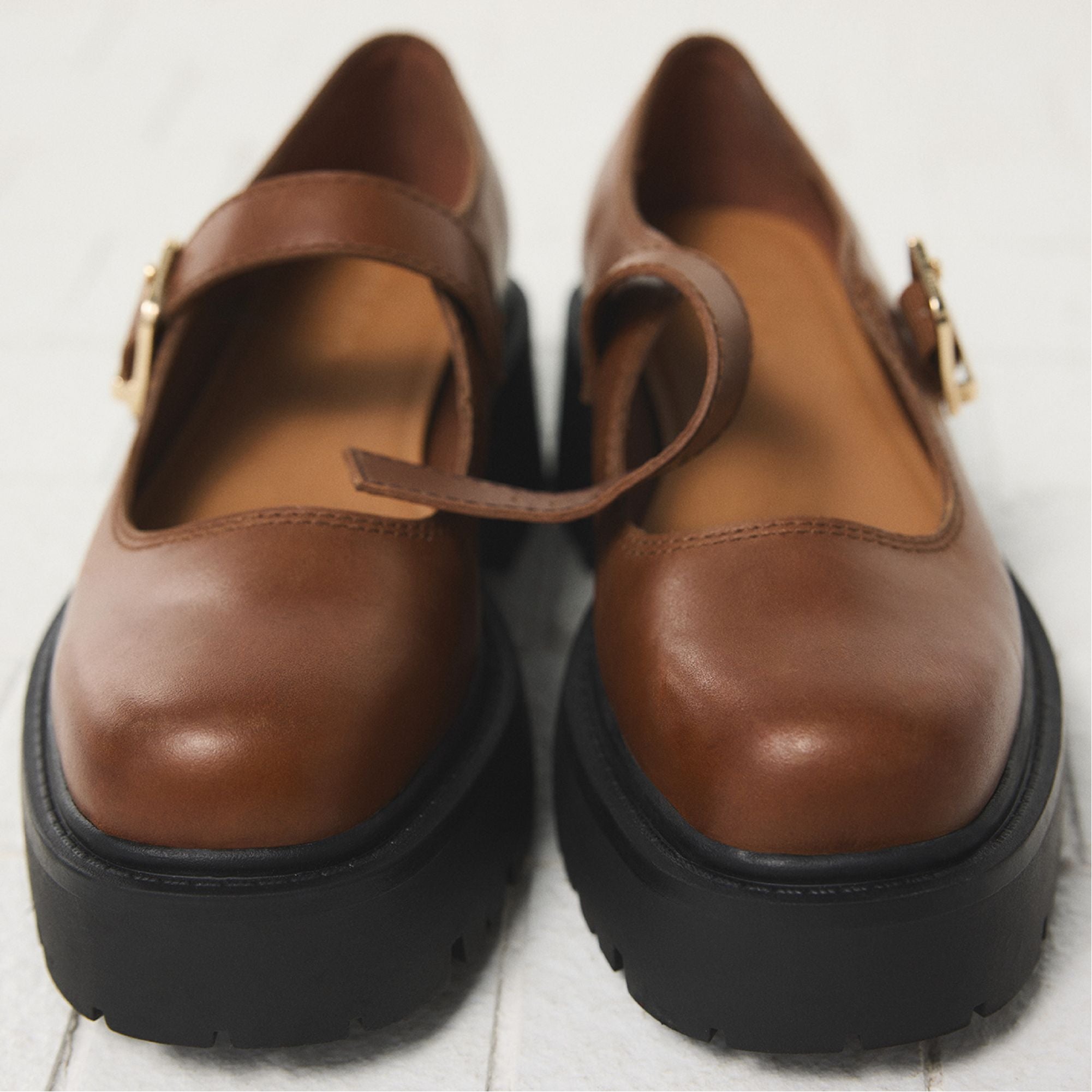 Chunky lug sole meets smooth leather in a modern Mary Jane, with a gleaming gold-tone buckle that polishes every city-block stride and a platform that elevates height with confident, walkable stability. Pair with frayed denim for record-store detours, or swap in a pleated mini and slouchy sweater when lecture halls lead to coffee dates.