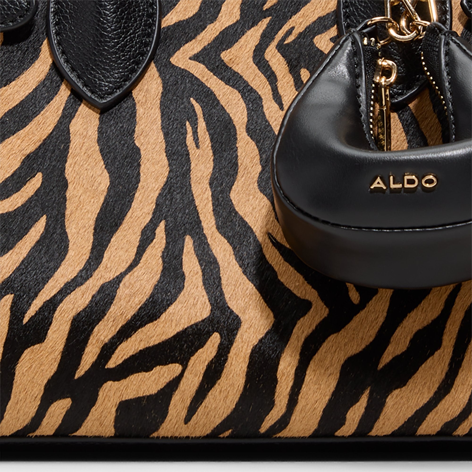 Tiger-stripe paneling gives this structured tote a bold stride, while sleek black handles frame a palm-sized pouch charm that snaps off for quick cash and tech essentials on the go. Carry it with a sharp blazer and tailored trousers for the boardroom, or sling it over weekend denim for casual city strolls.