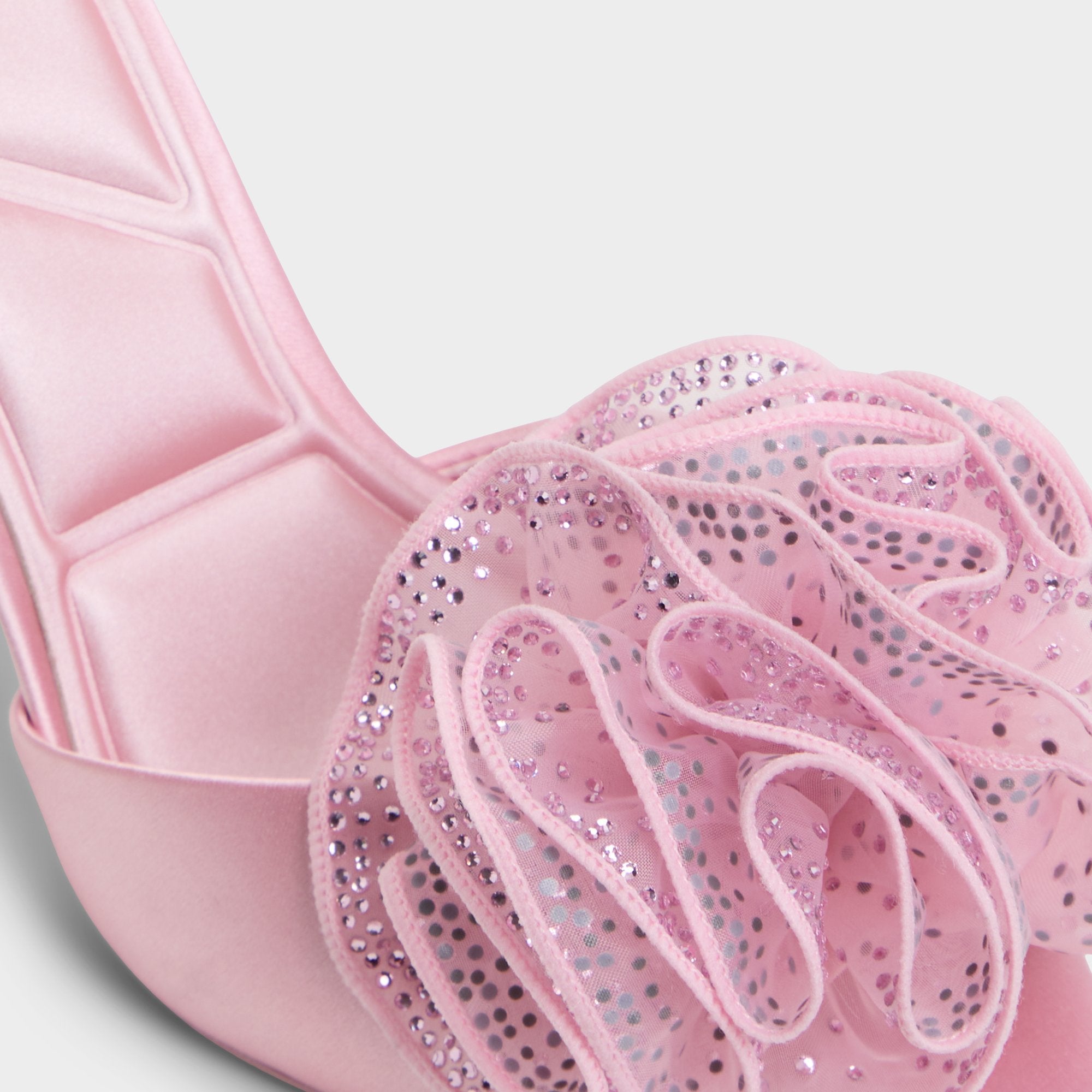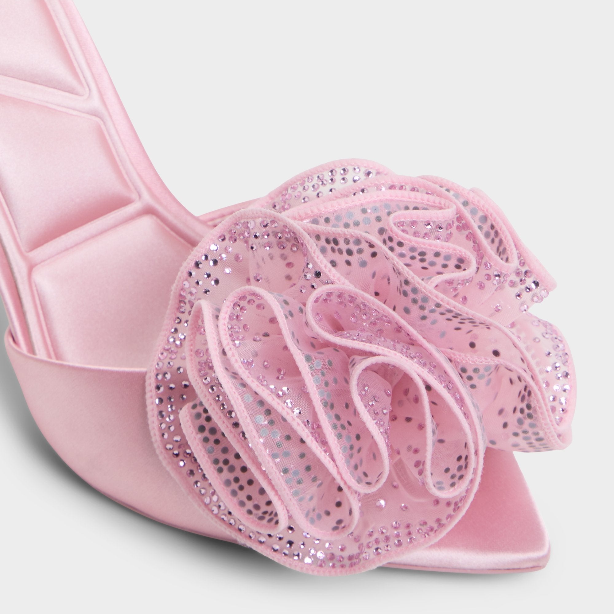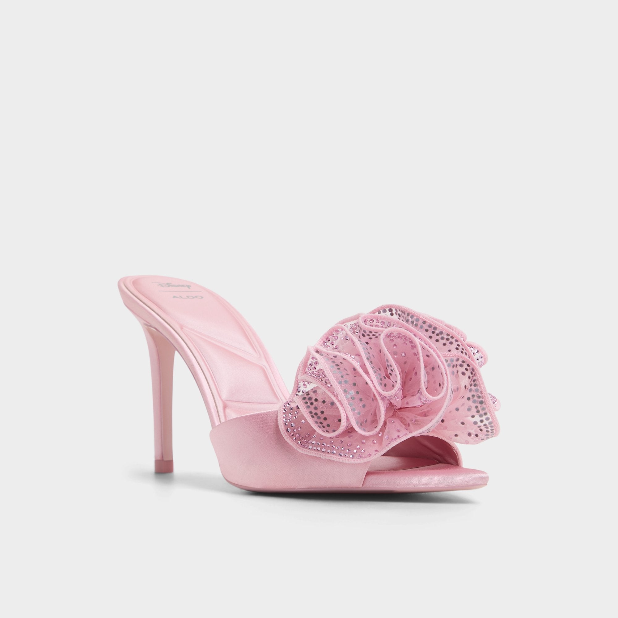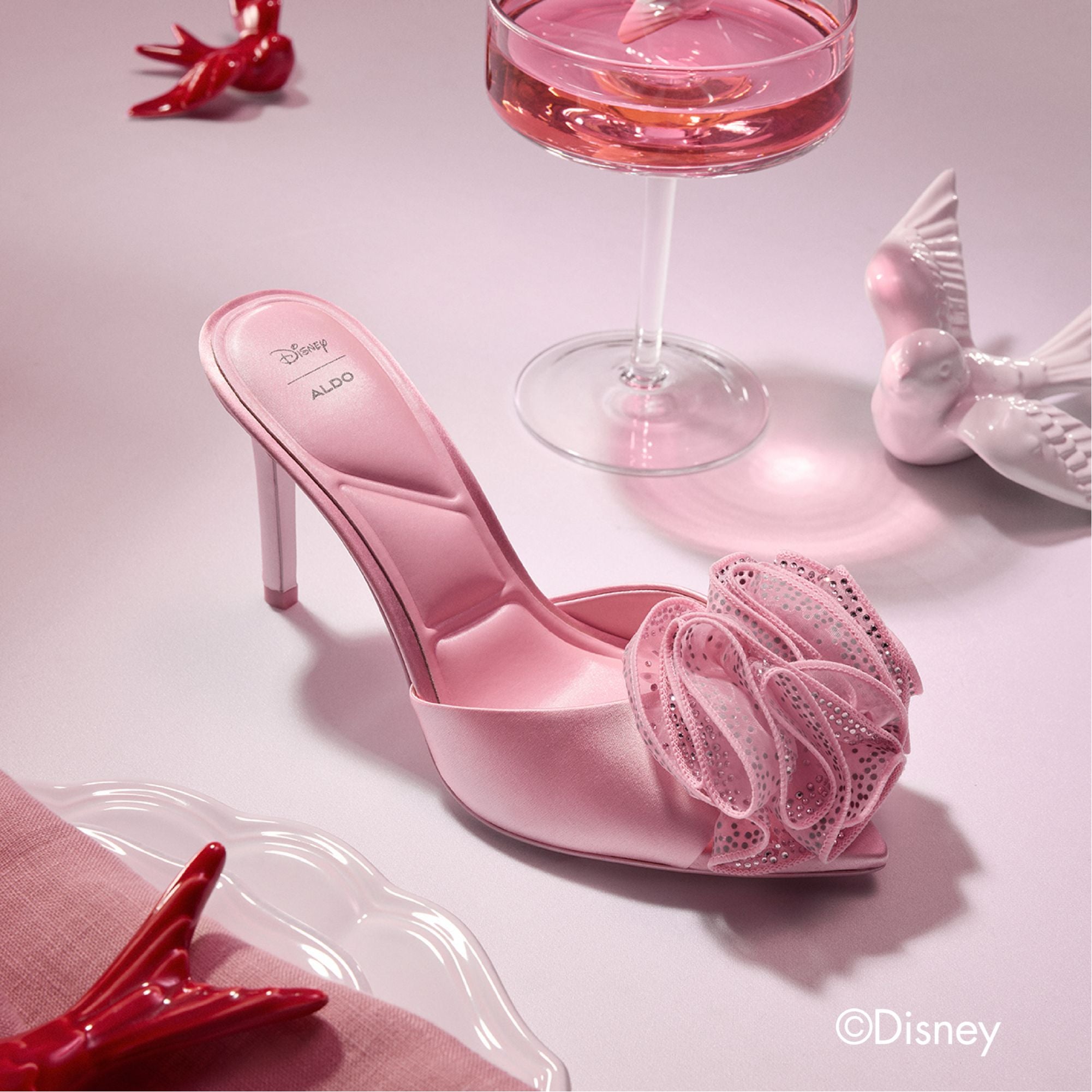 Don’t sleep on these beauties. Pretty in Aurora’s signature pink, these satin heeled mules are adorned with a soft, romantic rose and subtle rhinestones, perfect to finish any fairytale look.