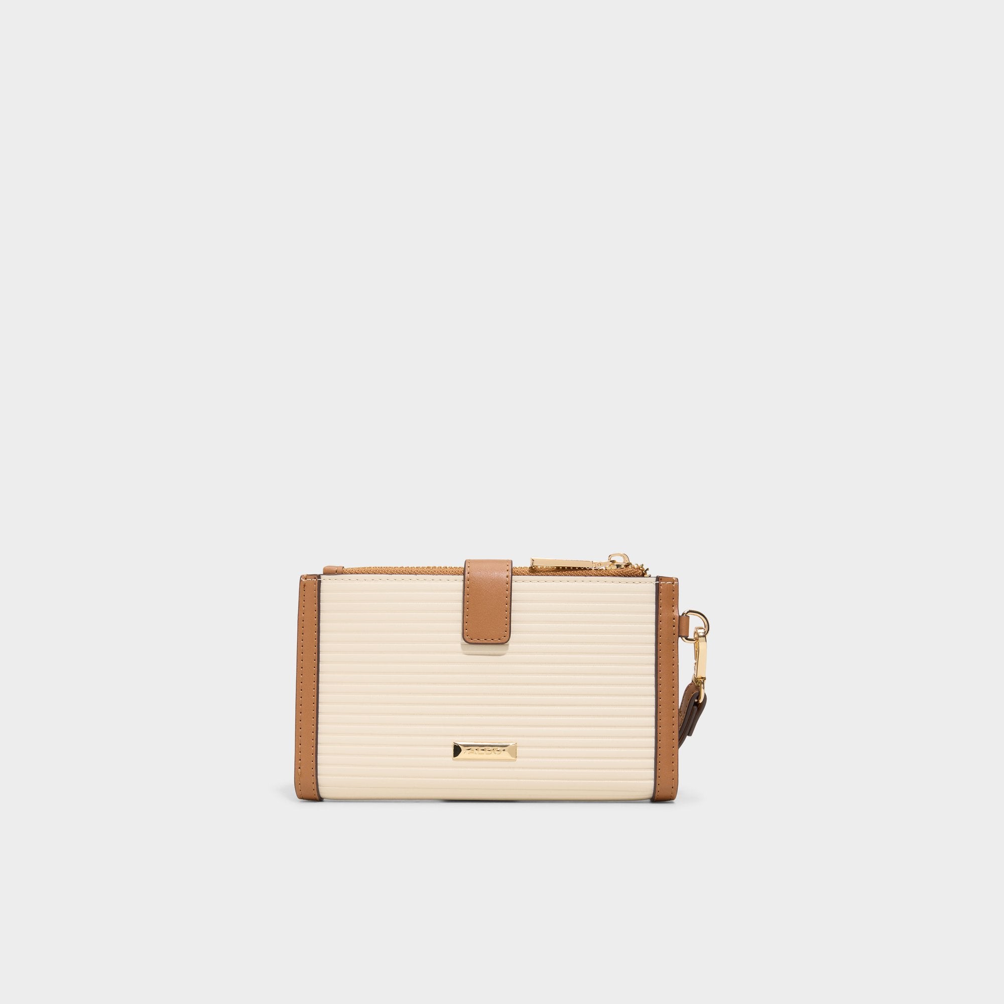 Ribbed ivory panels bordered by caramel trim and tiny gold studs give this compact wristlet a sleek travel-case feel, while the clip-off strap converts it from hands-free dash to polished clutch quickly. Clutch it for latte runs with joggers, or tuck it inside a tote for evening dinners when all you need is the essentials.