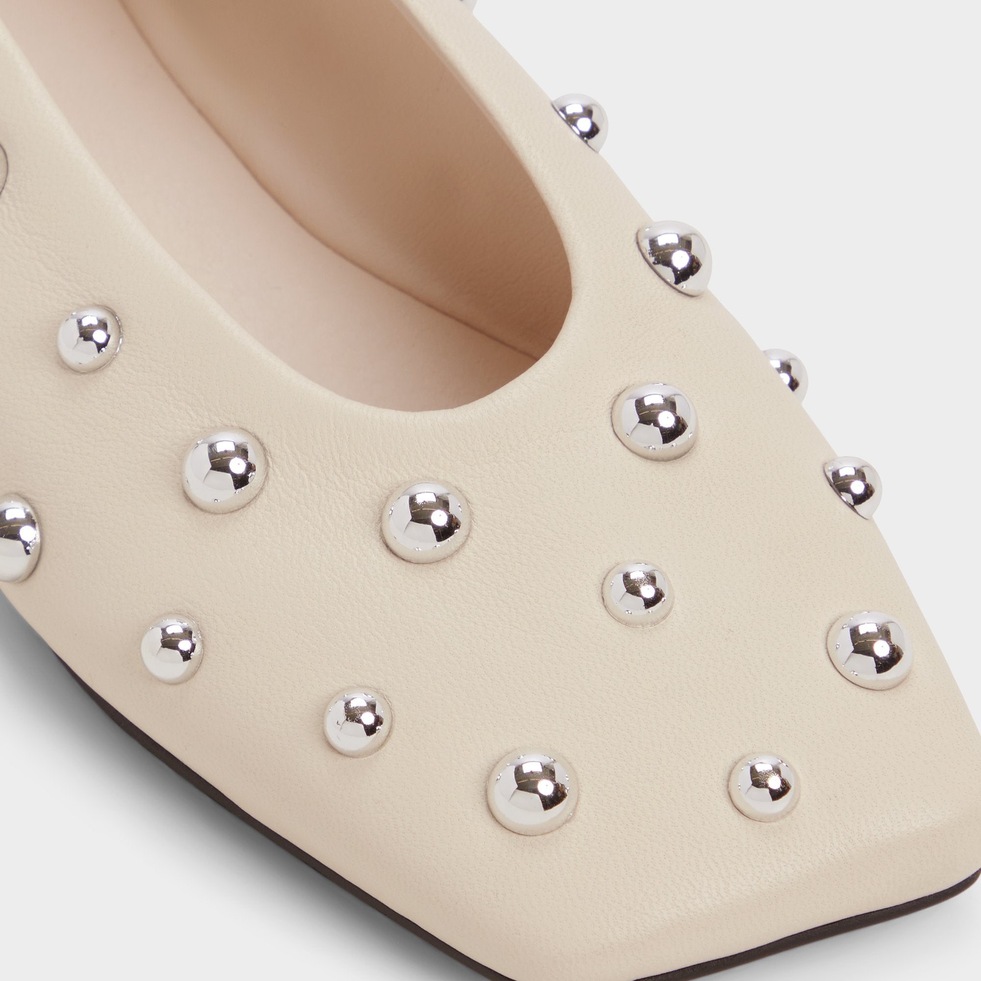 Silver-tone studs gleam across buttery leather, turning this sleek flat into a city-night moment, while an adjustable ankle strap keeps each step secure on a flexible rubber sole designed for all-day city sprints. Pair with cropped denim for catch-ups, or anchor a satin slip for rooftop celebrations.