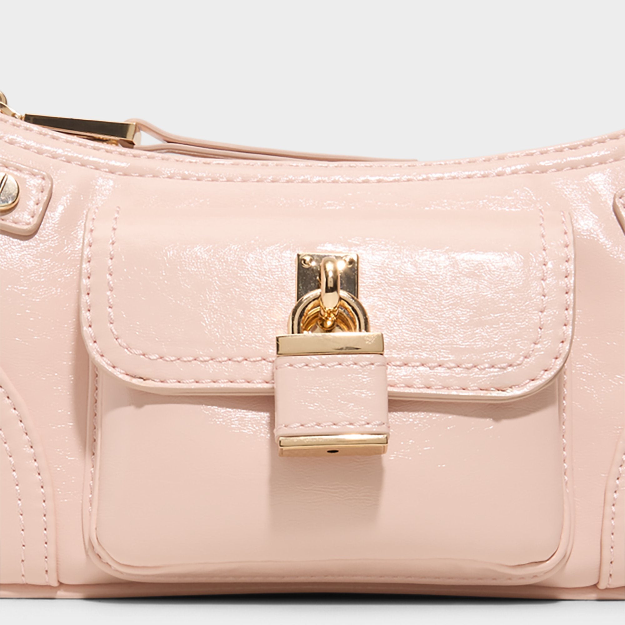 Glossy blush patent panels catch the light as a curved strap loops around a statement padlock, turning this slim baguette into a note of city polish you can carry from morning meetings to after-hours mingling. Pair it with wide-leg denim for errands or with a satin mini at parties, finishing a look that’s polished for any moment.