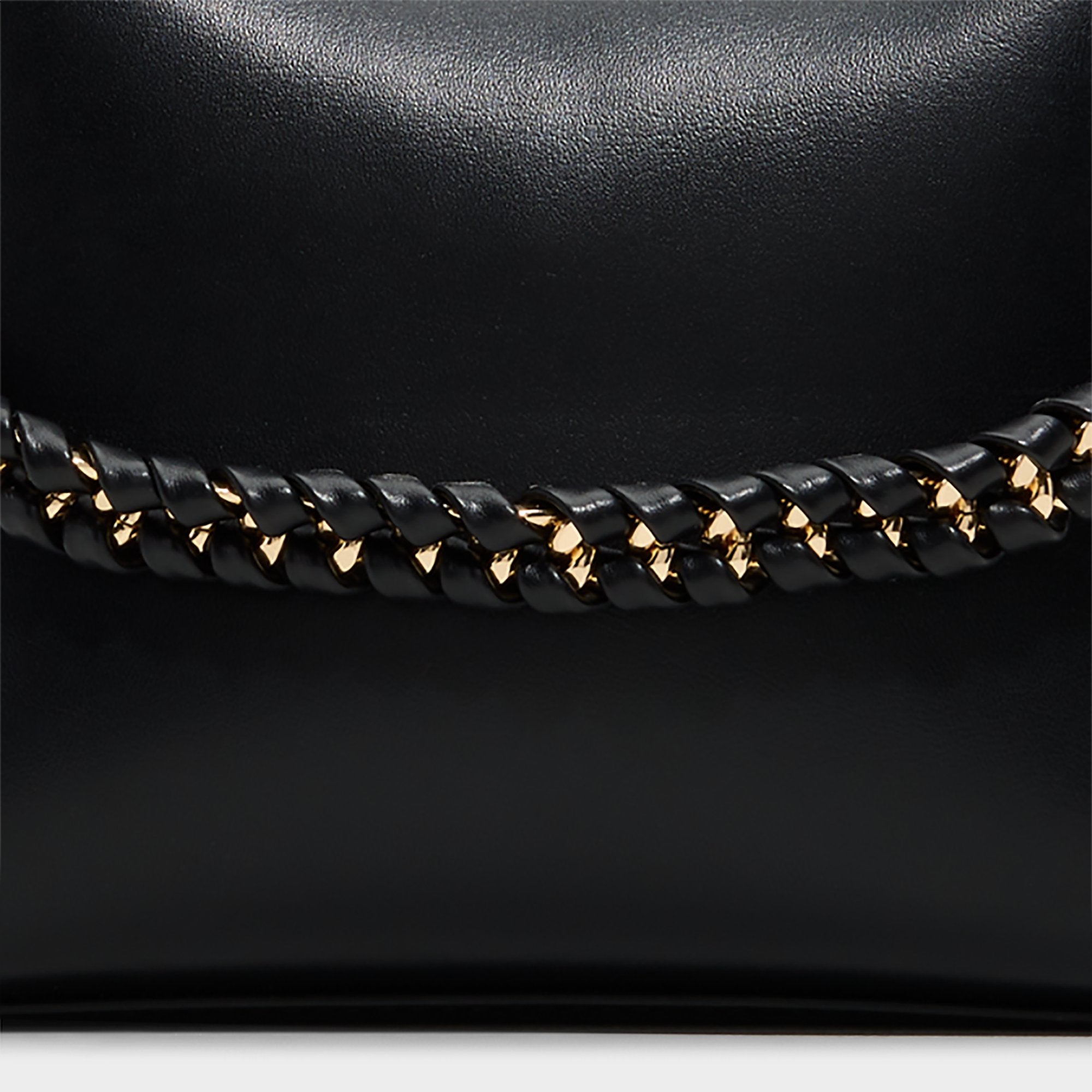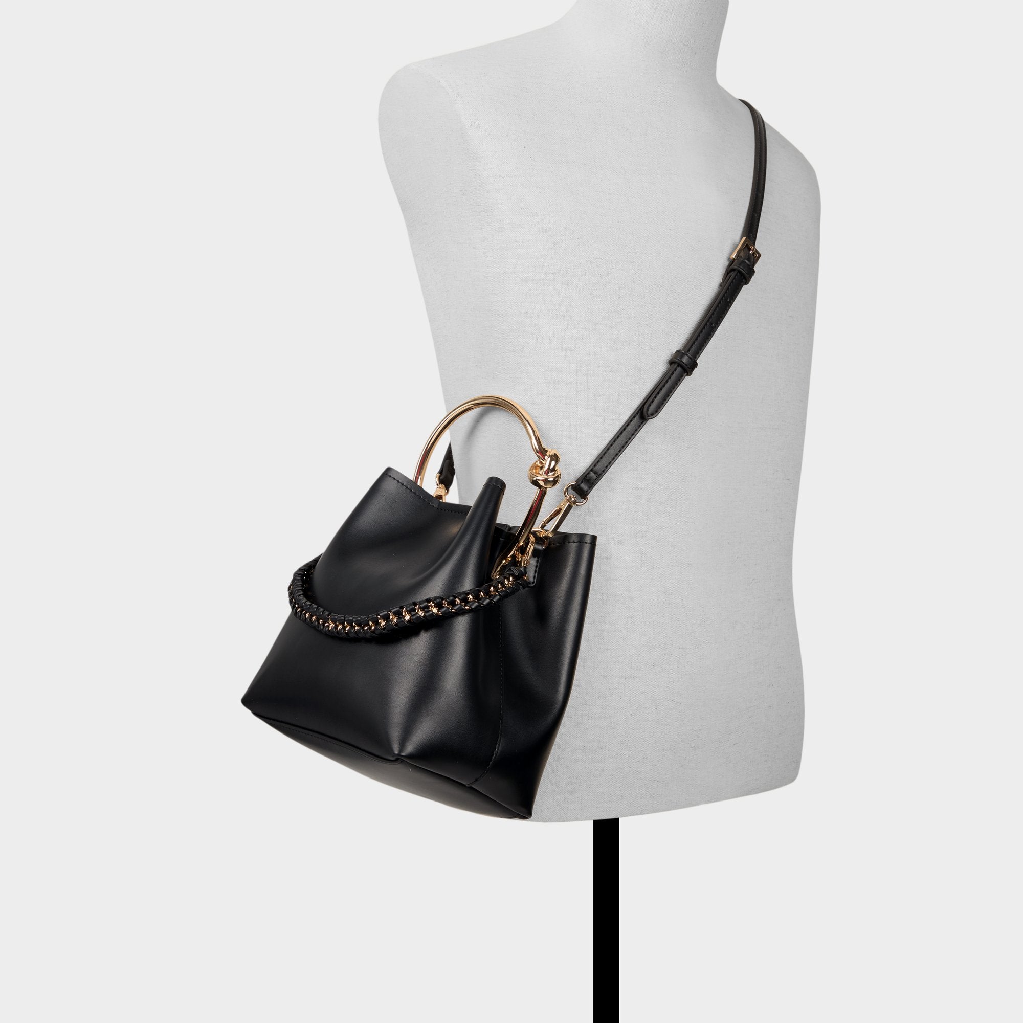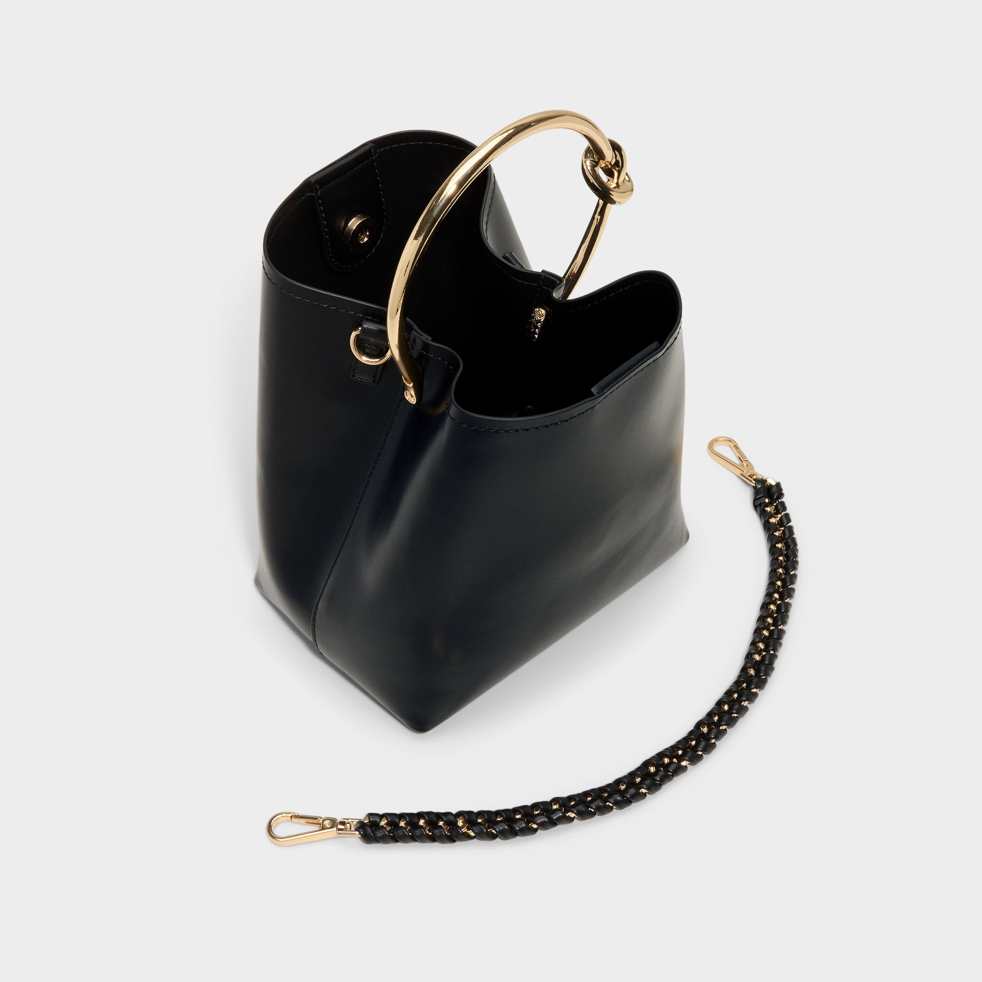 Midnight leather forms into a petite bucket shape, highlighted by a braided chain and a gleaming gold ring handle, delivering a refined, wanderer-chic silhouette that feels at once timeless and ready for city nights. Carry it to rooftop dinners, or tuck it under an oversized blazer for coffee runs.