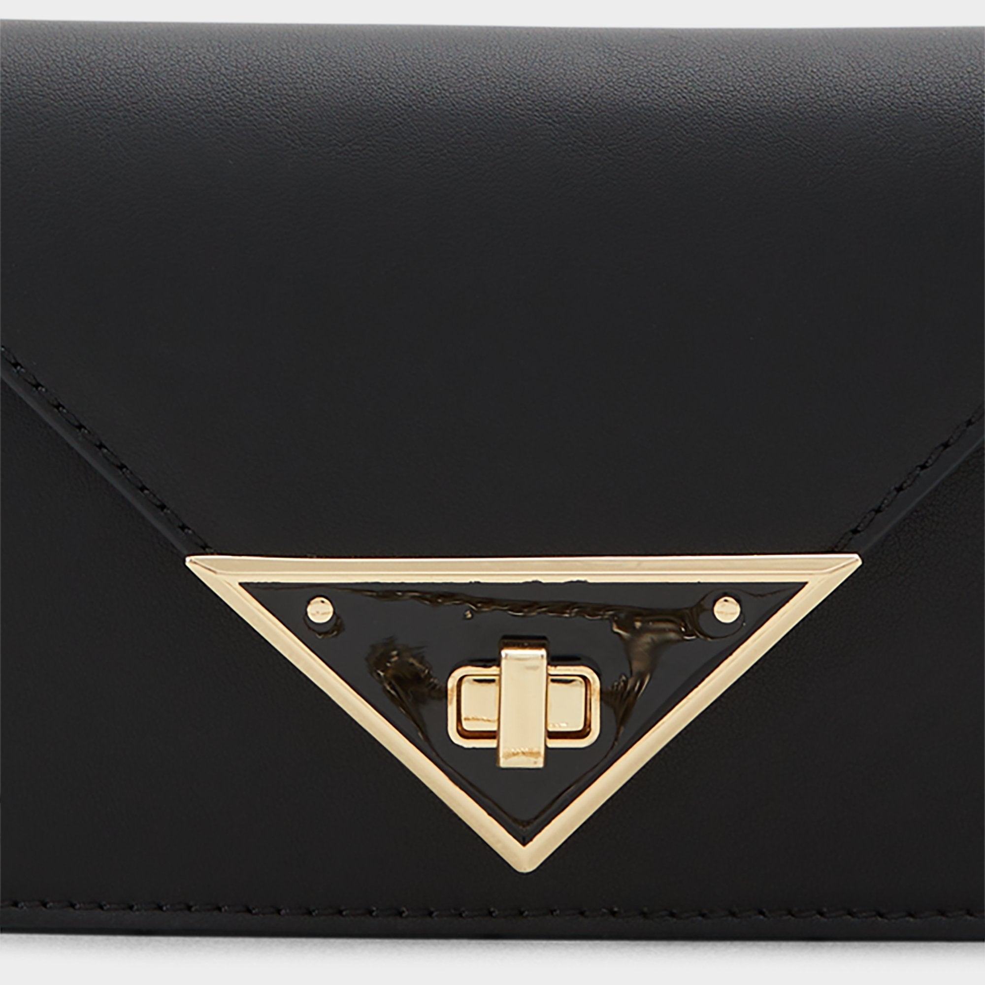 Jet-black leather folds into an envelope silhouette, its geometric gold twist-locks adding a touch of polish to after-dark looks that catch the light at midnight cues and glide from desk to dinner with quiet confidence. Carry it with a satin slip for moonlit dinners or sling it with vintage denim for a downtown night out.