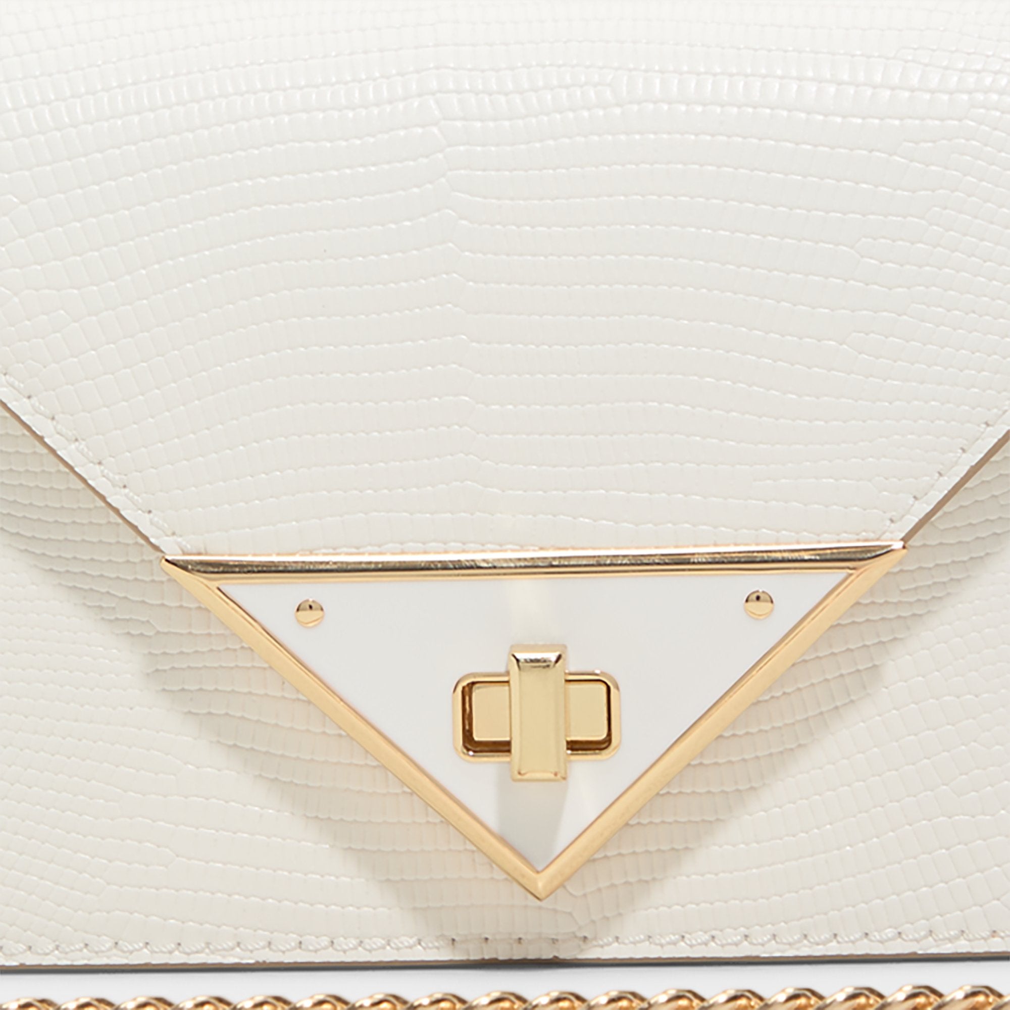 Pearl-white envelope clutch glints under soft light, its subtle lizard-skin texture lending a luxe feel, while a gilded turn-lock and delicate chain promise hand-to-shoulder grace for evenings that swing from cocktails to city lights. Carry it with a satin slip dress for cocktails or tuck it beneath a blazer and jeans for chic city evenings.