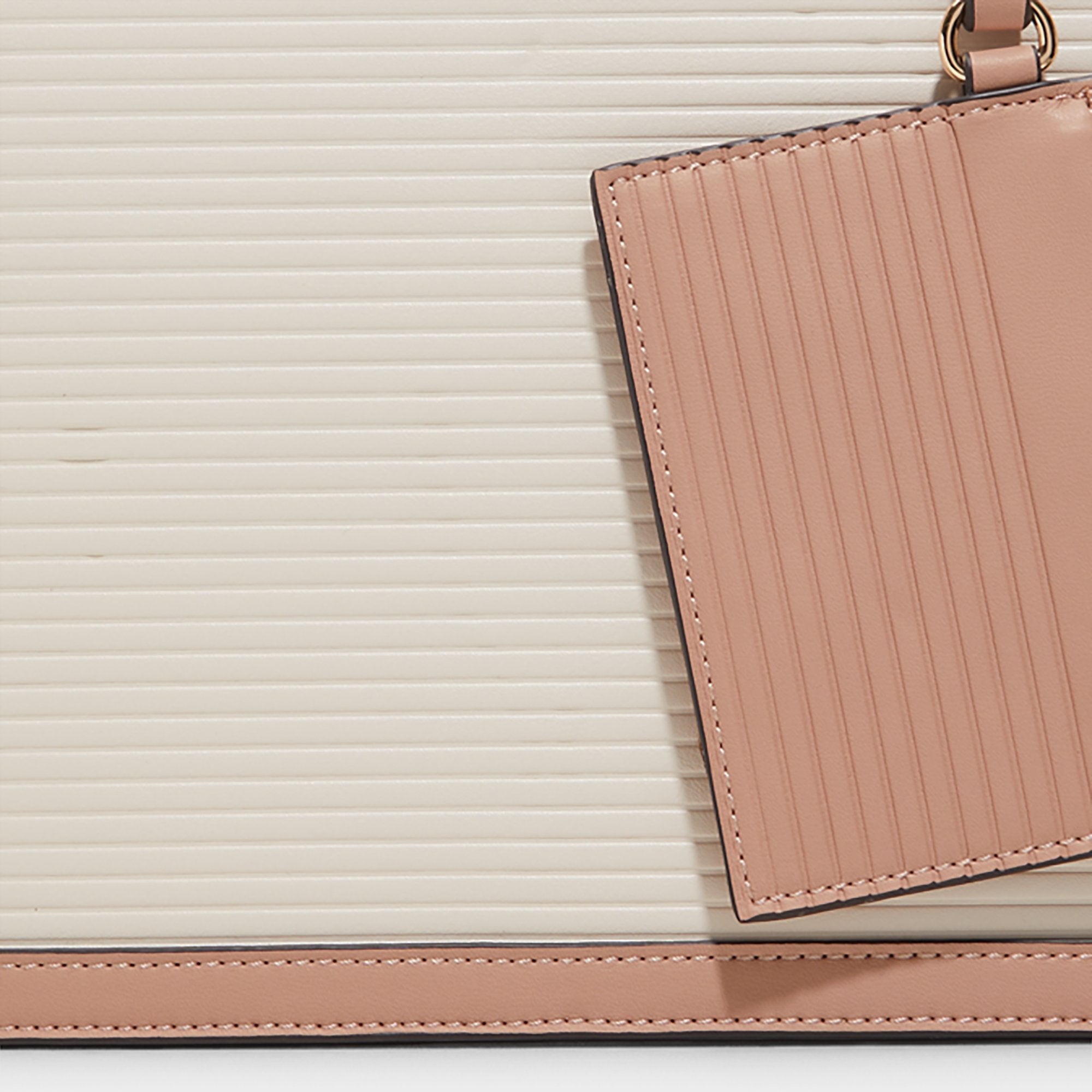 Ridged beige panels framed in blush trim give this structured tote an artful vibe, with dual top handles that swap into clip-on crossbody straps for hands-free versatility and city-ready ease. Carry it to the office with a tailored pantsuit, or sling it over weekend denim and tees for errands, finishing each look with effortless polish.