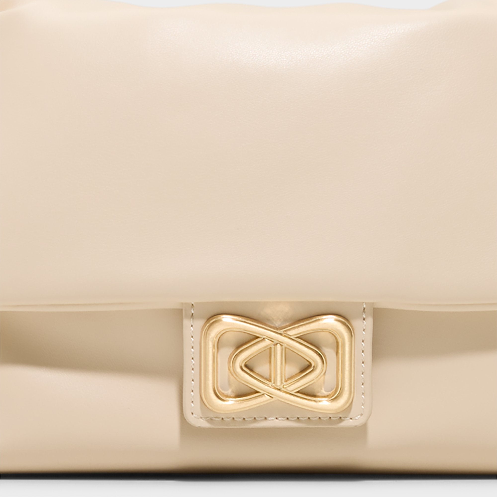 Softly gathered cream leather shapes a relaxed crescent, cinched by side drawstrings and centered with a gold push-lock buckle that closes quietly, adding polish to everyday plans. Pair it with jeans and a blazer for cafe catch-ups, or tuck it under your arm with a slip dress for gallery visits.