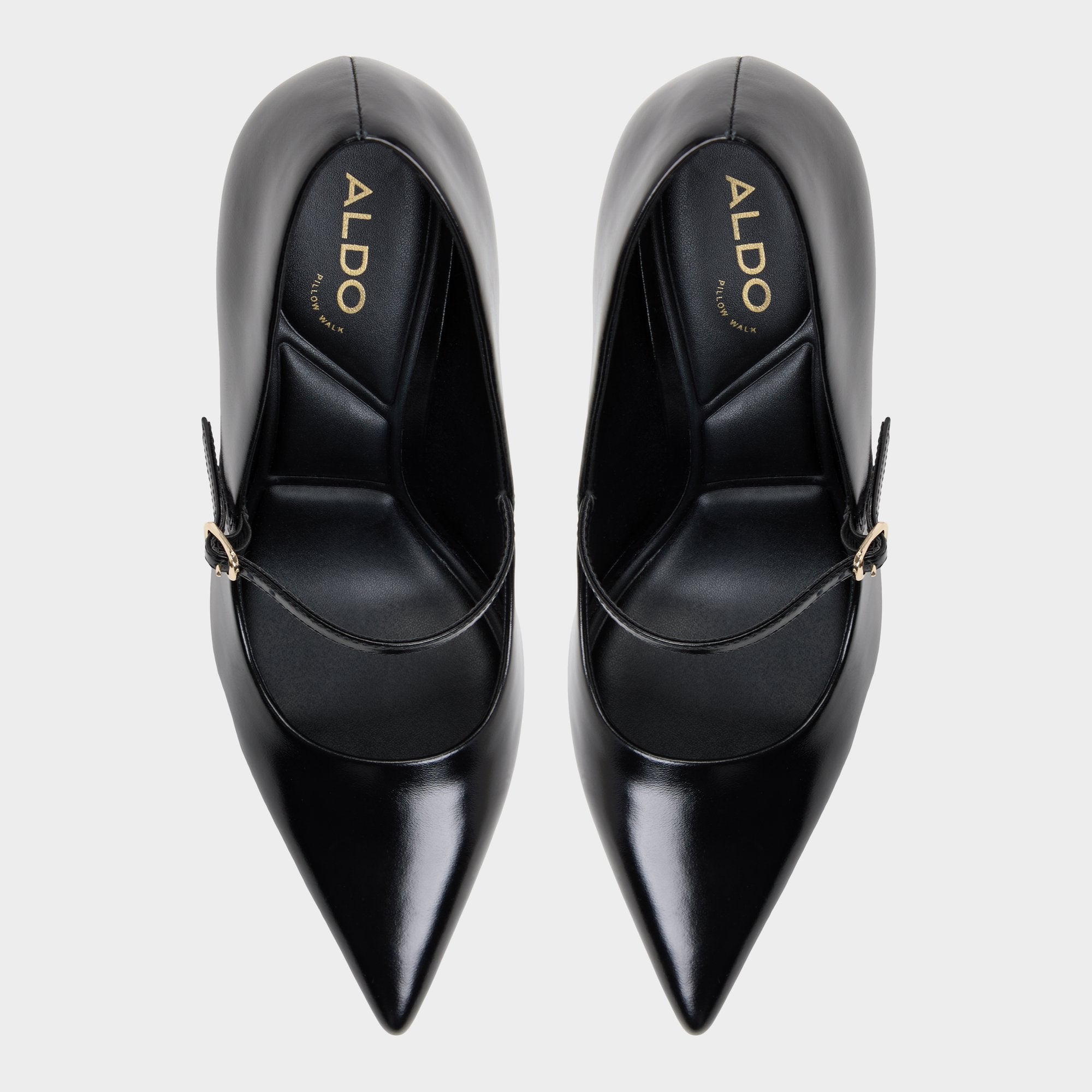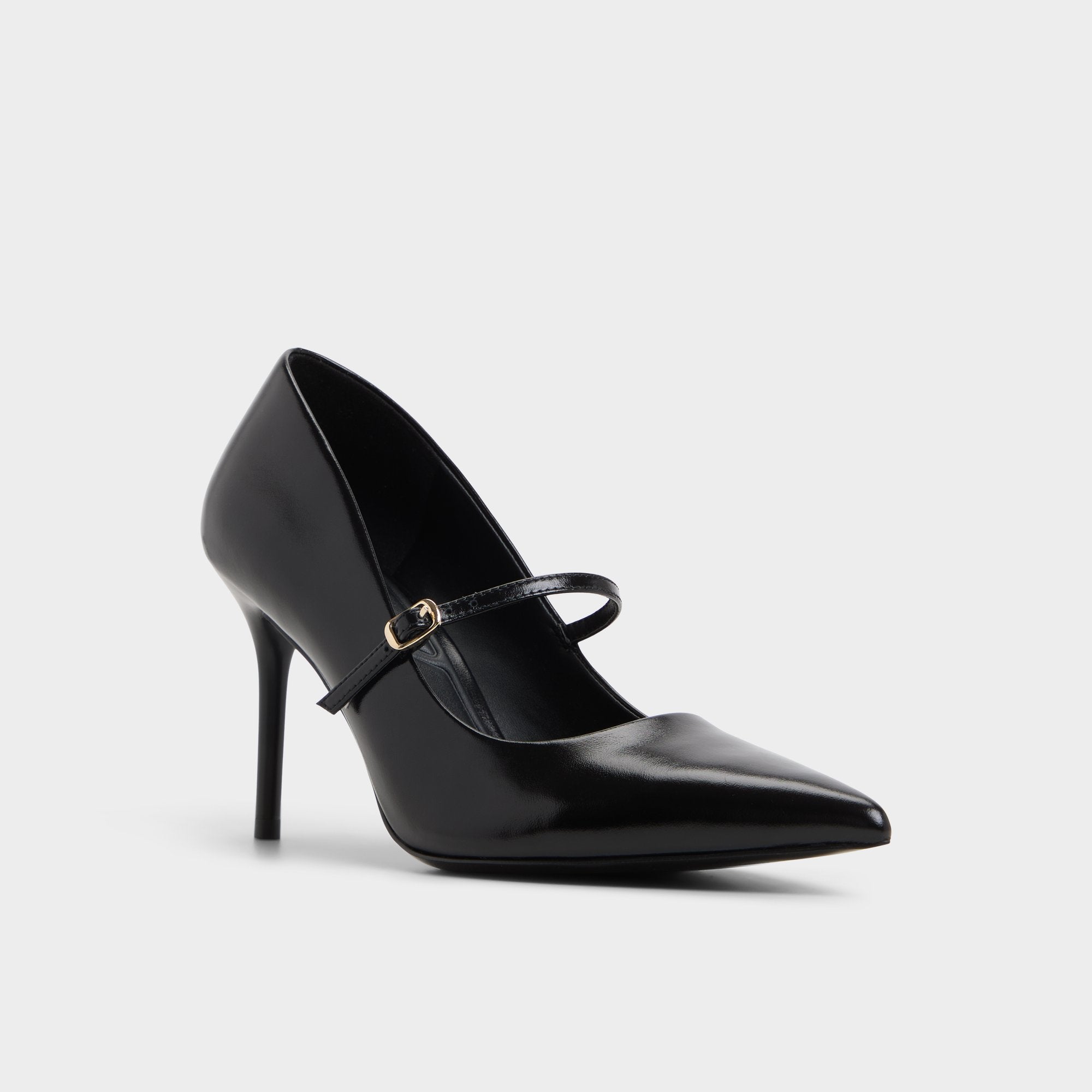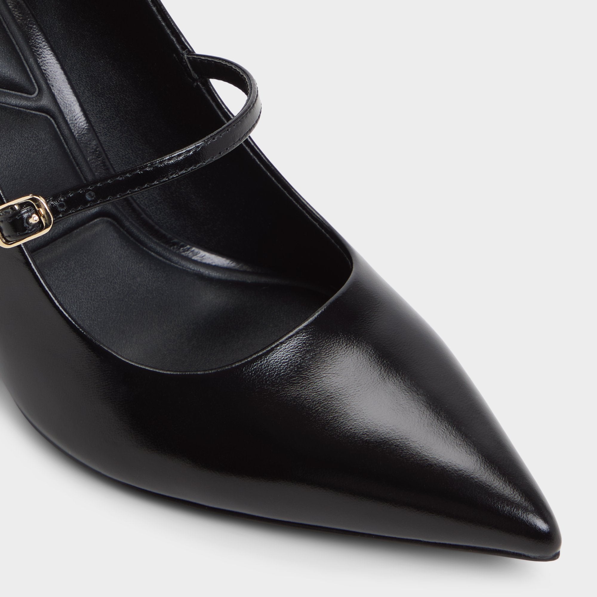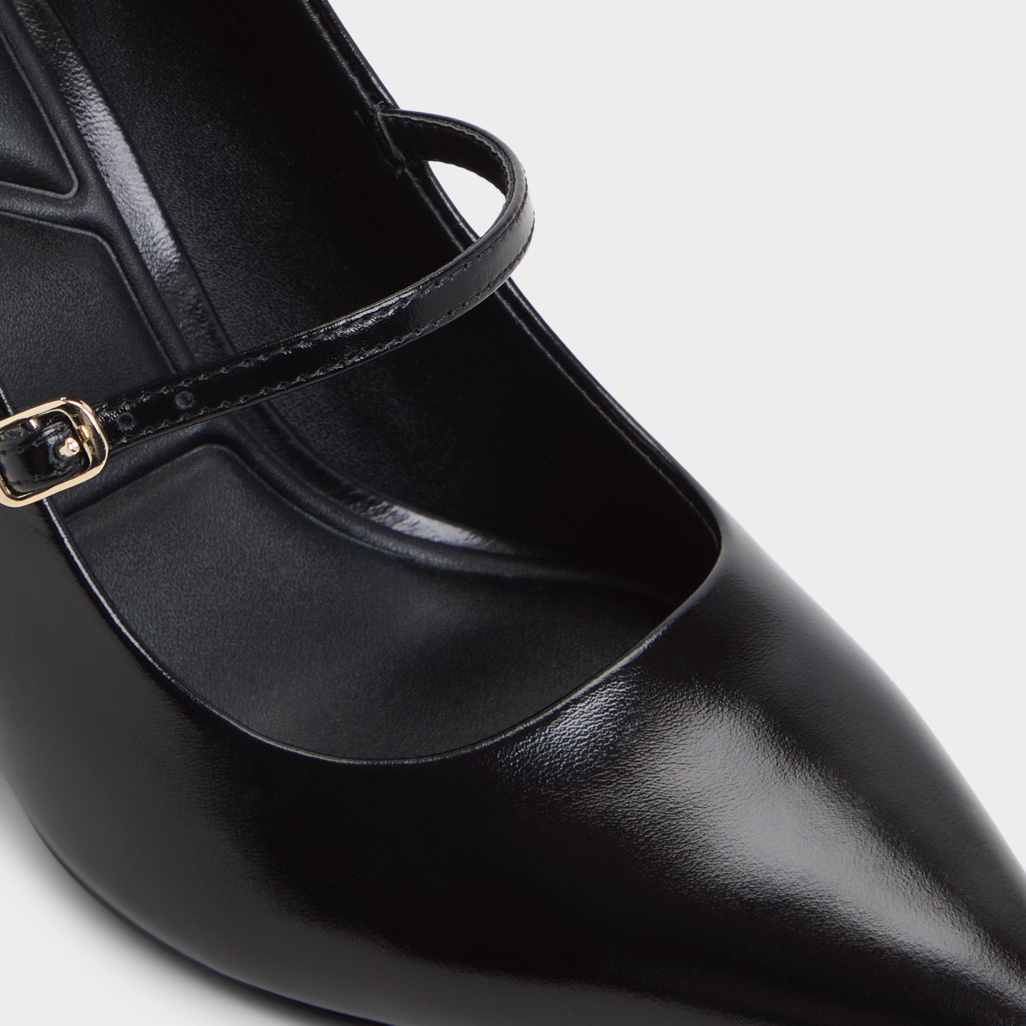 Sleek black leather wraps around a pointed toe, balanced by a delicate Mary Jane strap and stiletto heel for poised confidence day or night. Pair with tailored trousers for pitches, or swap in a satin slip dress when rooftop cocktails beckon.