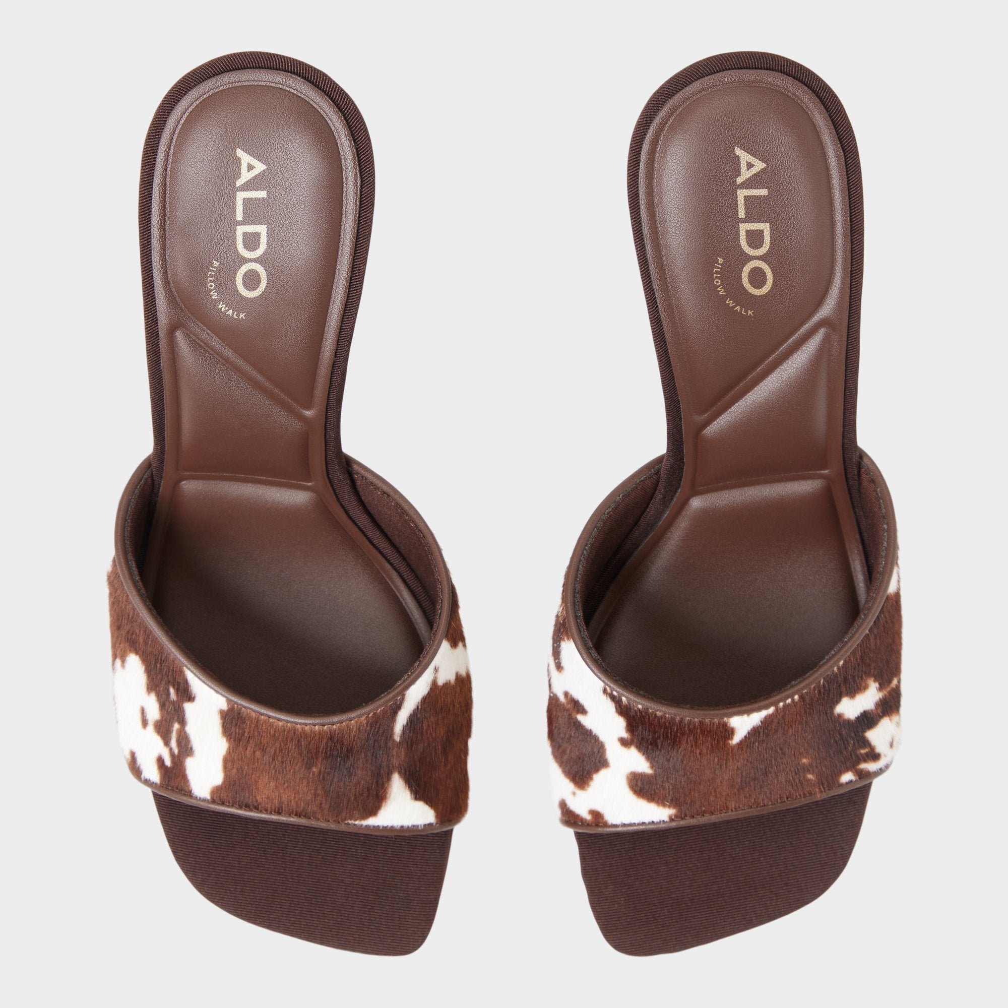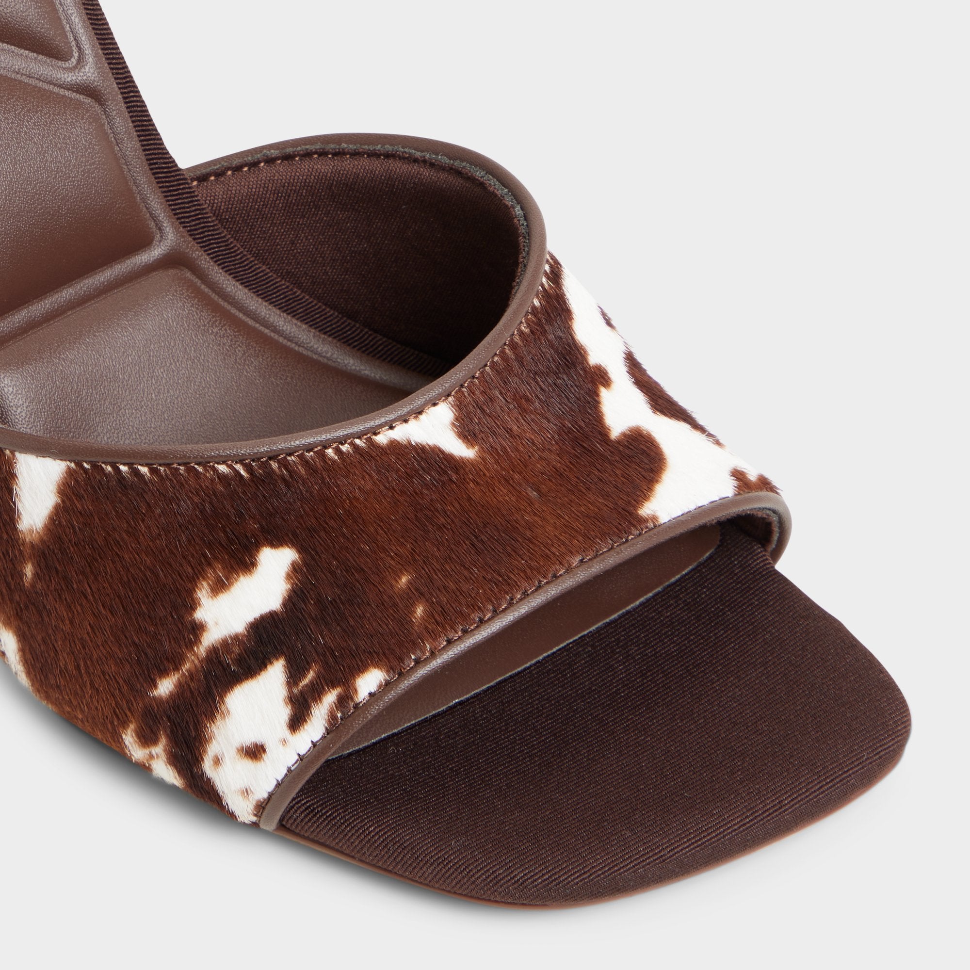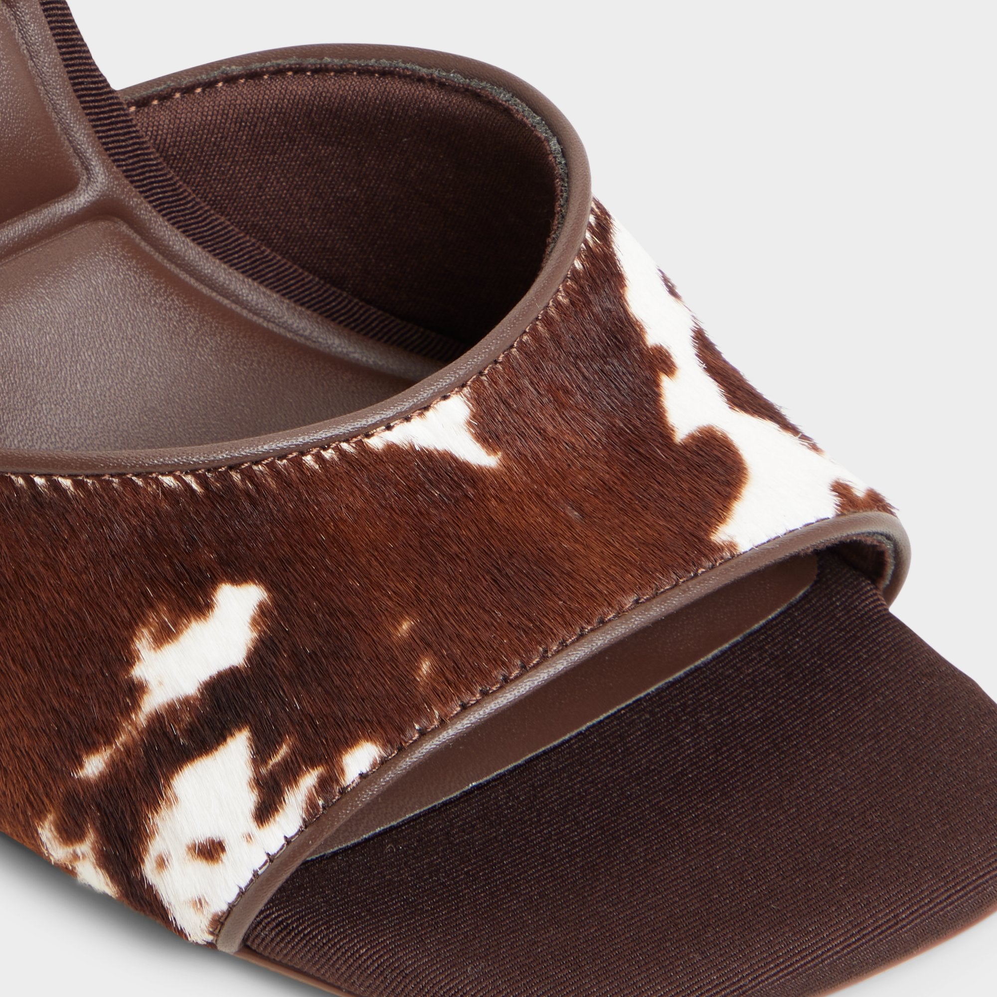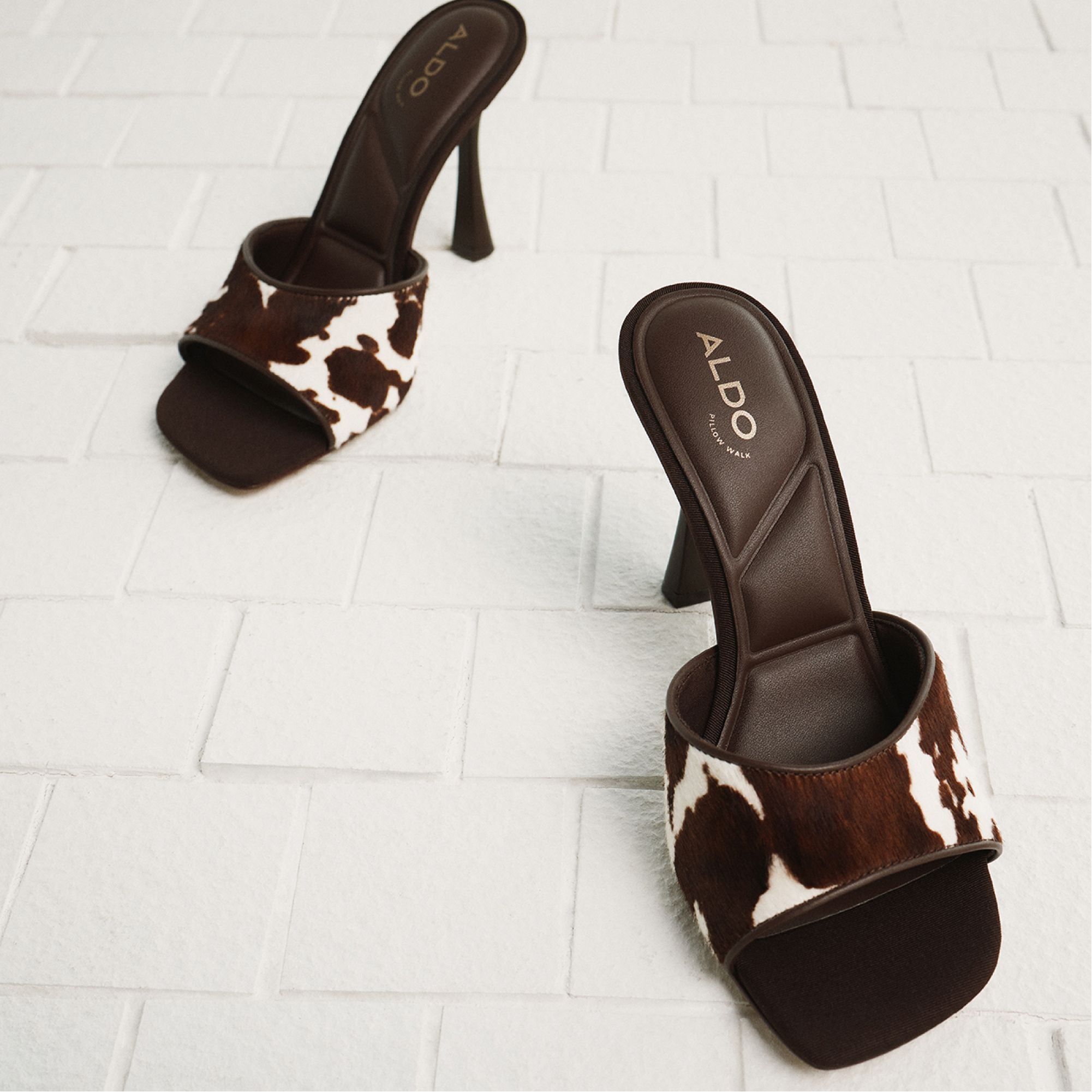Cowhide spots meet polished leather on a sleek mule, where a flared stiletto elevates the silhouette and trusted comfort lets you glide from morning meetings to evening plans with ease. Pair with tailored shorts for gallery hops, or slide beneath a slinky dress when dinner reservations turn into impromptu dance floors.