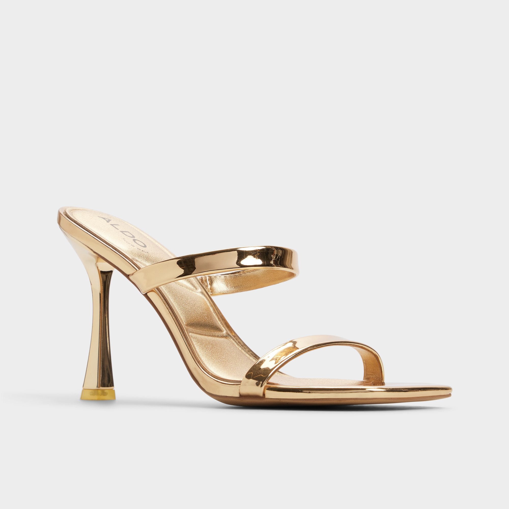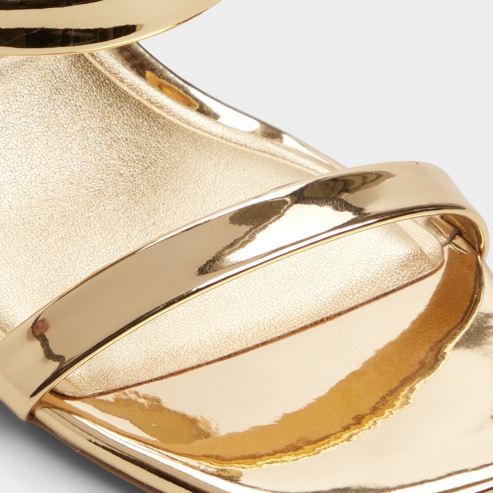 Liquid-gold leather drapes two sleek straps, while a sculpted stiletto lifts the silhouette and catches skyline reflections with disco-era confidence for nights that sparkle from cocktail rooftops to crowded dance floors. Pair with tailored shorts for cocktail rooftops, or slip under a sleek slip dress when weddings drift into unforgettable dance floors.