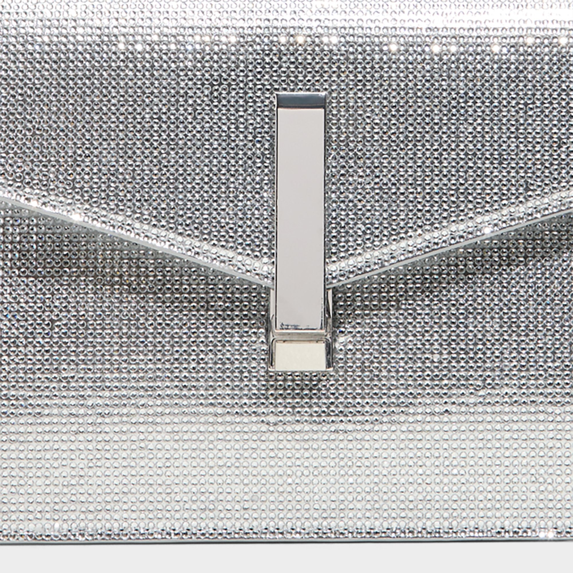 Liquid-silver mesh wraps this envelope clutch in head-turning shimmer, secured by a sleek vertical bar clasp that snaps shut to keep everything tucked safely when the lights go low. Clutch it with velvet slips at rooftop parties or tuck it under tailored blazers at after-work drinks to polish every move.