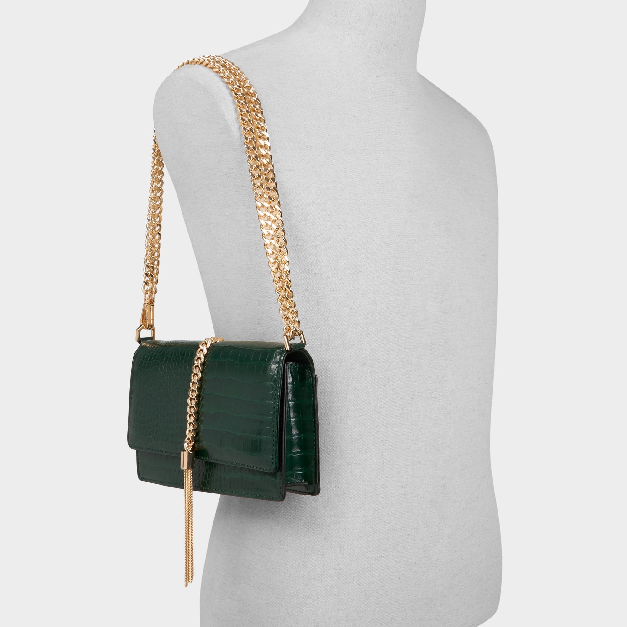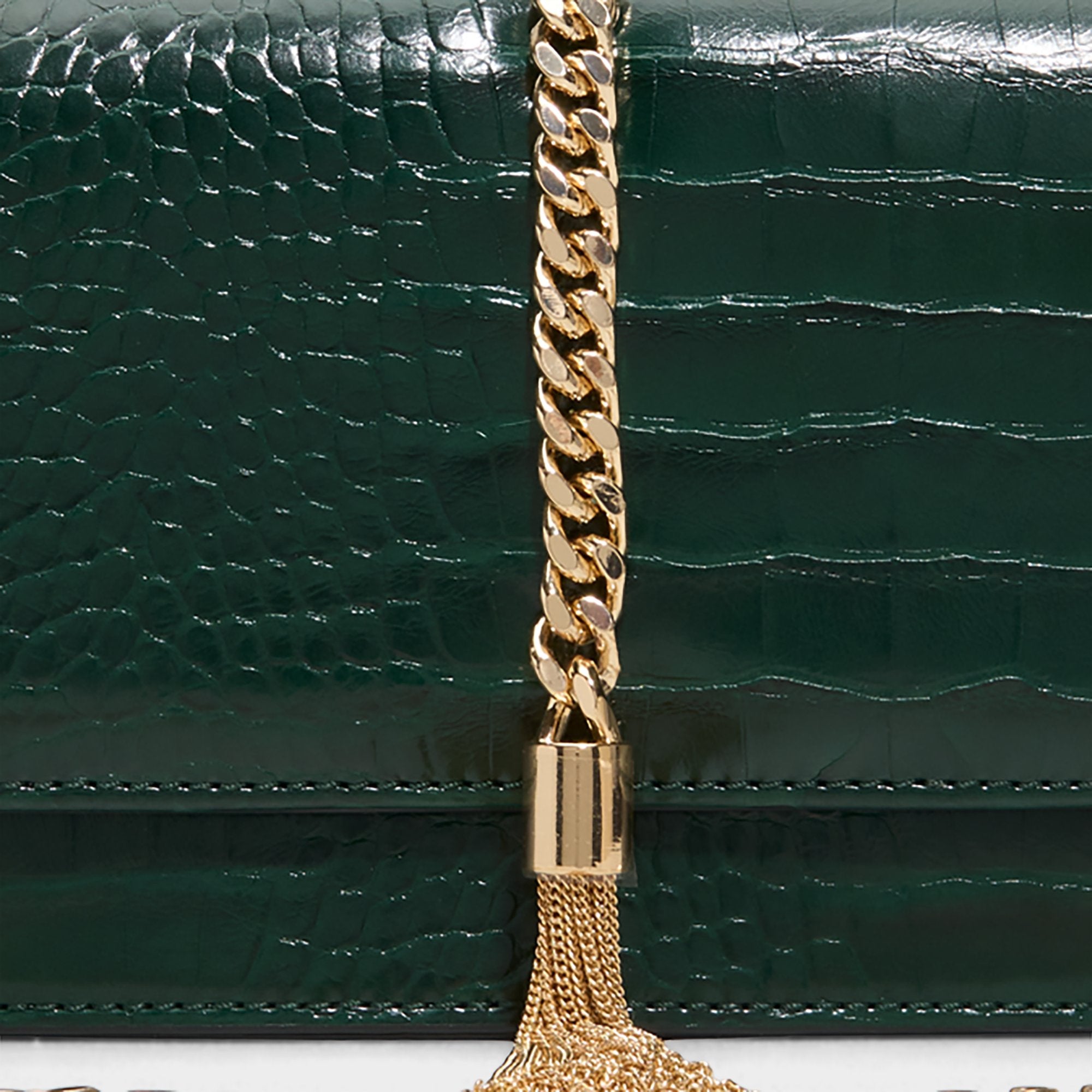 Forest-green croc-embossed leather wraps a chain-frame across this crossbody, turning it into a luxe jewel you can carry from coffee runs to after-dark gigs, with a glow that follows you through the day. Carry it with a satin slip for cocktails or sling it over a graphic tee and leather pants for city gigs.