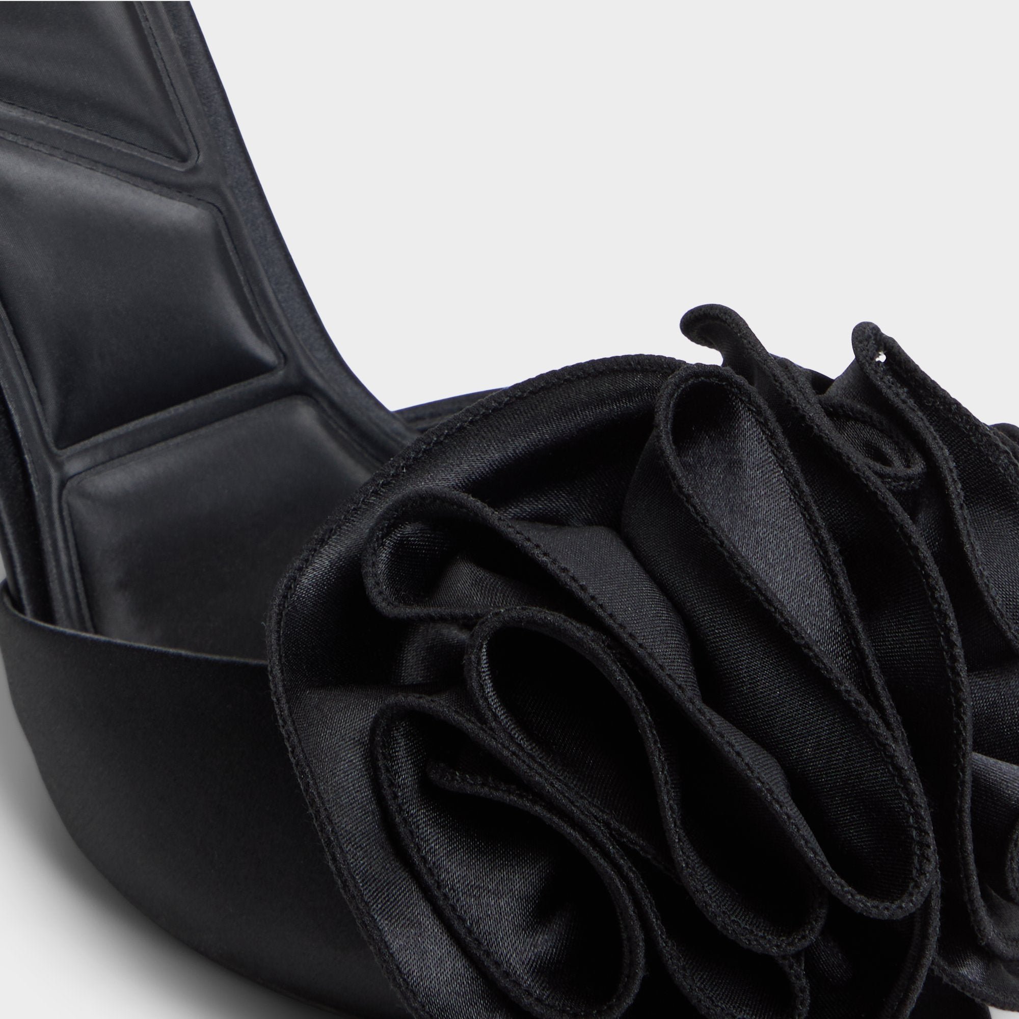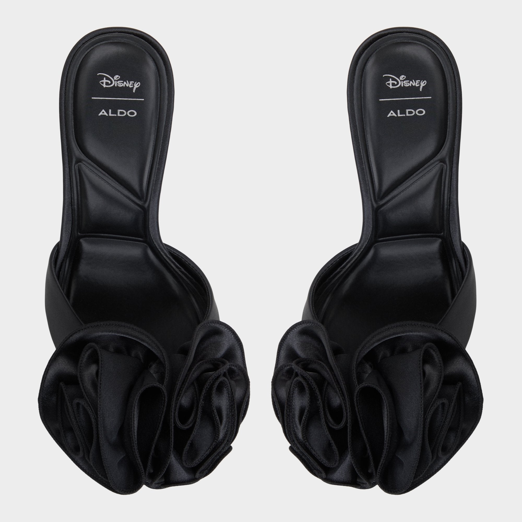 Just like Maleficent, this shoe reveals the duality of delicate femininity and dark impulses. Wear this black satin mule topped with a floral embellishment to bring a mix of bold and elegant. A dramatic style destined to rule the night.