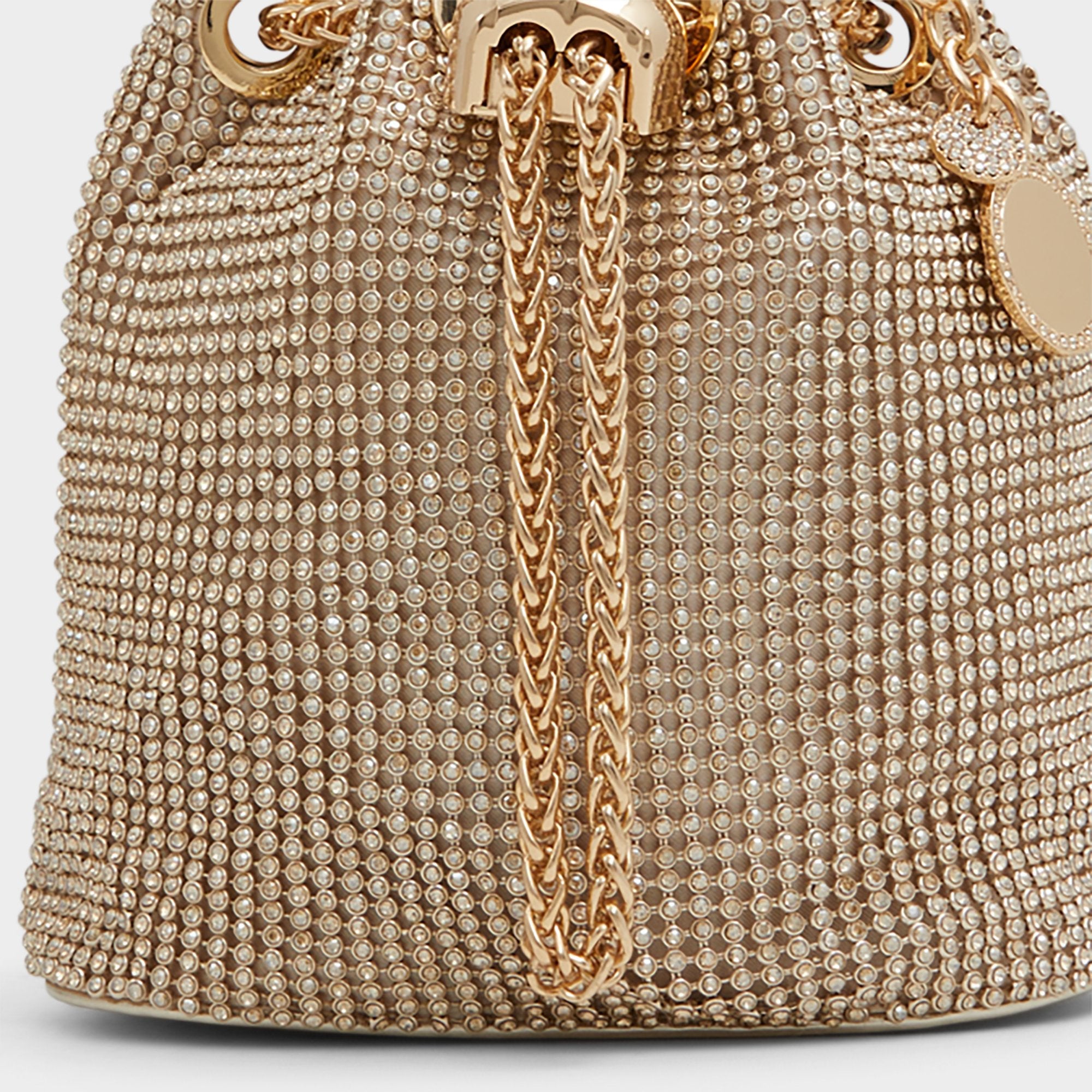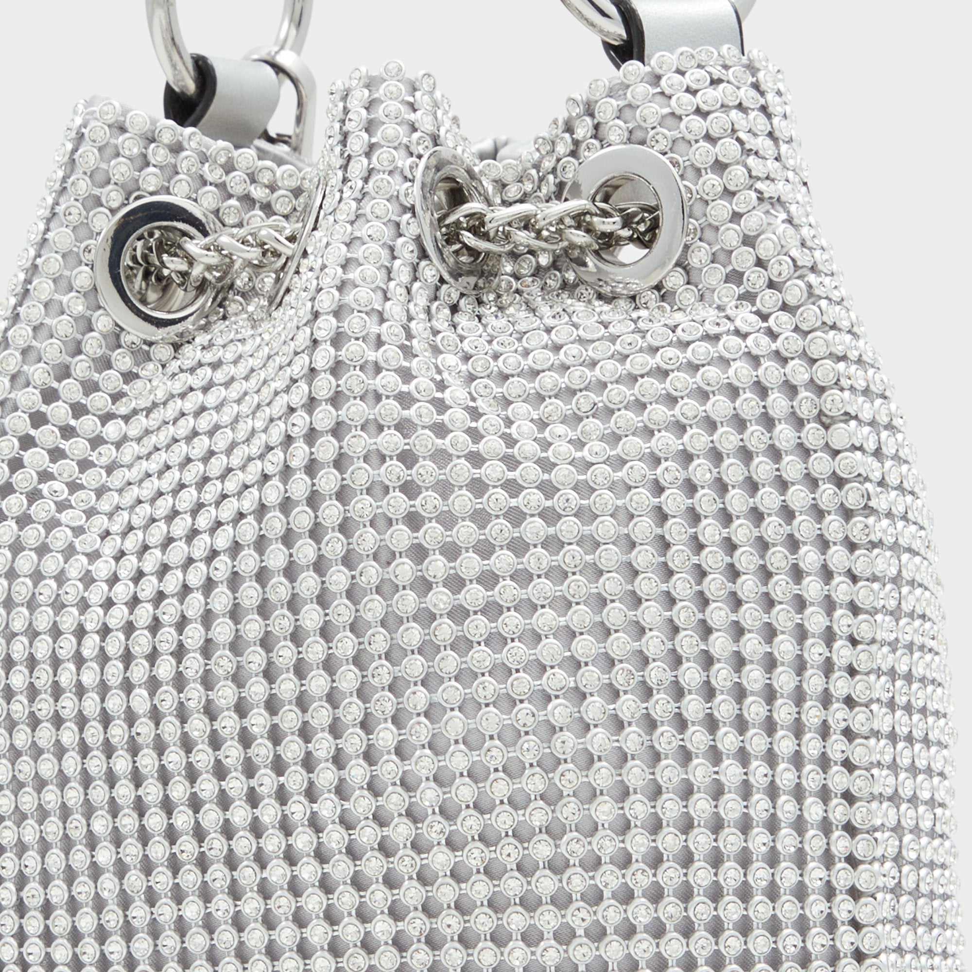 Marvel at this beautiful, rhinestone encrusted bucket bag designed to shine bright.