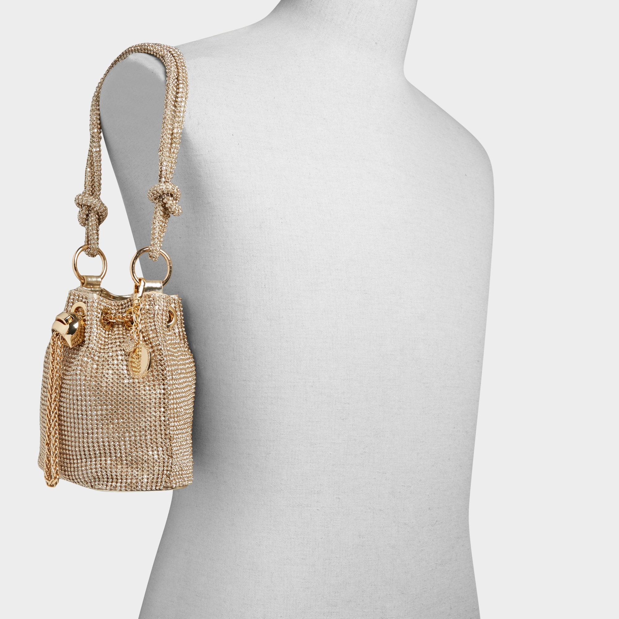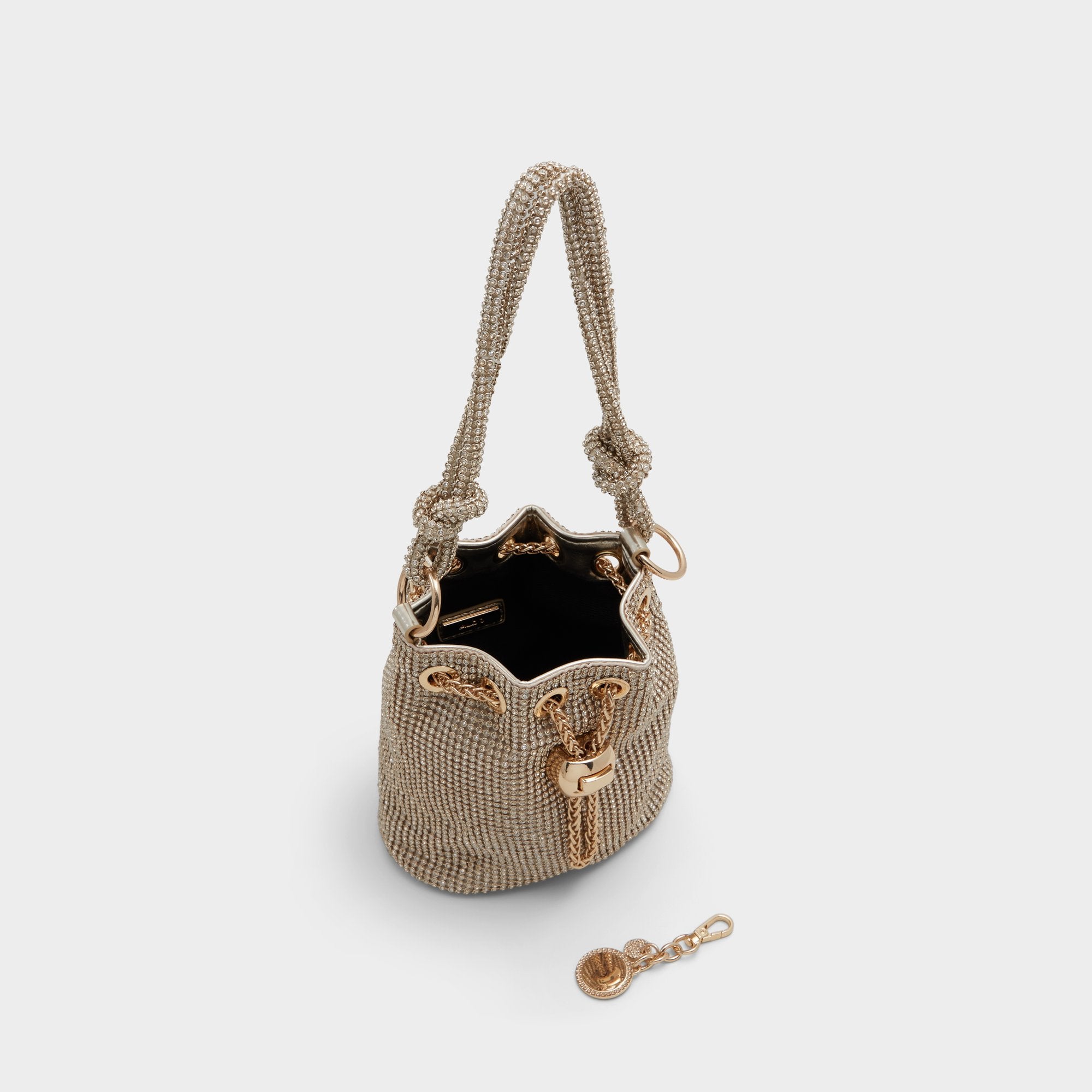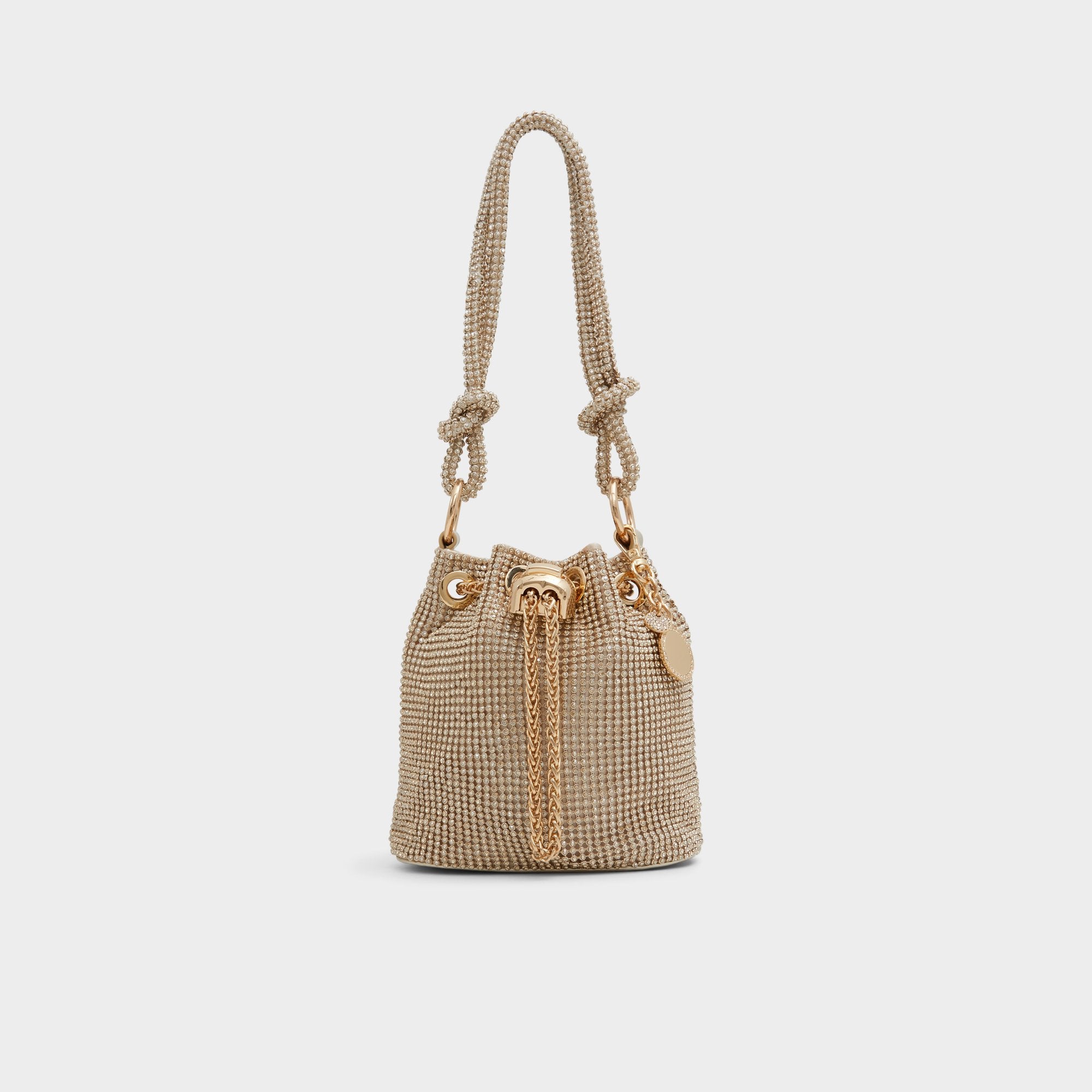 Compact yet eye-catching, this rhinestone-embellished bucket bag is a statement piece that will add a touch of sparkle to any ensemble.