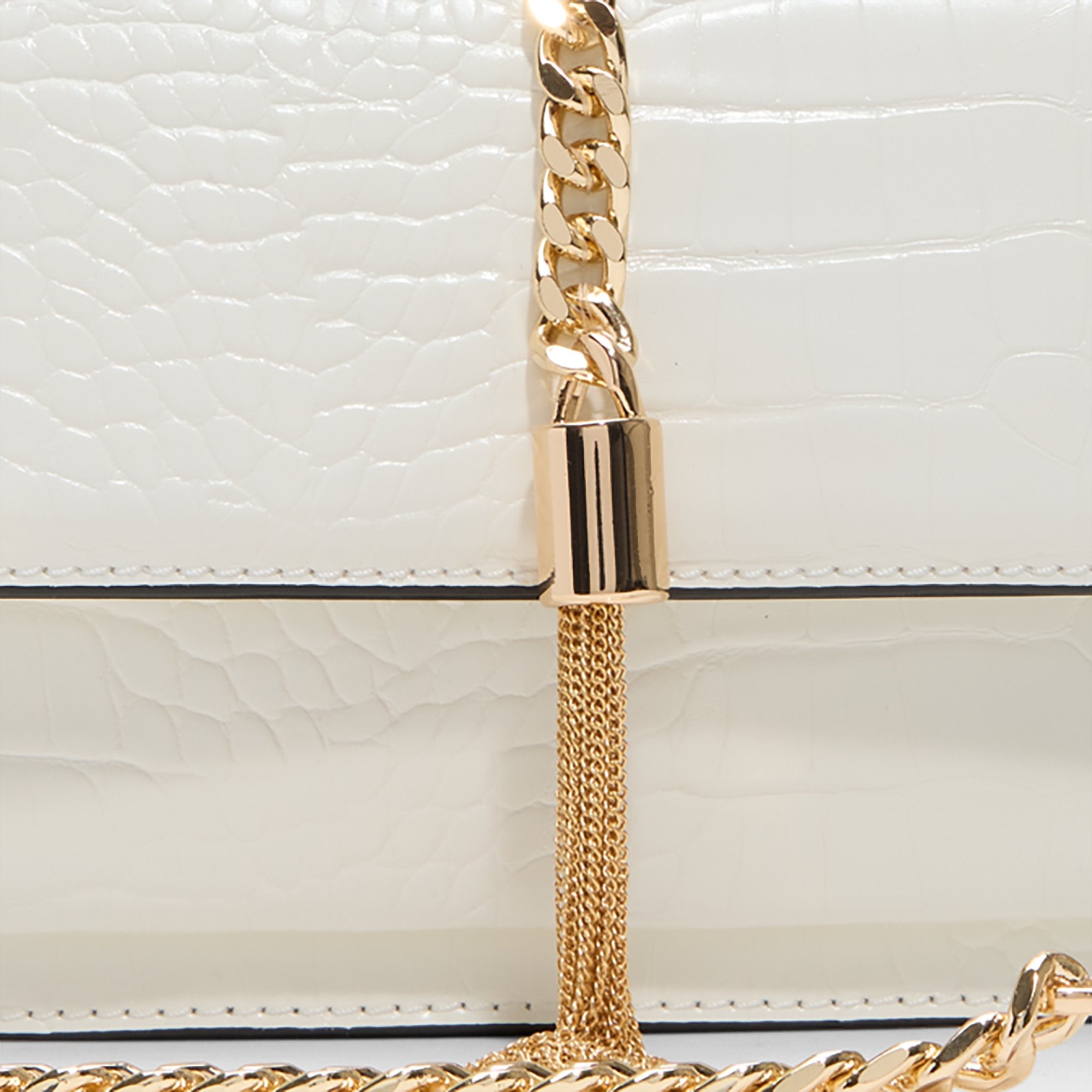 Bold croc-embossed leather pairs with shimmering vertical chains that drape the flap, turning this boxy crossbody into a statement piece with sleek tassels that swing as you move and catch the evening light. Carry it with midnight-ready tailoring, or sling it over a satin slip for evenings out, finishing the look with quiet, confident shine.