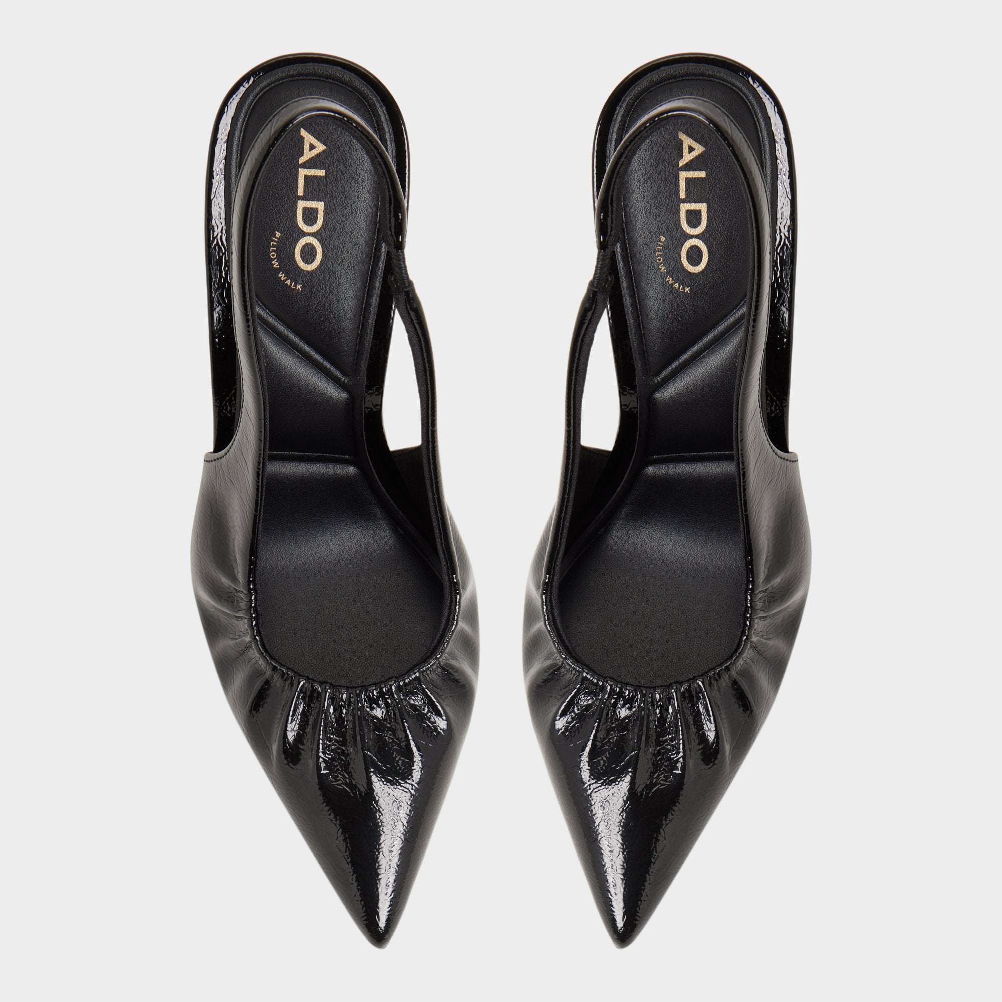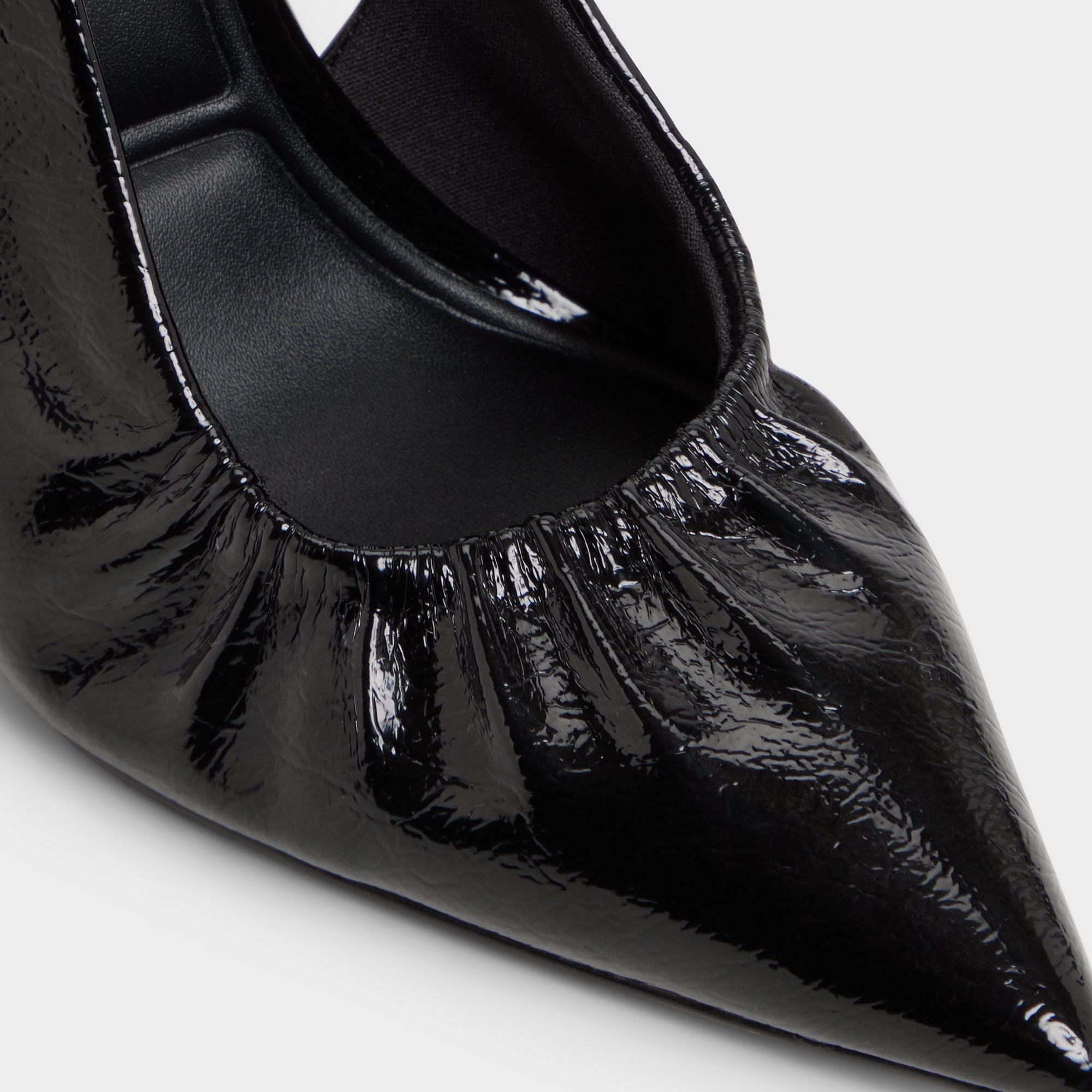Midnight-shiny patent leather hugs a sculpted slingback pump, where soft ruching along the pointed vamp adds a flicker of drama and turns every sidewalk into a black-tie entrance with effortless polish. Pair with tailored trousers for keynote mornings, or swap in a sleek satin slip for late-night gallery openings.