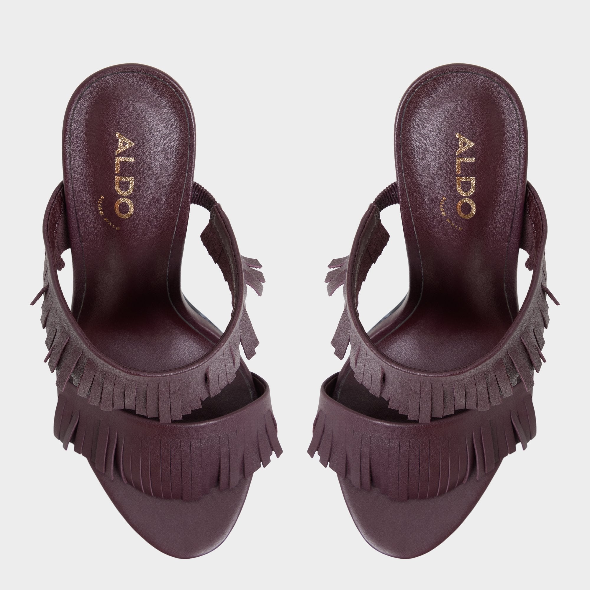 Fringe sways along twin straps in burgundy, a stiletto mule with a slender pointy toe and a supple footbed that lets you glide from after-hours galas to gallery openings and city strolls. Pair with tailored pants for pitch days, or slip under a sleek dress for cocktails.