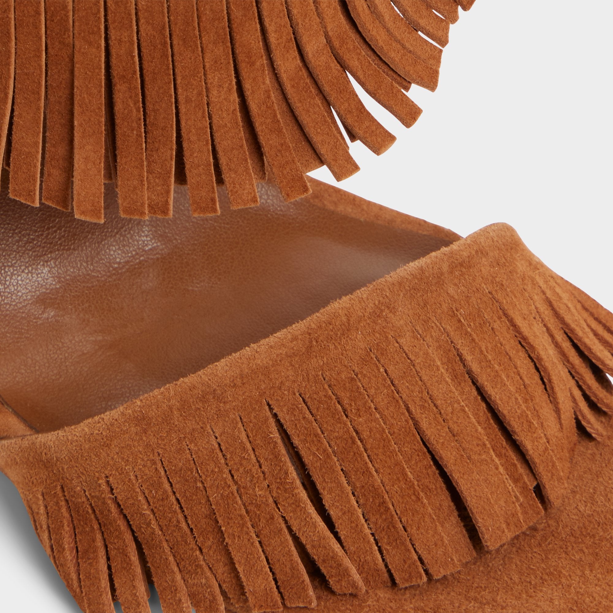 Soft caramel suede fringe drapes over the foot, while a sky-touching stiletto adds posture-poised drama that makes every step feel intentional and effortlessly chic, ready for the day. Pair with flare jeans for rooftop concerts, or swap in a sleek jumpsuit for gallery openings and late-night city strolls.