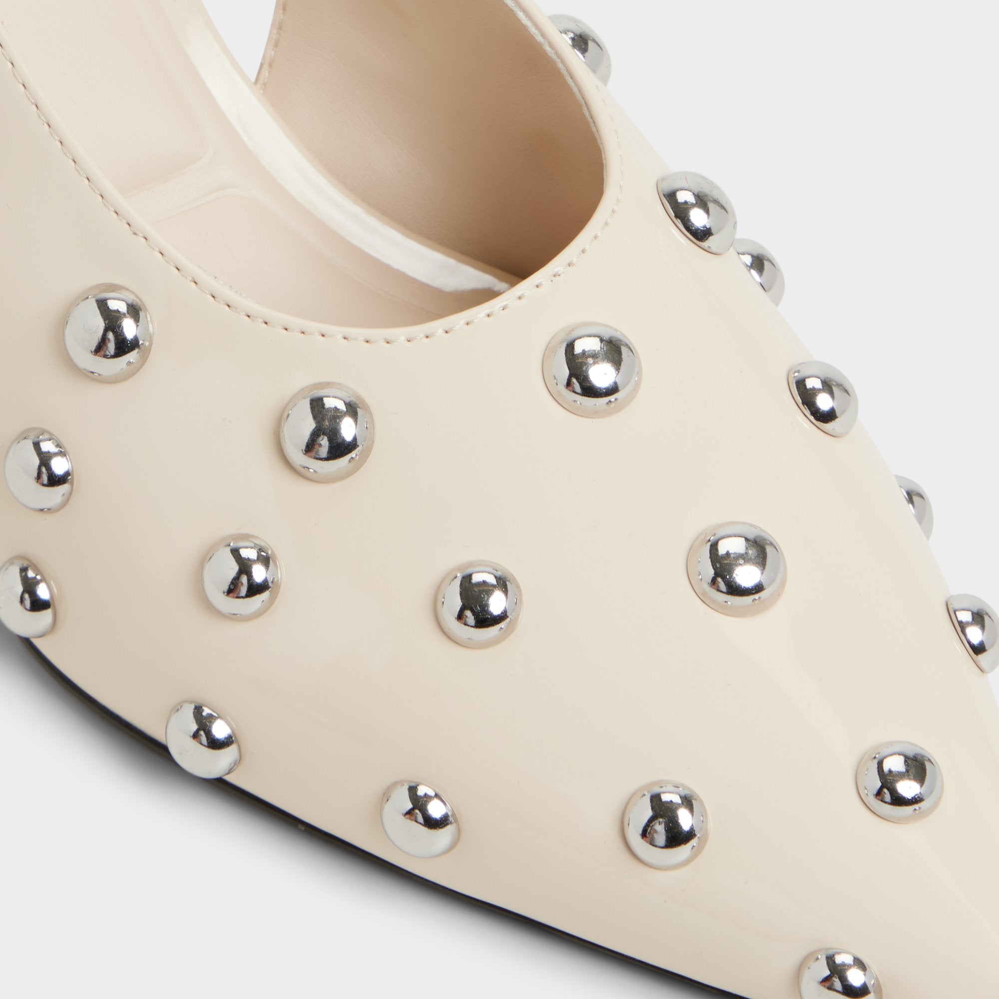Glazed patent leather with silver studs catches city lights, while a sculpted kitten heel and slingback buckle keep it poised yet easy, letting you stride with rebellion and no wobble. Pair with cropped tailoring for meetings, or swap in a sleek slip dress for rooftop cocktails.