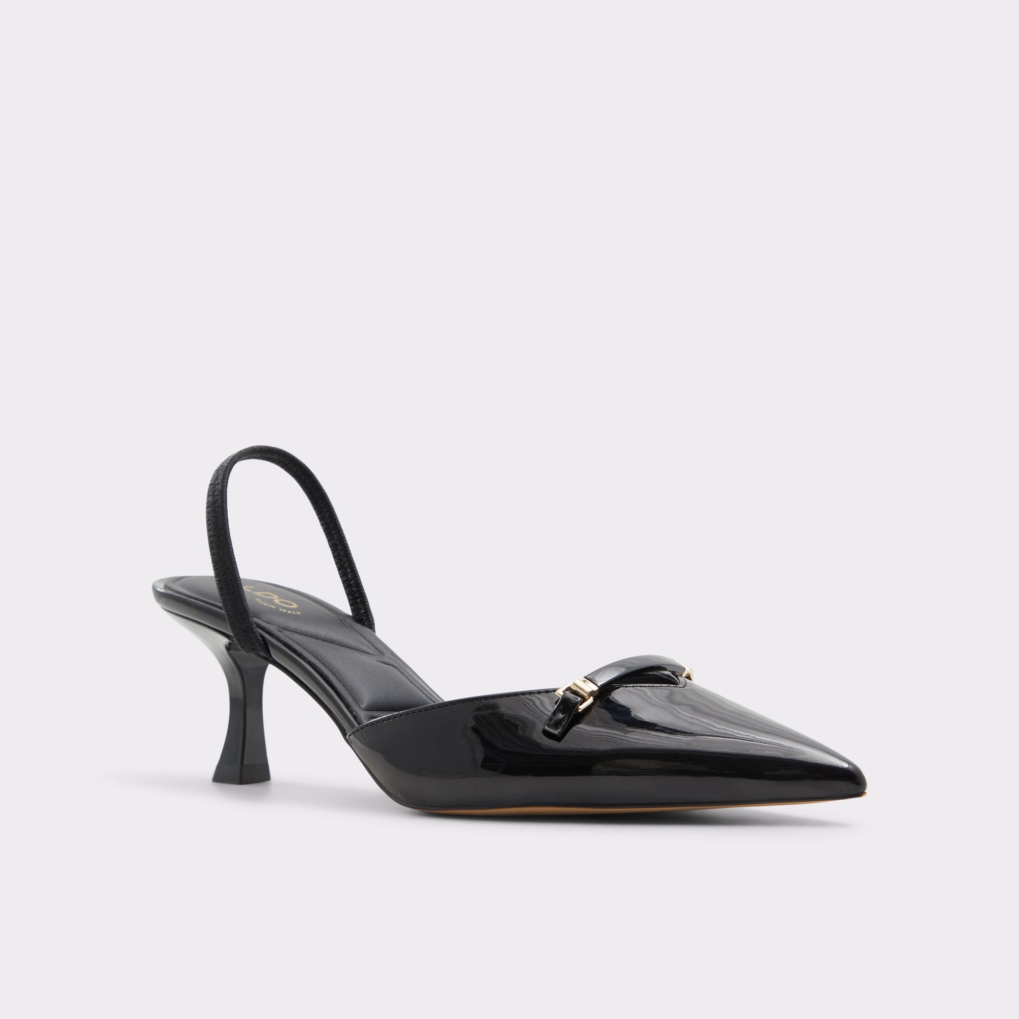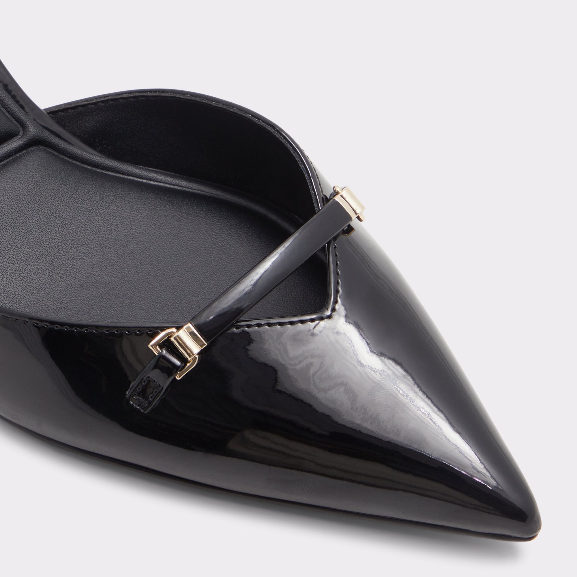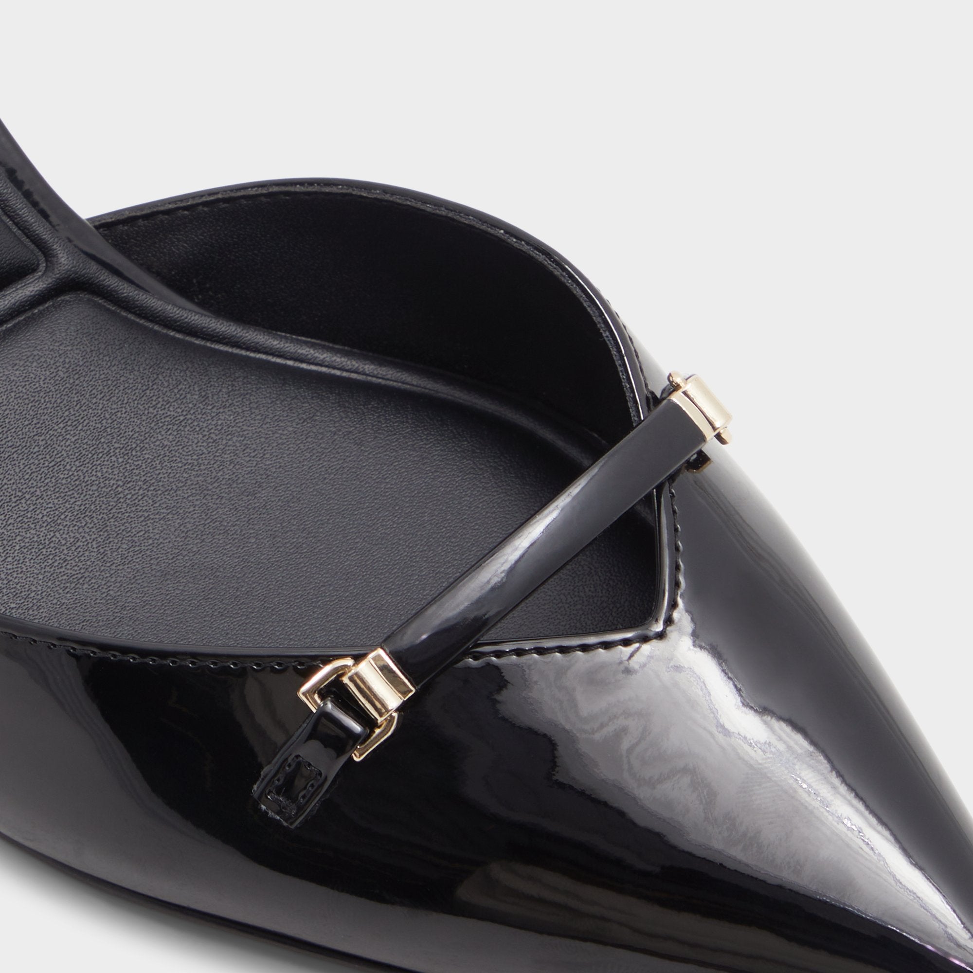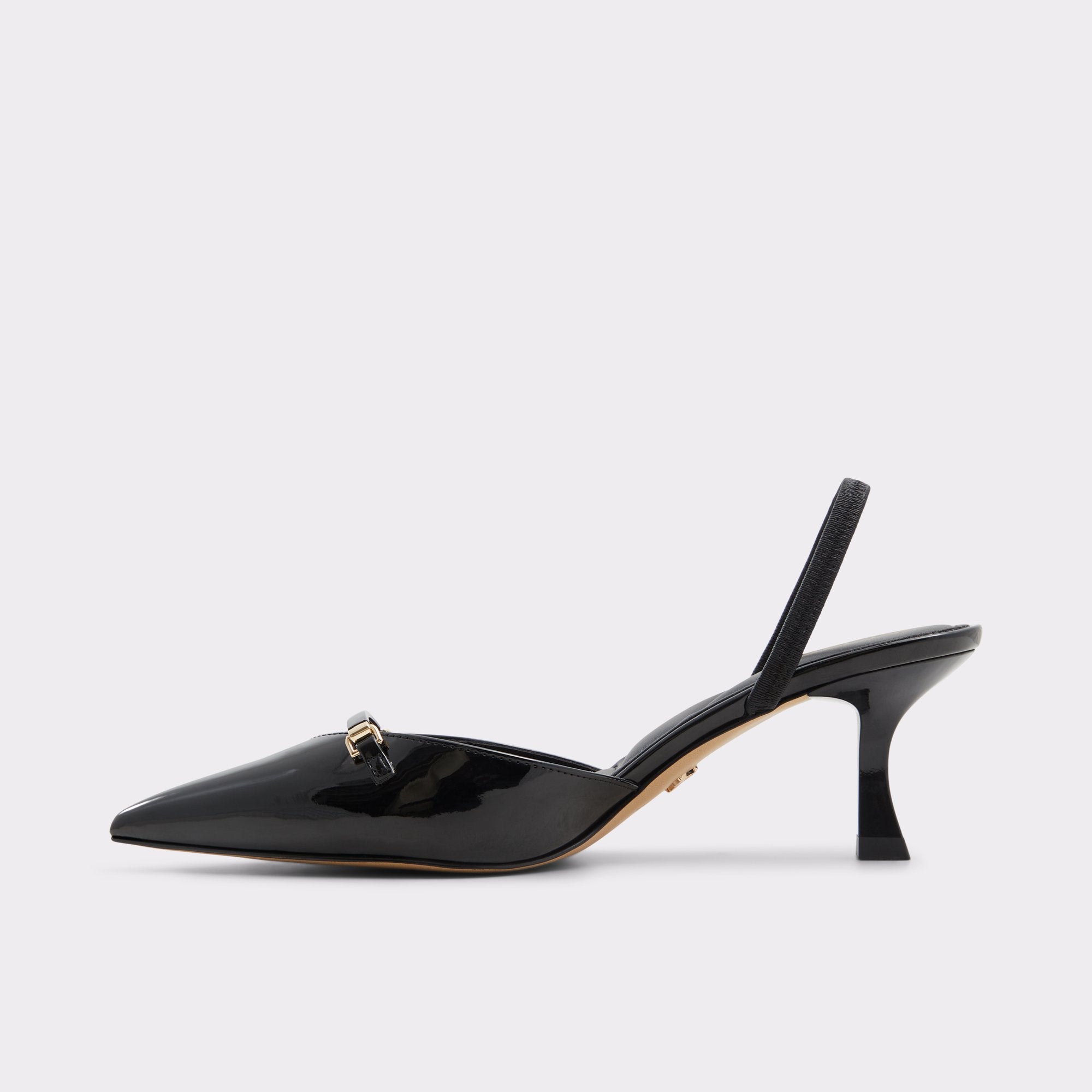 Midnight-gloss patent leather forms a sharp point on a poised kitten heel, with a metal charm bridging the vamp for film-noir confidence and a smooth leather lining that cushions every stride. Pair with tailored joggers for after-hours city nights, or slip on with a sleek jumpsuit when rooftop gatherings glow under starlight.