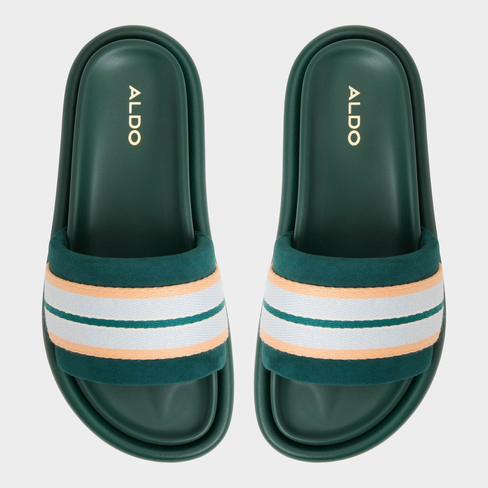 Sun-kissed green slides fuse laid-back court vibes with plush straps wrapped in retro orange and white stripes, while a cushy rubber sole keeps every pool deck, park path, and patio stroll springy and easy. Pair with bike shorts for errands that sprint, or swap into a breezy sundress for brunch to sunset by the water.