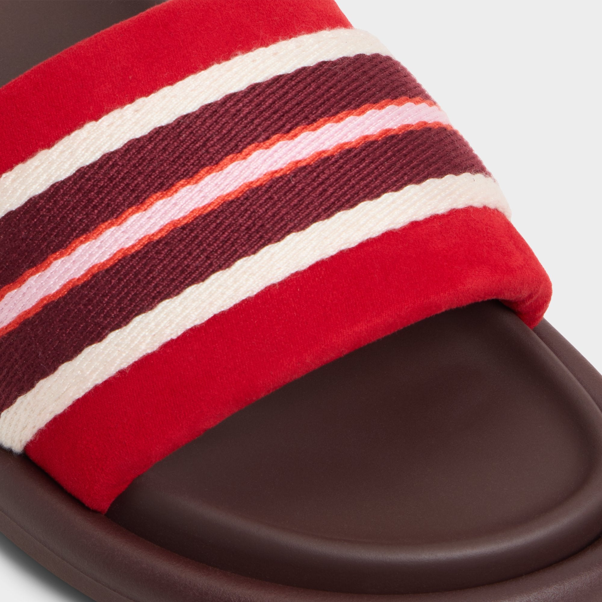 Sun-chasing stripes trace the cushy textile band of this slide, riding a flexible rubber sole for all-day ease from pool decks to coffee runs and lazy weekend wanderings that pair effortlessly with sunlit days. Pair with cropped denim for poolside brunches, or slip on under a breezy maxi as golden hour drifts into starlit strolls.