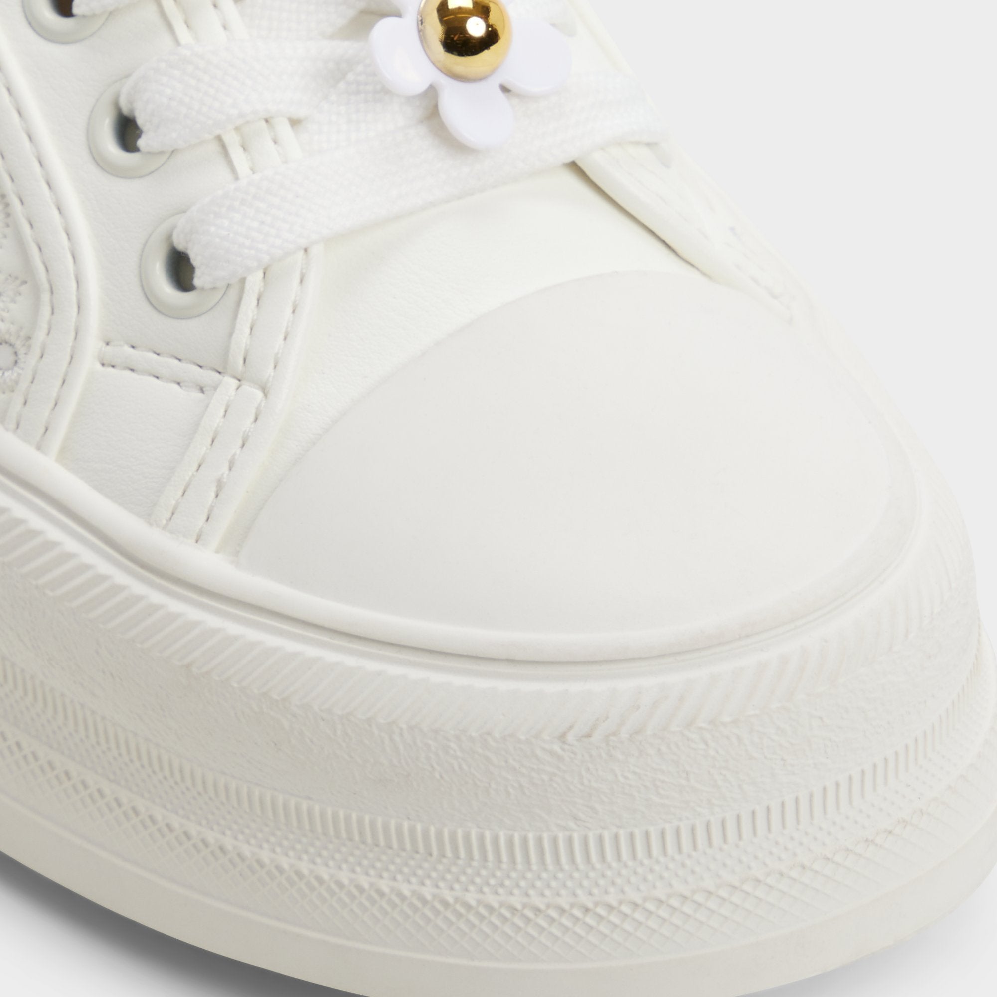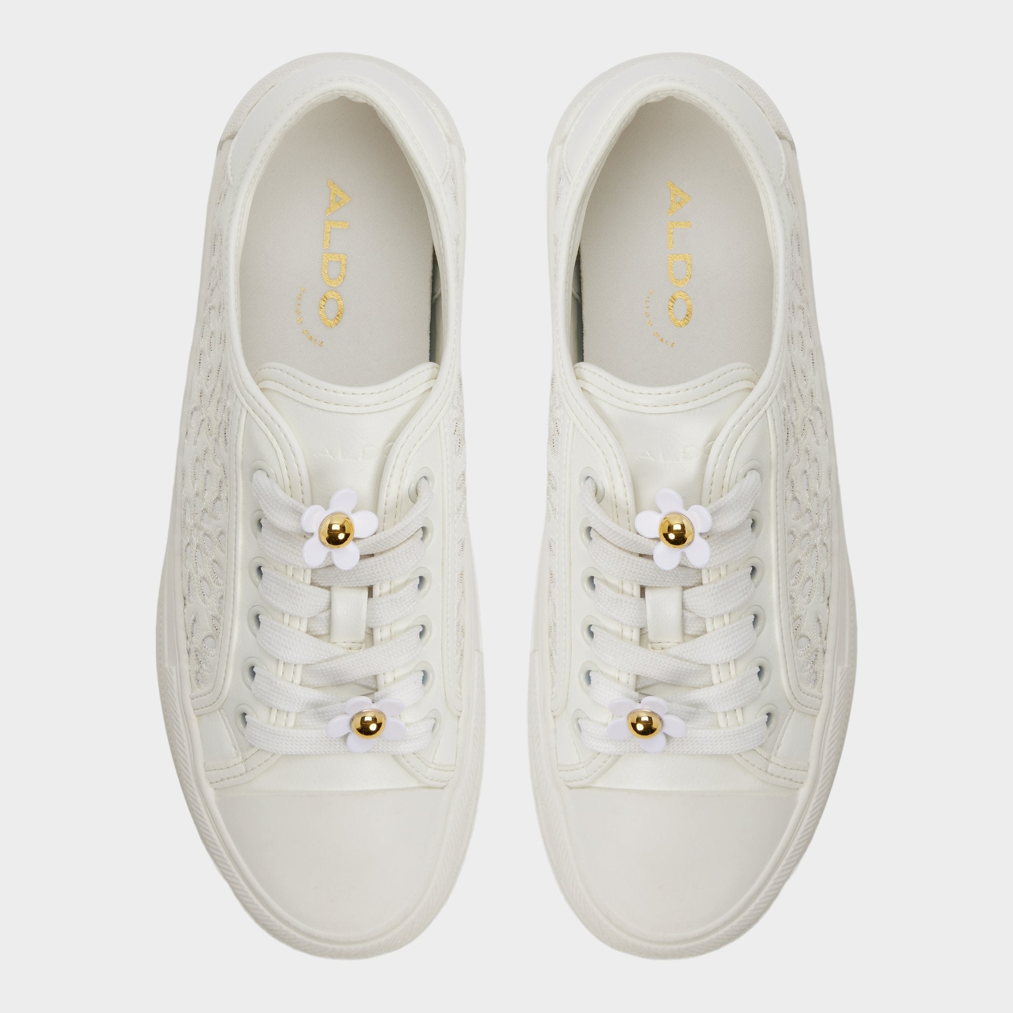 Breezy floral eyelets spill across this fresh white sneaker, accented by bloom charms on the laces while the cushy platform cupsole adds height and keeps strides lighthearted. Pair with cropped utility pants for gallery hops, or swap in a flirty sundress when patio brunch rolls into park picnics.
