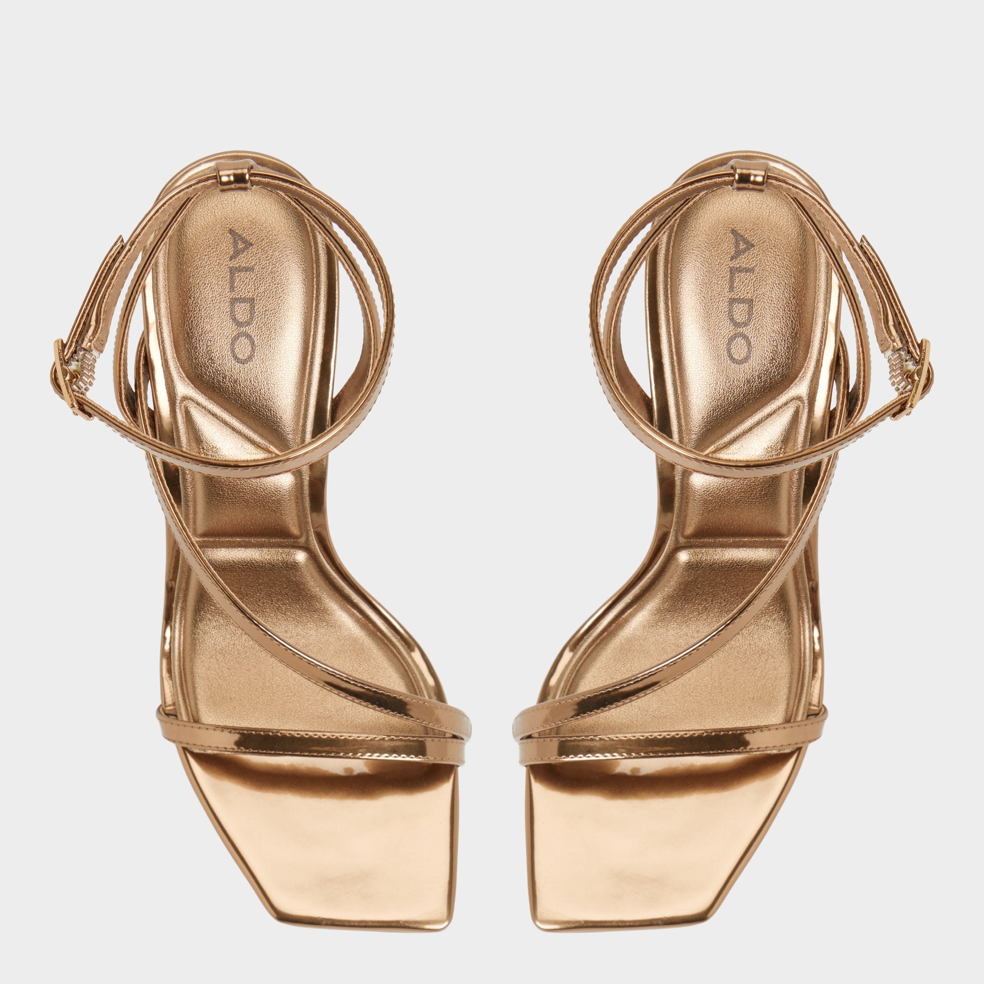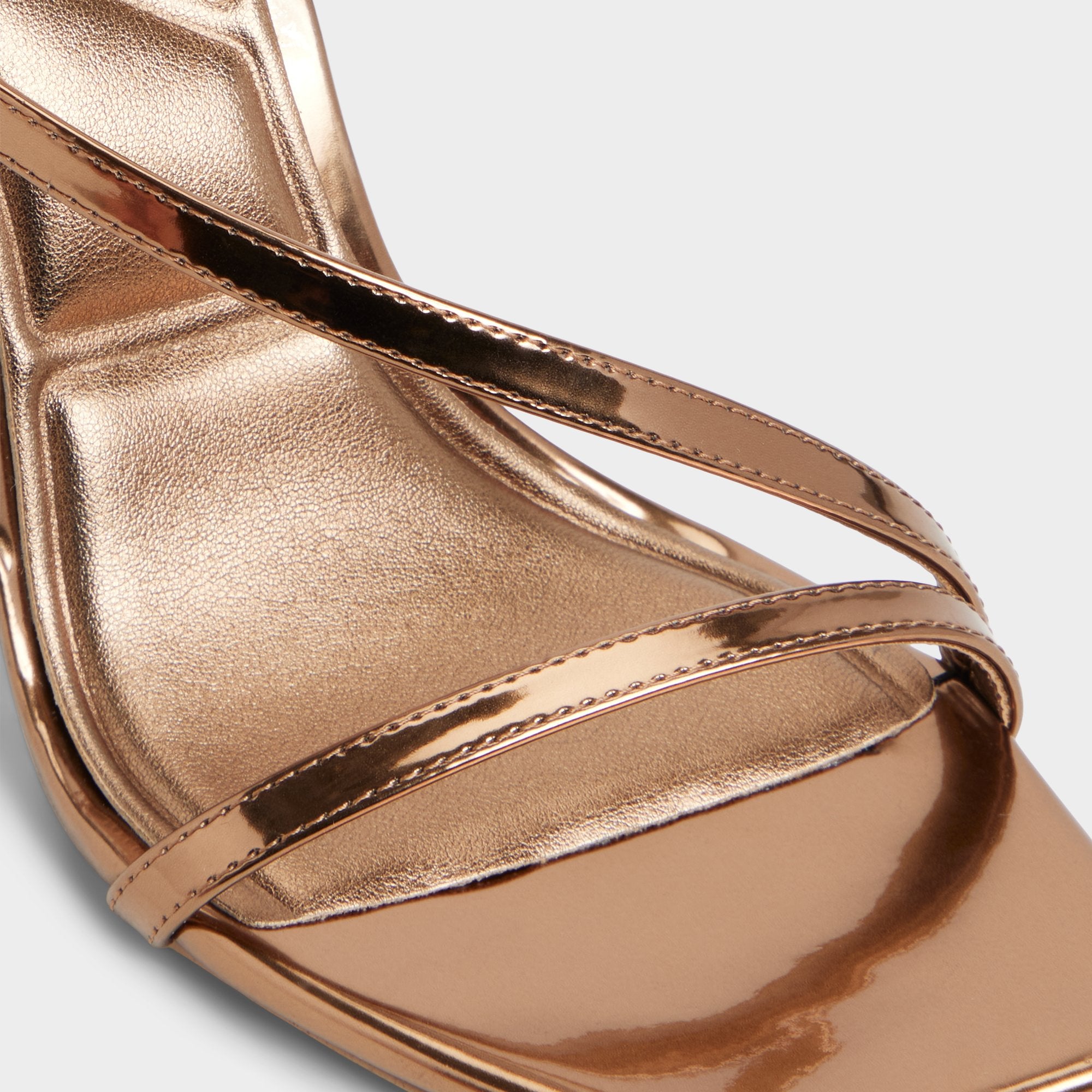 Mirror-gloss metallic straps cross elegantly over squared toes, while sculpted stiletto heels offer poise for cab exits and candlelit entrances, catching city lights with every confident step and elevating evenings with a subtle shimmer. Pair with tux trousers for gallery nights, or team with a satin midi for cocktails that spill into late-night dancing.