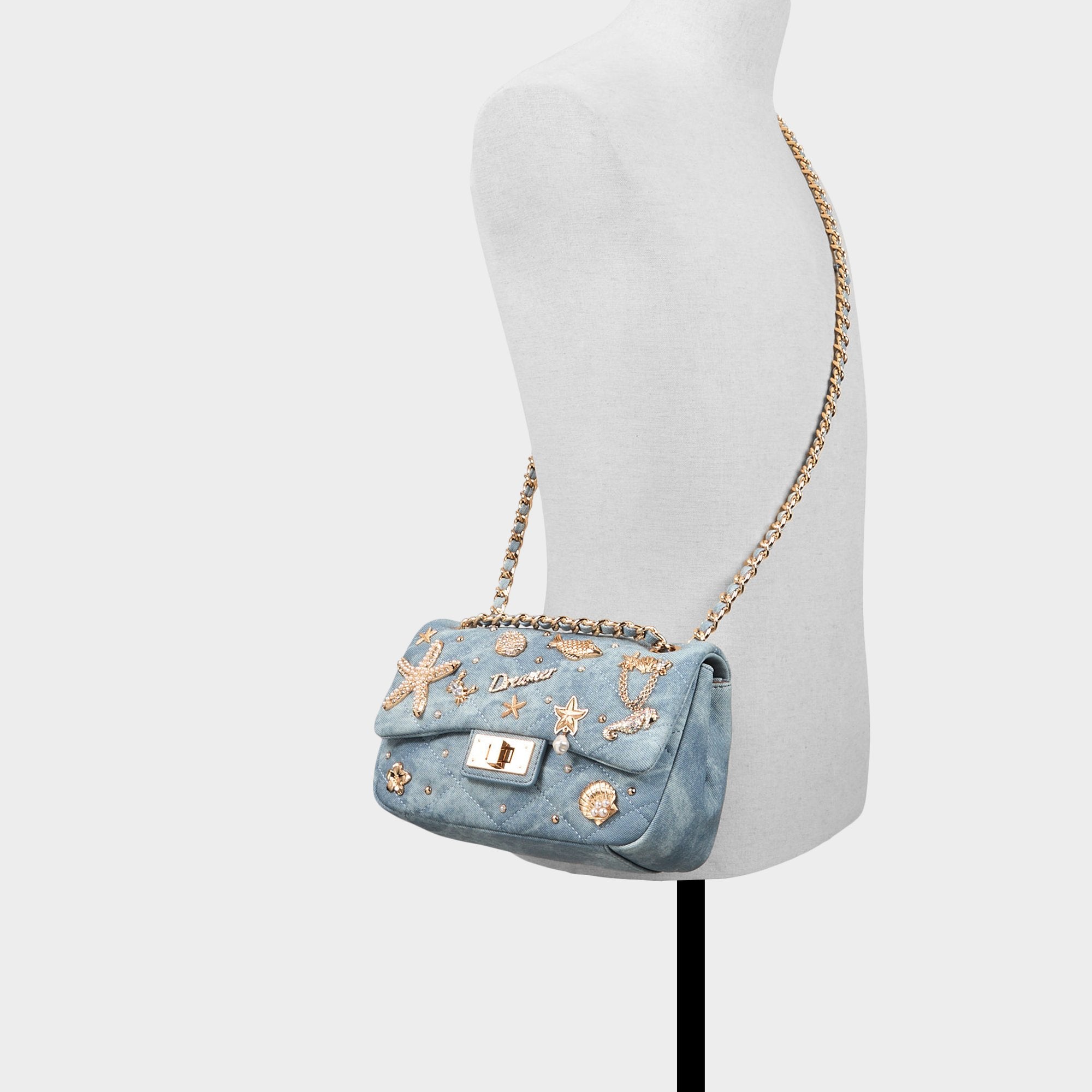 Scattered with glimmering starfish, shells and pearl-touched charms, this ocean-dream shoulder bag teams sun-washed recycled denim with a gleaming turn-lock and chain strap, bringing instant vacation energy to the everyday. Carry it with a slip dress for rooftop drinks or sling it over cargo shorts at weekend markets to polish the look.