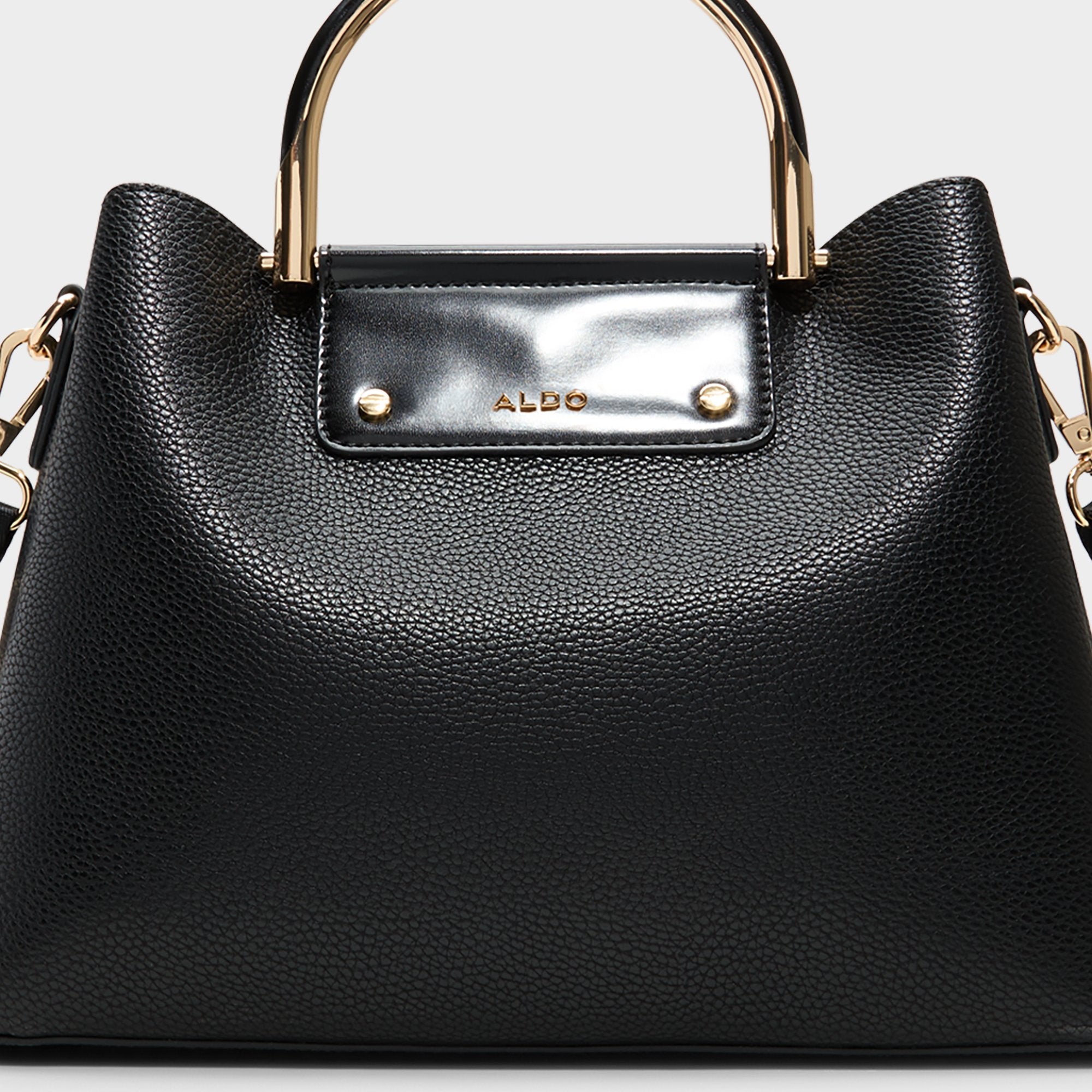 Curved gold handles arch over pebbled black leather, and a detachable strap snaps on when caffeine runs demand hands-free ease, flipping this structured top handle into a sleek crossbody in seconds. Carry it with a blazer and trousers for presentations, or sling it over weekend knits and denim to pull everything together.