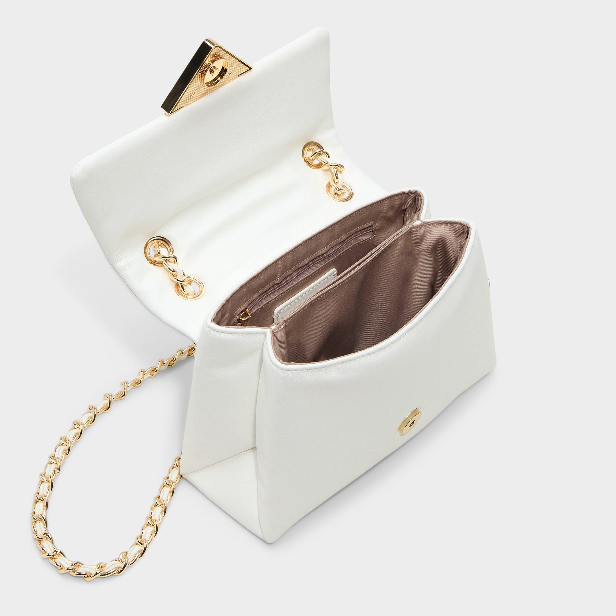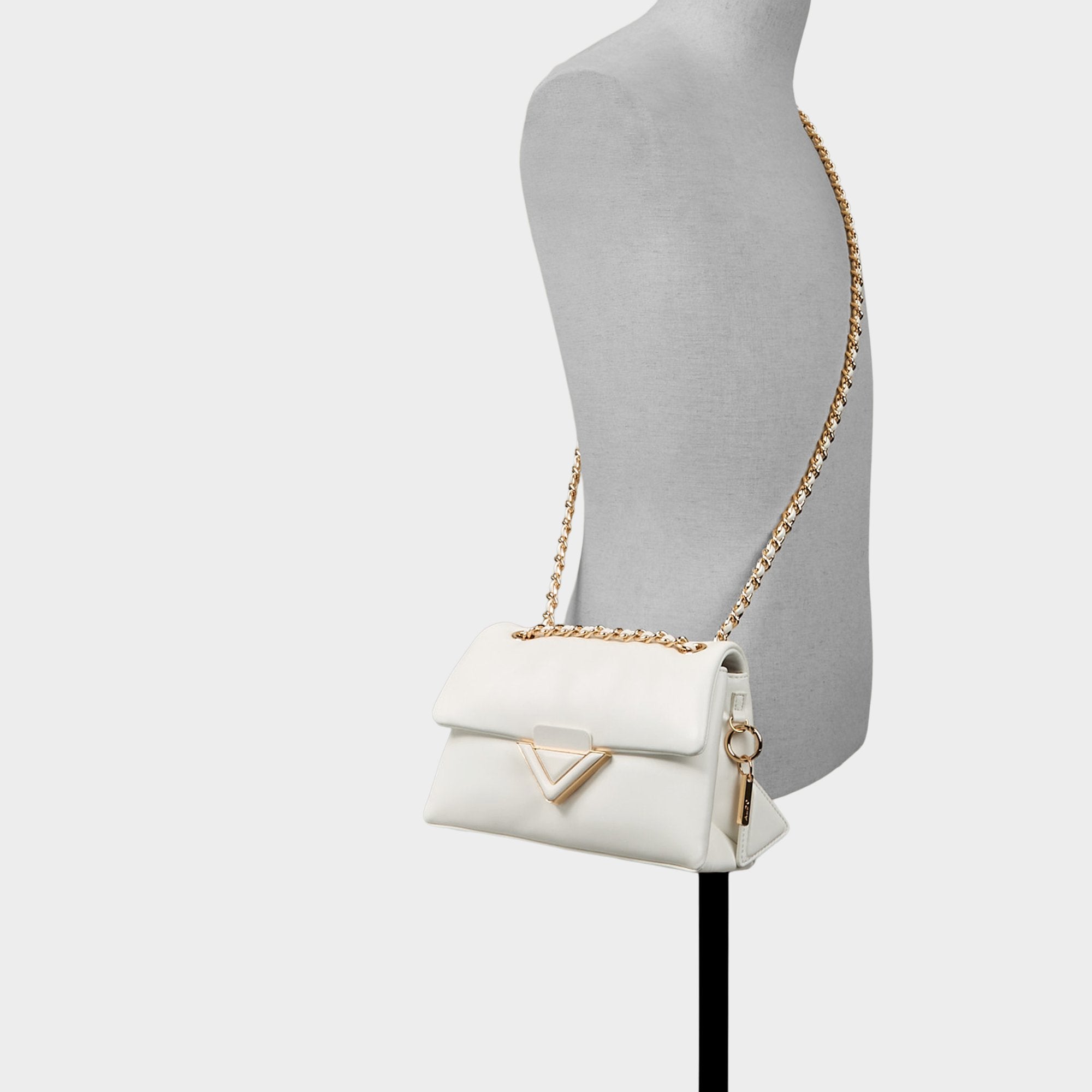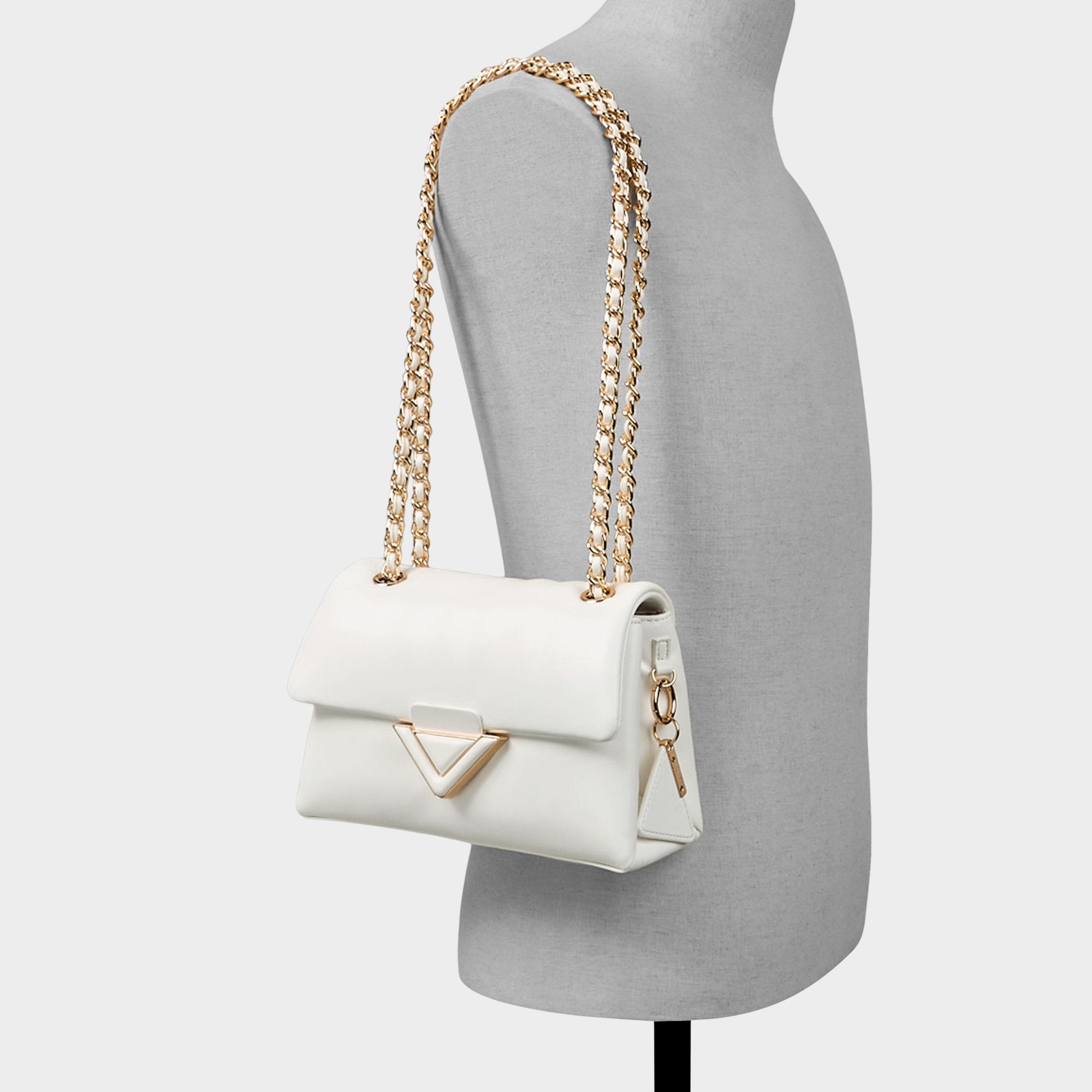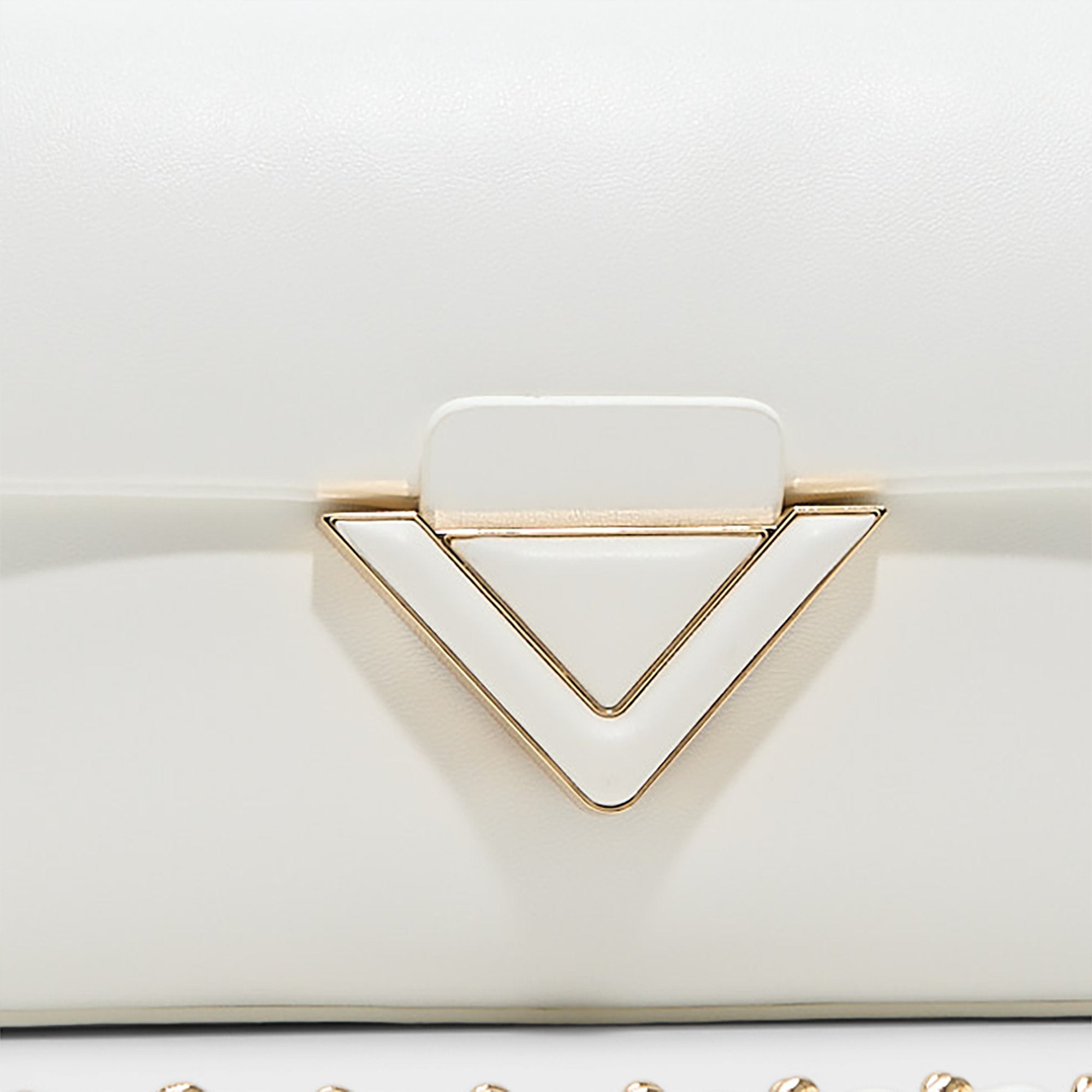 Cloud-soft leather folds into neat mini form with plush puff finish edged by sleek V-shaped gold clasp that snaps shut satisfyingly as gleaming rope-link chain keeps sophistication ready. Carry it with floral midi for garden brunches or sling over blazer-jeans combos at gallery hops sealing each outfit quietly luxe.