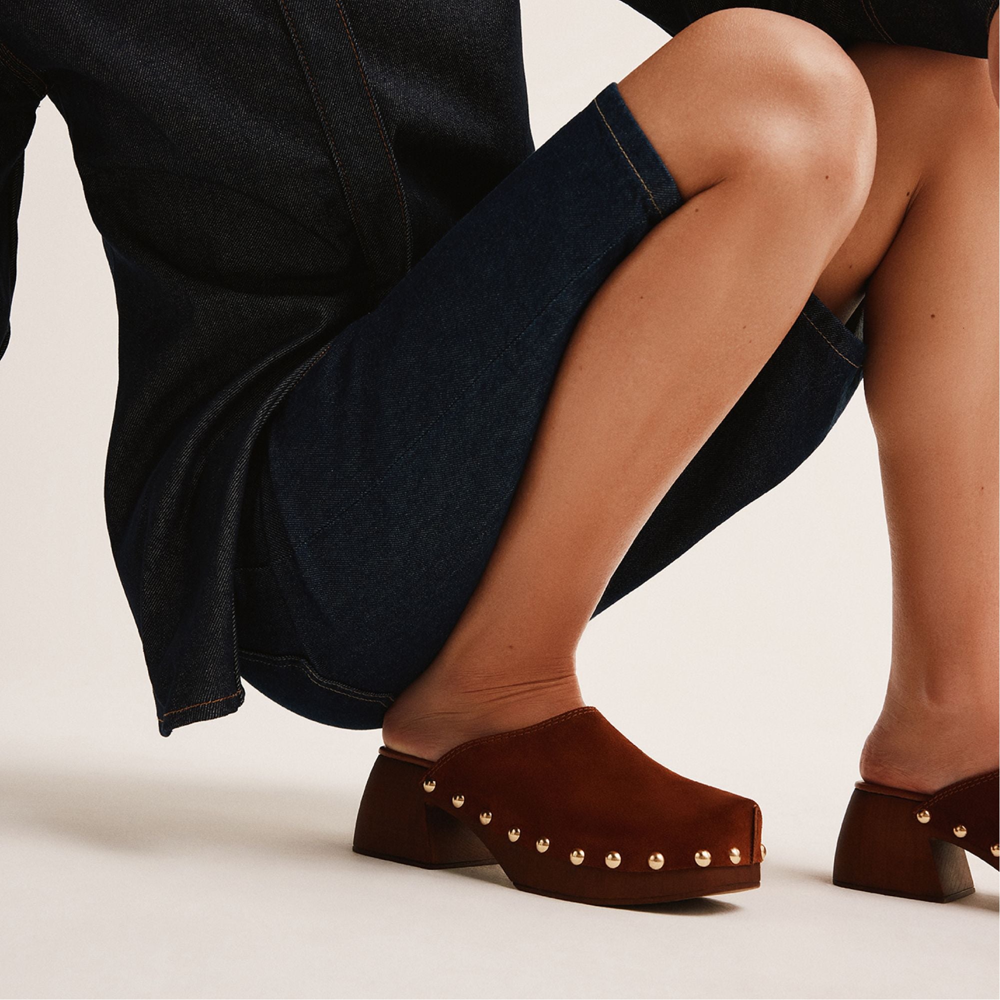 Soft suede drapes a sculptural wood clog sole crowned with gleaming studs, while a cushioned insole keeps city errands light, making every step feel balanced, grounded, and unexpectedly chic. Pair with cropped flares for coffee catch-ups, ground a prairie dress for easy festival days, or swap in linen separates to keep style effortless from dawn to dusk.